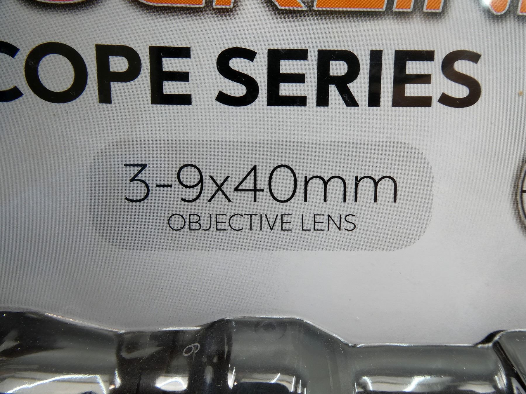 (1) CLEAR OPTICS, BDC DUPLEX RETICLE, 1" TUBE DIAMETER, WORKING MAGNIFICATION RING, WINDAGE & ELEVATION KNOBS TURN, MARKED "3-9 X 40", ETC., WITH ATTACHED RINGS & LENS COVERS IN ORIGINAL PACKAGING, SHOWS LIGHT WEAR & TEAR / USE MARKINGS. MAY REQUIRE FITTING. SEE PHOTOS.