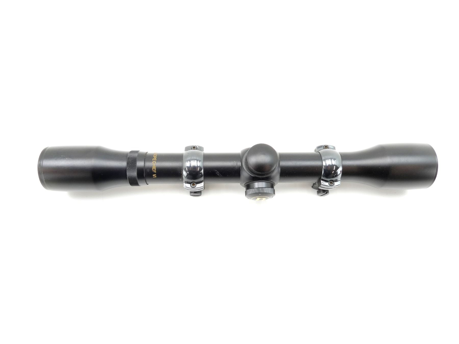 (1) CLEAR OPTICS, MULTI-X RETICLE, 1" TUBE DIAMETER, WORKING MAGNIFICATION RING, WINDAGE & ELEVATION KNOBS TURN, MARKED: "SCOPECHIEF VI", "BUSHNELL", "U278946", ETC., SHOWS WEAR & TEAR / USE MARKS, WITH 1" SCOPE RINGS ATTACHED. MAY REQUIRE FITTING. SEE PHOTOS.