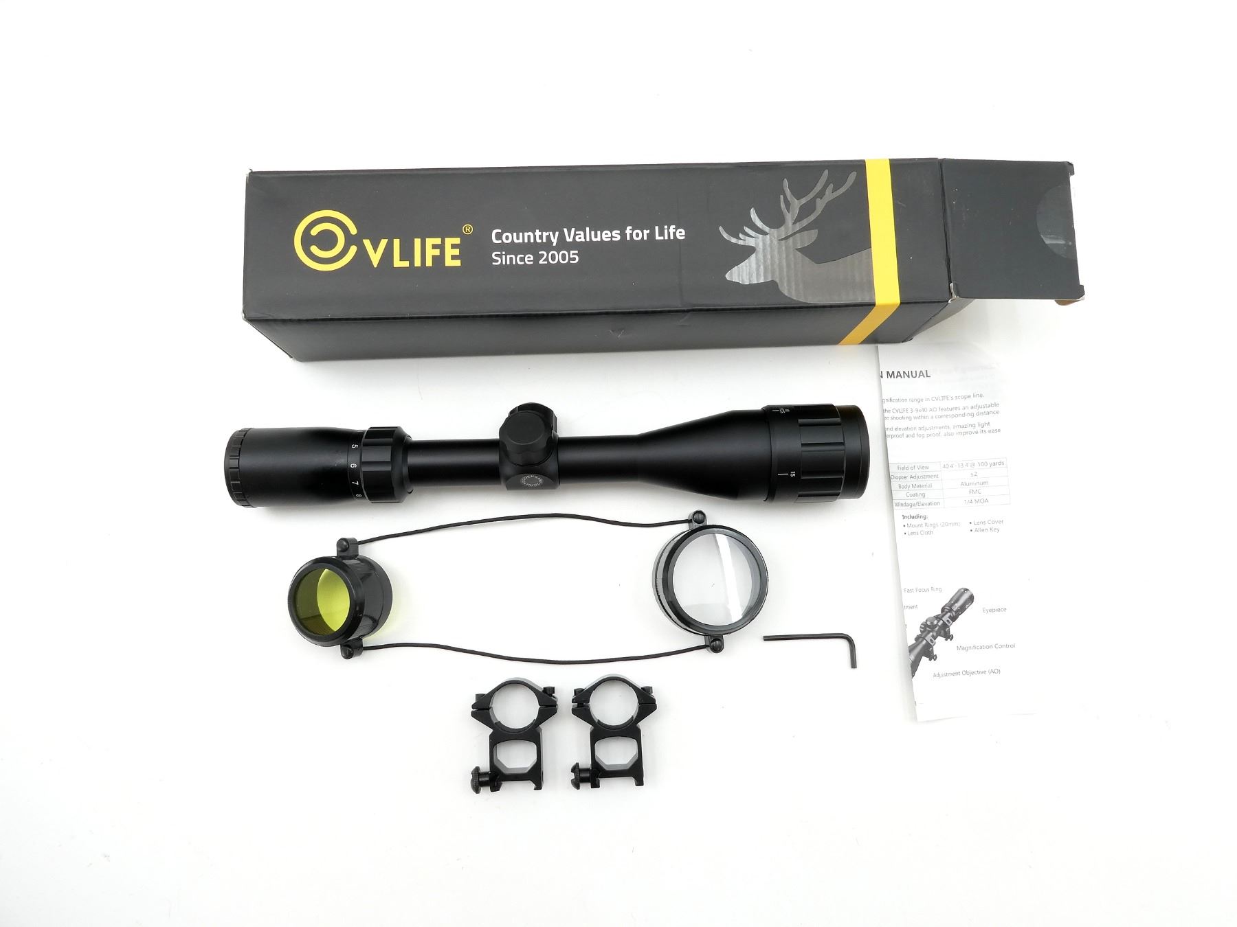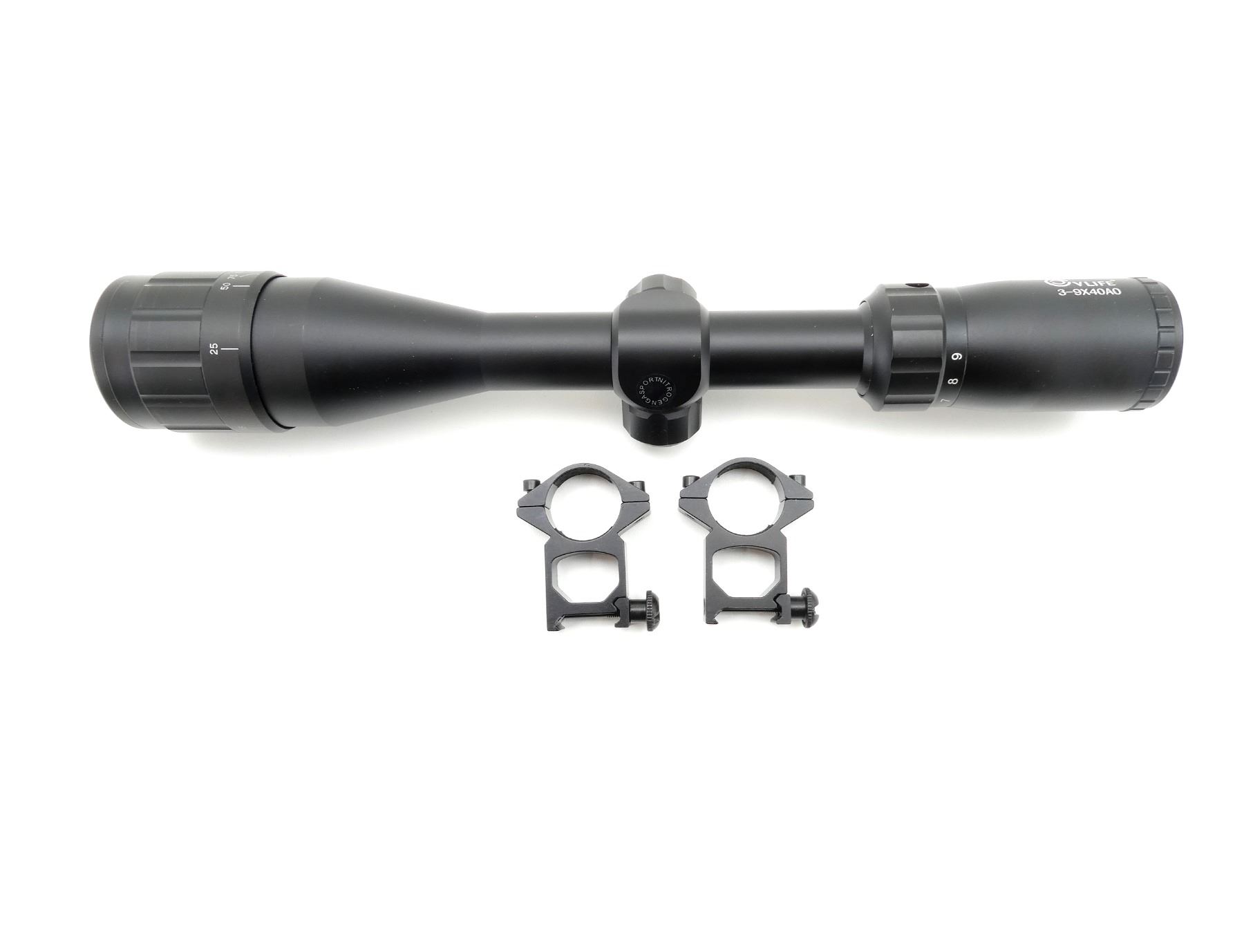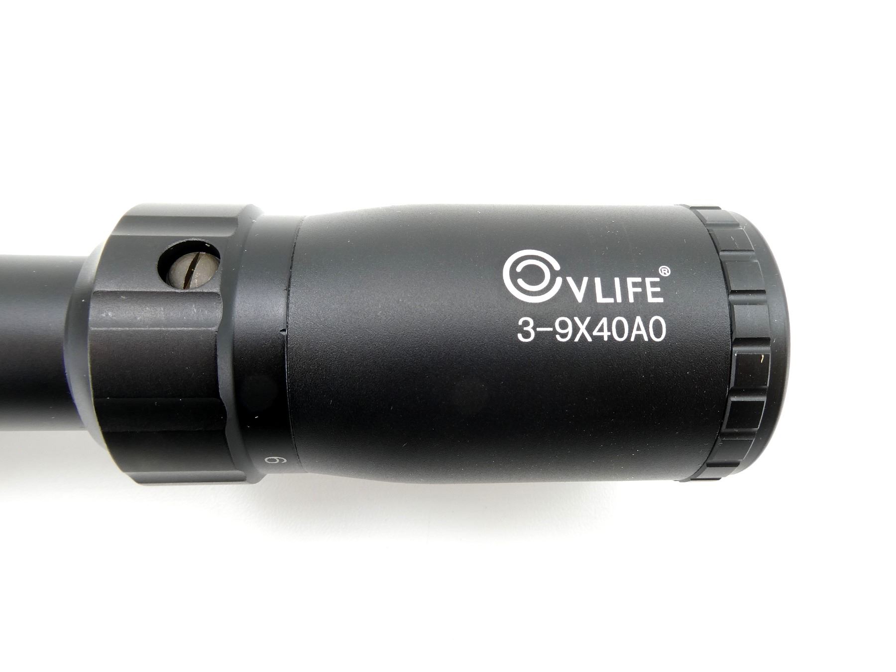 (1) CLEAR OPTICS, MULTI-FUNCTION RETICLE, 1" TUBE DIAMETER, WORKING MAGNIFICATION RING, WINDAGE & ELEVATION KNOBS TURN, MARKED: "VLIFE, 3-9X40 AO", ETC., SHOWS LIGHT WEAR & TEAR / USE MARKS, WITH 1" SCOPE RINGS, LENS COVERS, INSTRUCTIONS & ORIGINAL PACKAGING. MAY REQUIRE FITTING. SEE PHOTOS.
