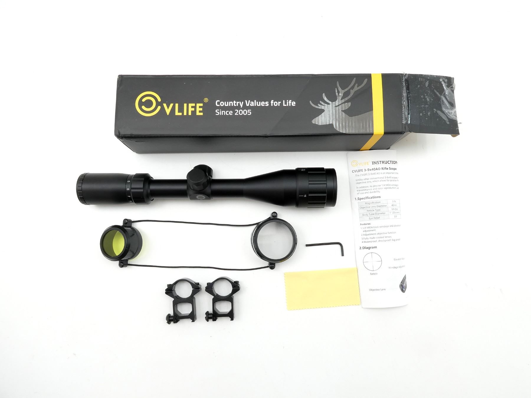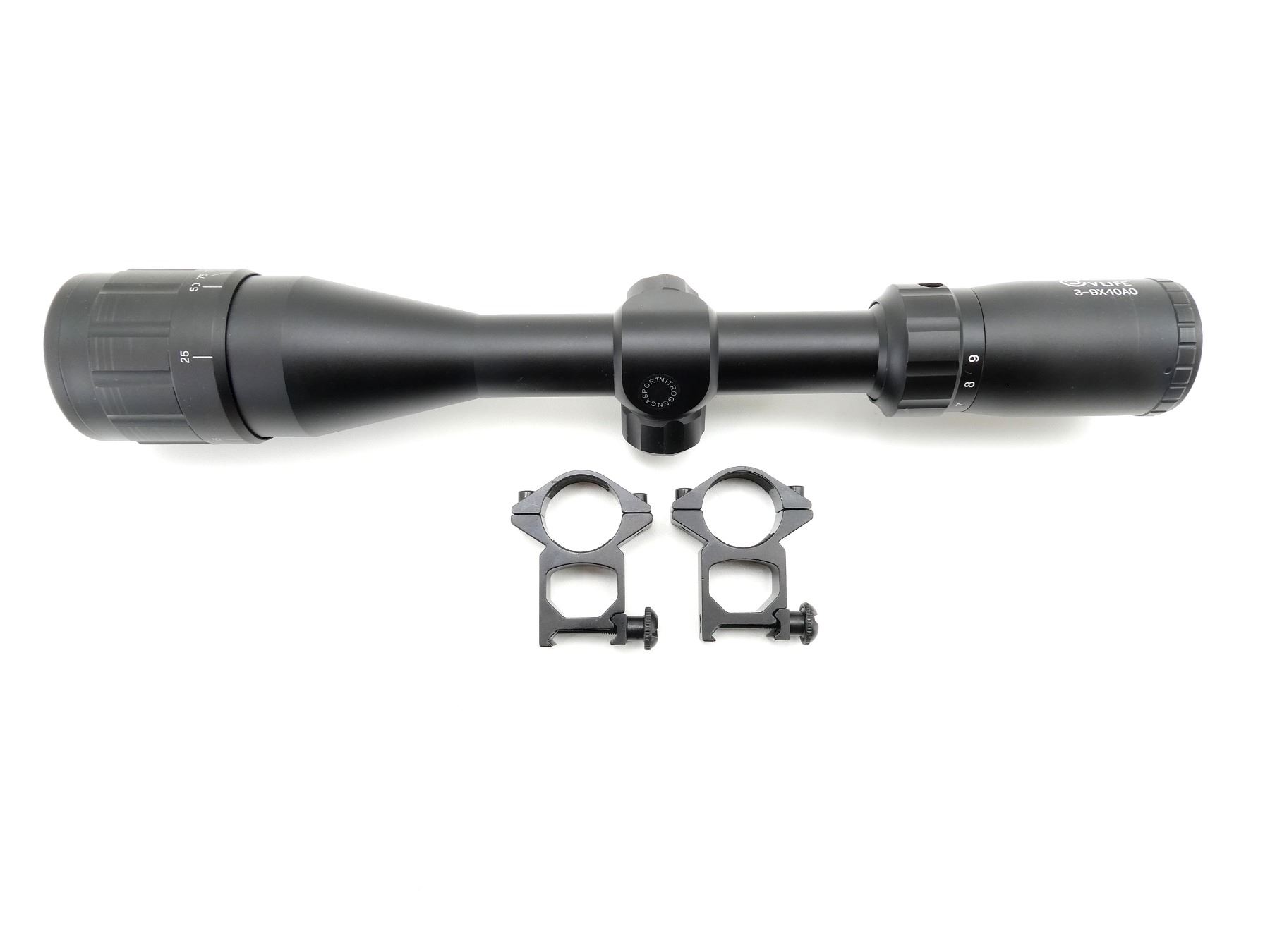 (1) CLEAR OPTICS, MULTI-FUNCTION RETICLE, 1" TUBE DIAMETER, WORKING MAGNIFICATION RING, WINDAGE & ELEVATION KNOBS TURN, MARKED: "VLIFE, 3-9X40 AO", ETC., SHOWS LIGHT WEAR & TEAR / USE MARKS, WITH 1" SCOPE RINGS, LENS COVERS, INSTRUCTIONS & ORIGINAL PACKAGING. MAY REQUIRE FITTING. SEE PHOTOS.