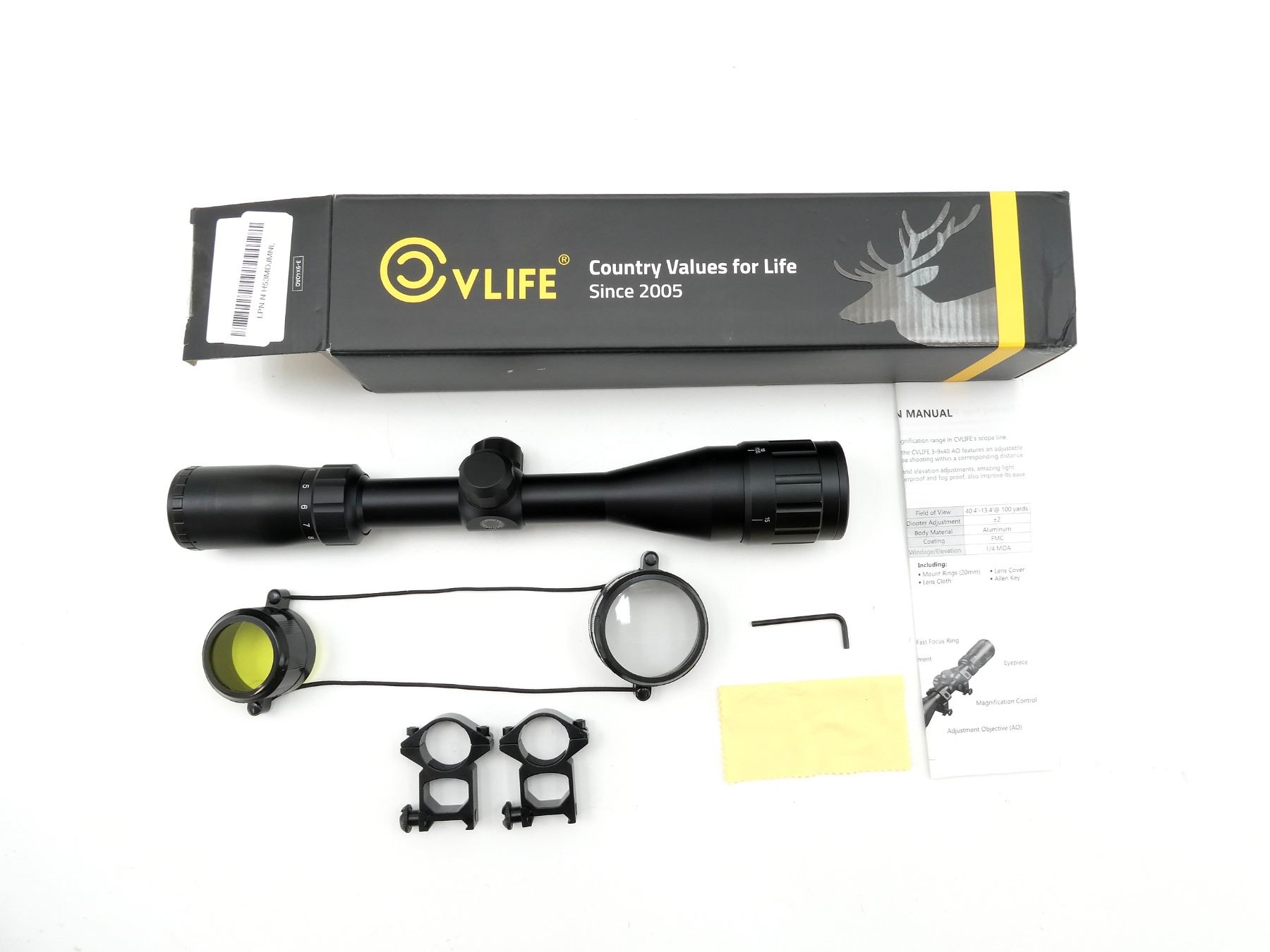 (1) CLEAR OPTICS, MULTI-FUNCTION RETICLE, 1" TUBE DIAMETER, WORKING MAGNIFICATION RING, WINDAGE & ELEVATION KNOBS TURN, MARKED: "VLIFE, 3-9X40 AO", ETC., SHOWS LIGHT WEAR & TEAR / USE MARKS, WITH 1" SCOPE RINGS, LENS COVERS, INSTRUCTIONS & ORIGINAL PACKAGING. MAY REQUIRE FITTING. SEE PHOTOS.