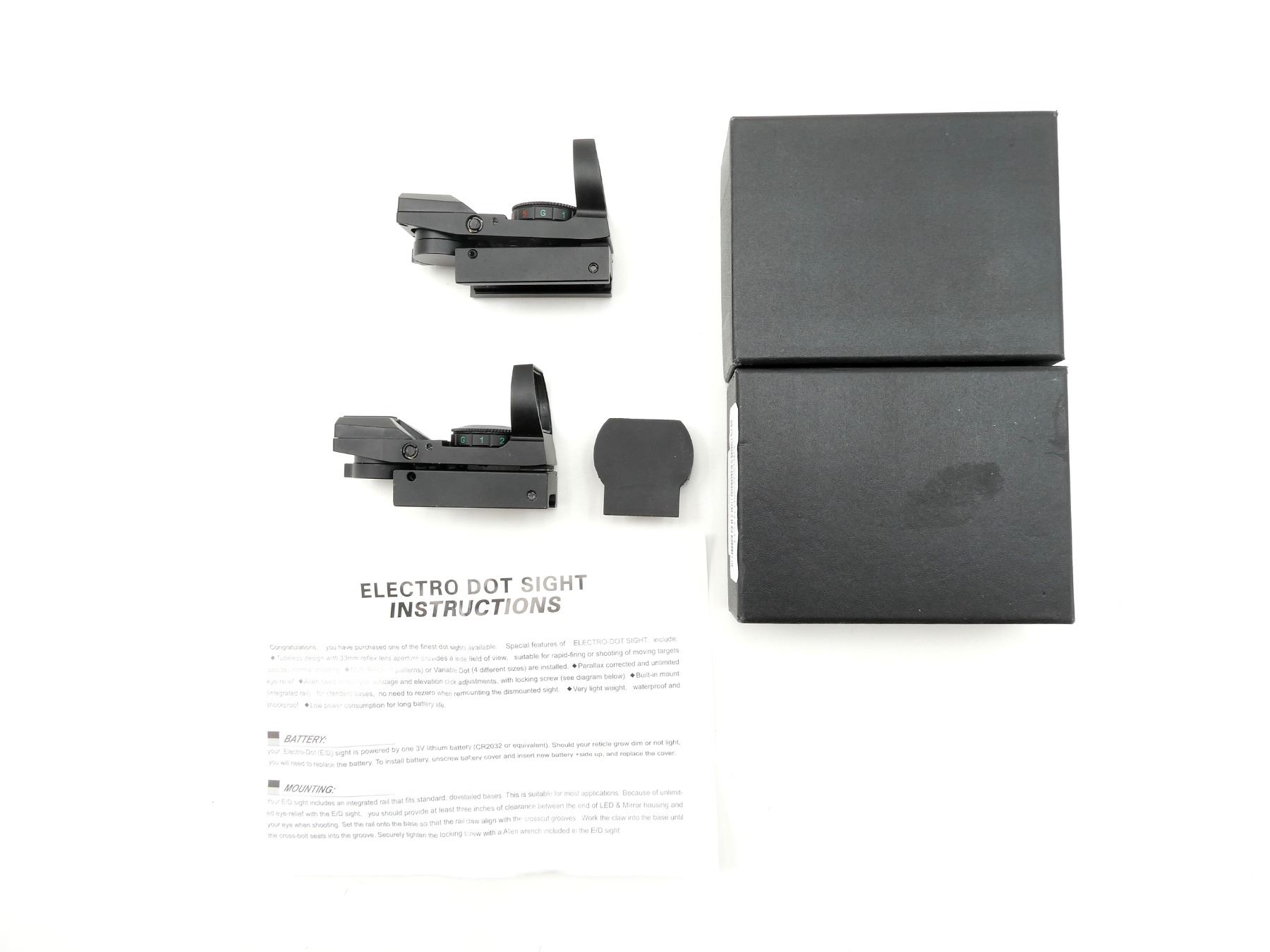 LOT INCLUDES; (2) RED / GREEN DOT SIGHT, CLEAR OPTICS, UNTESTED RED / GREEN DOT RETICLE, WITH VARIOUS BRIGHTNESS SETTINGS, 29MM DIAMETER, WINDAGE & ELEVATION KNOBS TURN, SHOWS LIGHT WEAR & TEAR / USE MARKS, WITH MOUNTING BASE, INSTRUCTIONS & ORIGINAL PACKAGING. MAY REQUIRE FITTING. SEE PHOTOS.