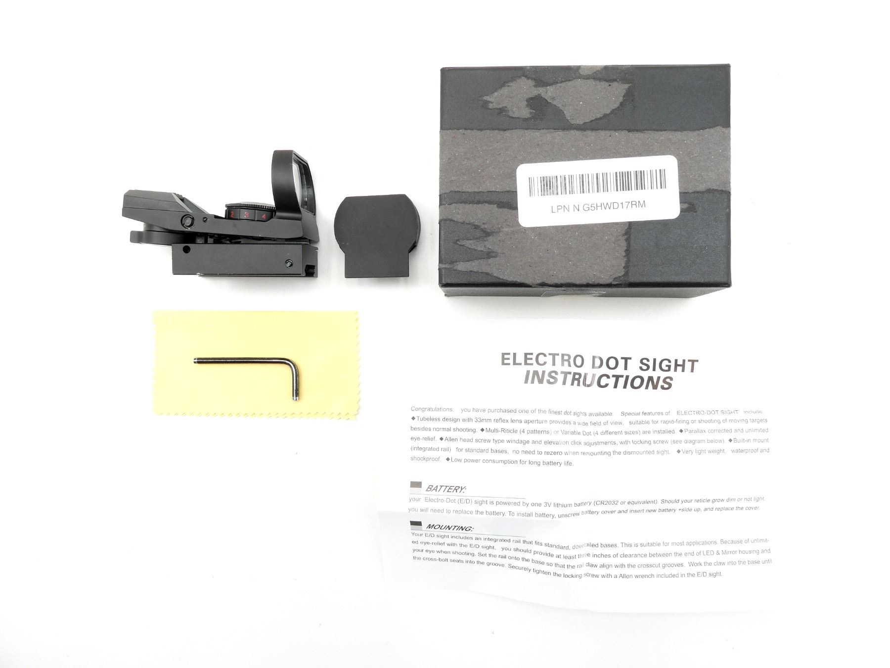 LOT INCLUDES; (2) RED / GREEN DOT SIGHT, CLEAR OPTICS, UNTESTED RED / GREEN DOT RETICLE, WITH VARIOUS BRIGHTNESS SETTINGS, 29MM DIAMETER, WINDAGE & ELEVATION KNOBS TURN, SHOWS LIGHT WEAR & TEAR / USE MARKS, WITH MOUNTING BASE, INSTRUCTIONS & ORIGINAL PACKAGING. MAY REQUIRE FITTING. SEE PHOTOS.