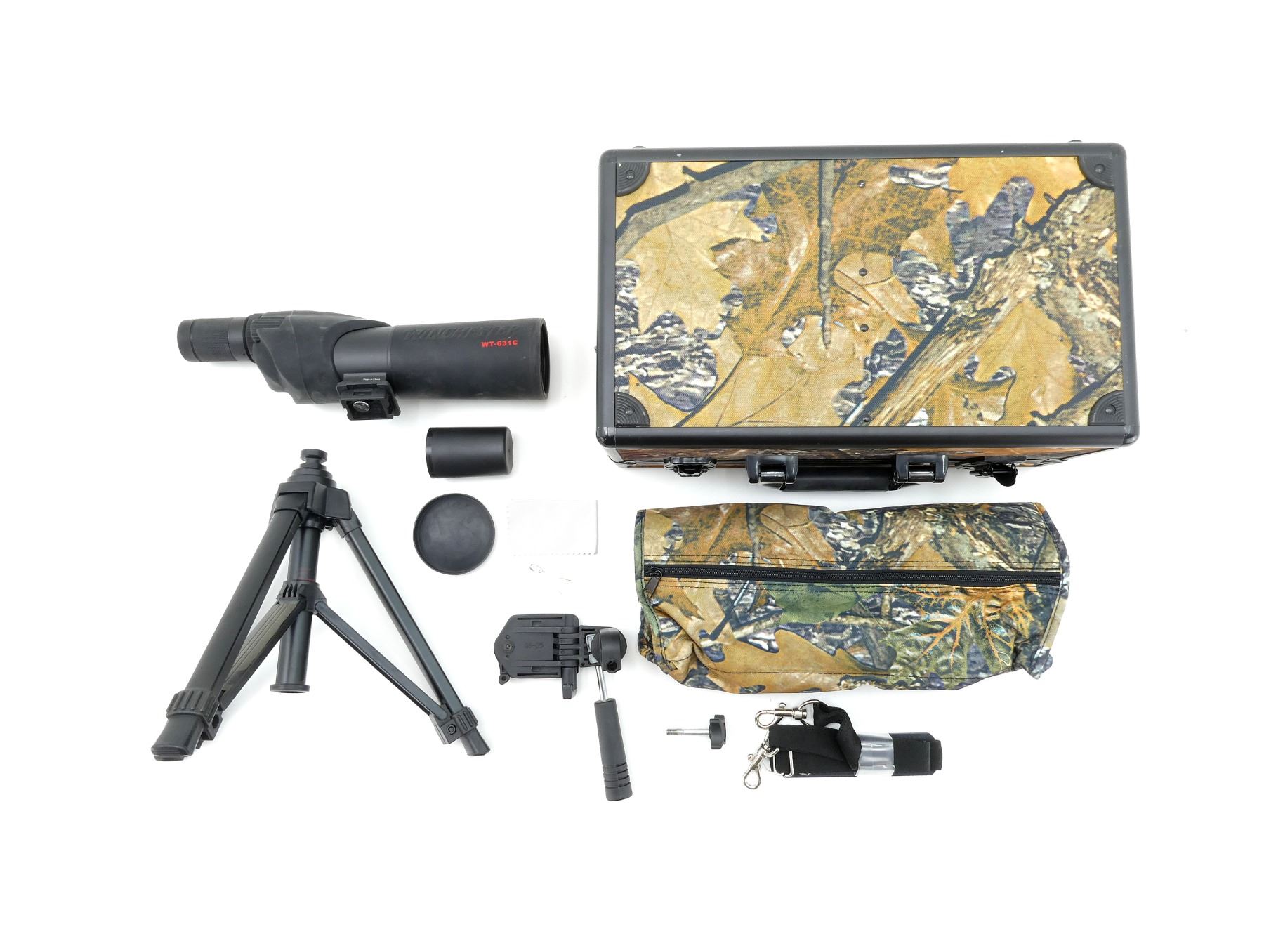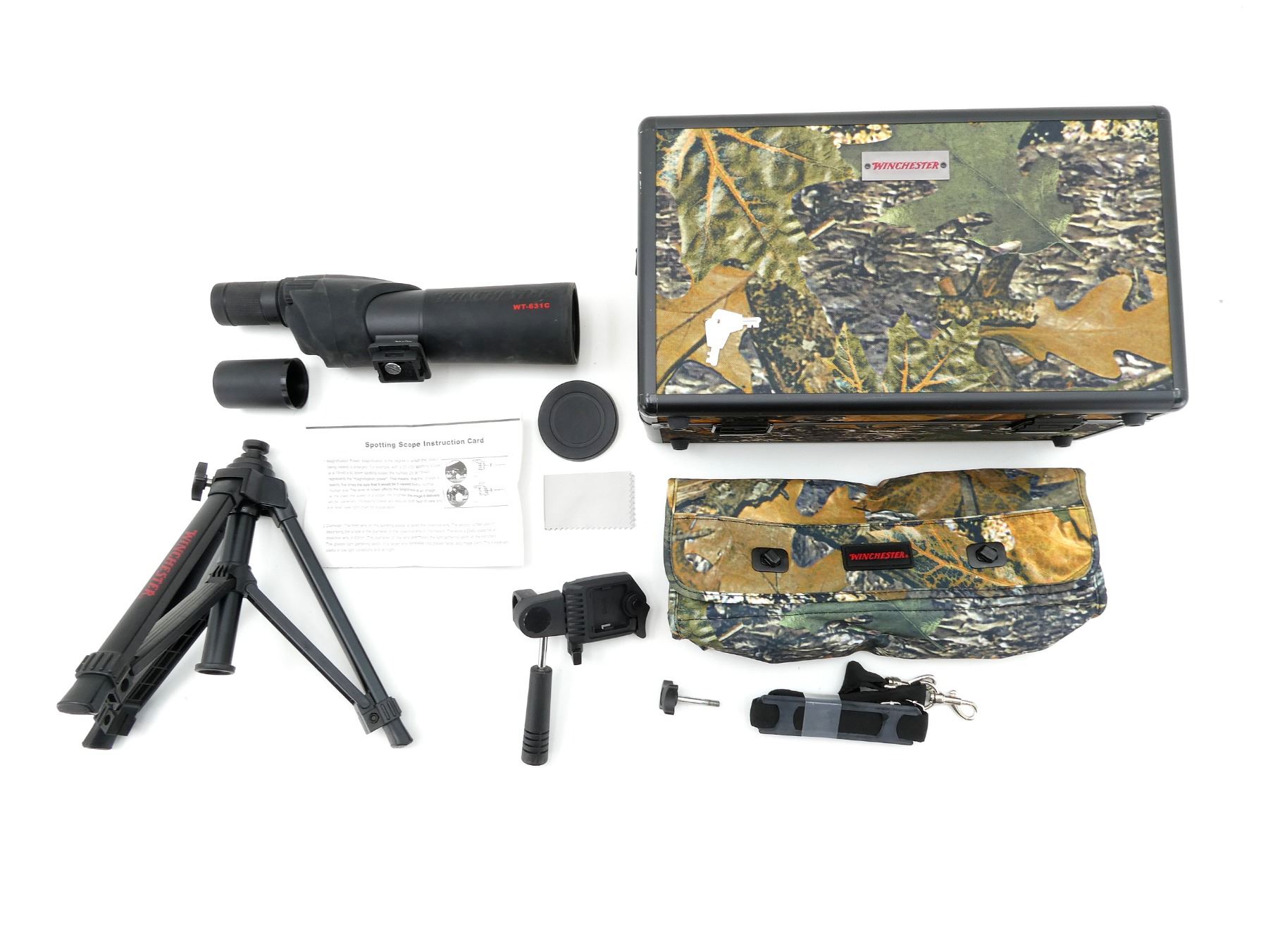 LOT INCLUDES; (1) WINCHESTER SPOTTING SCOPE, CLEAR OPTICS, WORKING ZOOM FUNCTION, MARKED "WT-631C", ETC., WITH LENS COVERS, SHOWS LIGHT WEAR & TEAR / USE MARKS, OVERALL LENGTH APPROX. 13.5", (1) WINCHESTER TRIPOD, POLYMER CONSTRUCTION, OVERALL LENGTH APPROX. 12" & (1) WINCHESTER CAMO CARRY CASE, CLIP CLOSURE, WITH CARRY HANDLE, ETC., OVERALL LENGTH APPROX. 15.5" X 9" X 7.25". SEE PHOTOS.