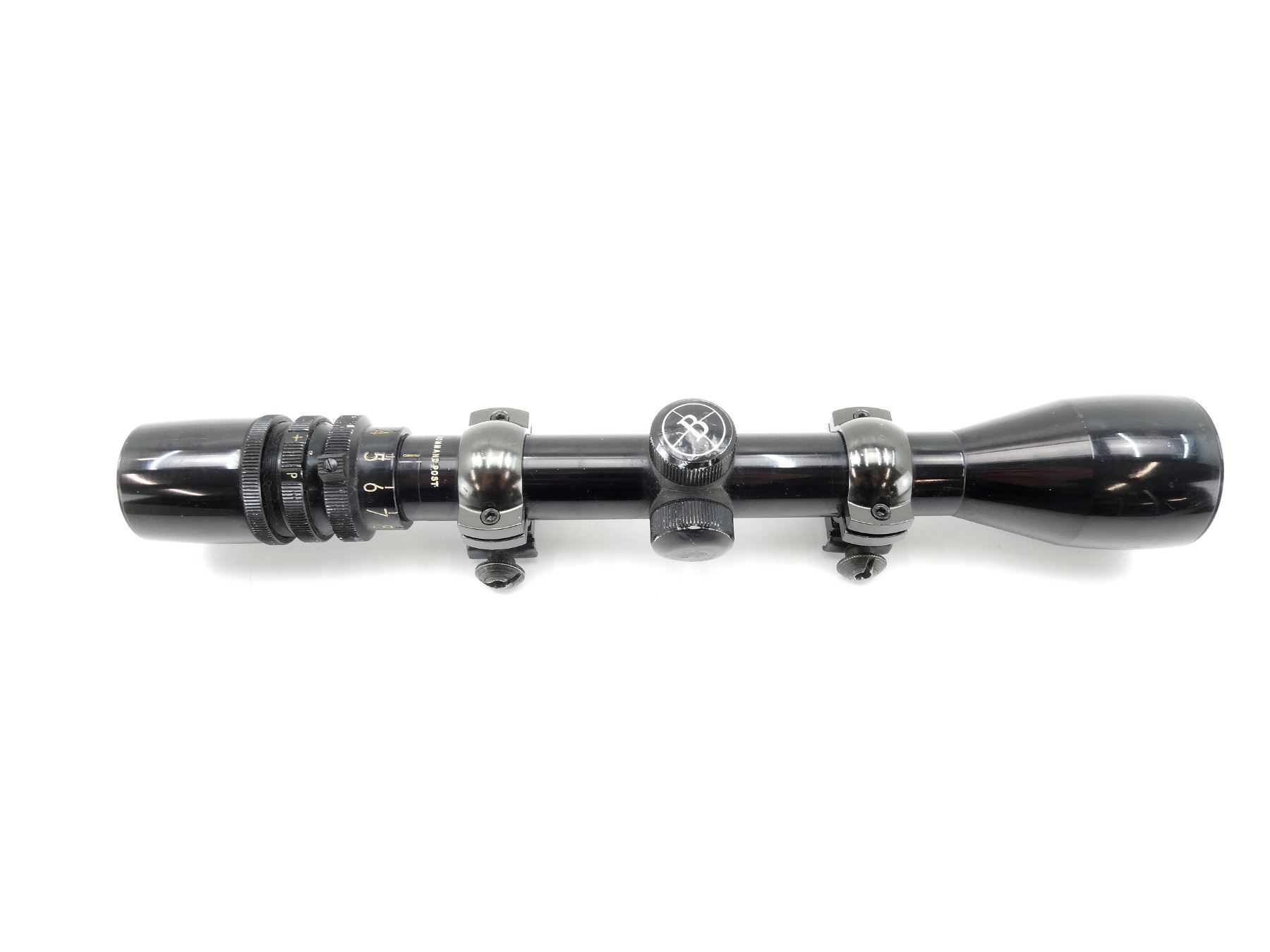 (1) CLEAR OPTICS, DUPLEX RETICLE, 1" TUBE DIAMETER, WITH COMMAND POST, WORKING MAGNIFICATION RING, WINDAGE & ELEVATION KNOBS TURN, MARKED: "BUSHNELL SCOPECHIEF IV 3-9X", ETC., SHOWS SOME WEAR & TEAR / USE MARKS, WITH 1" SCOPE RINGS ATTACHED. MAY REQUIRE FITTING. SEE PHOTOS.