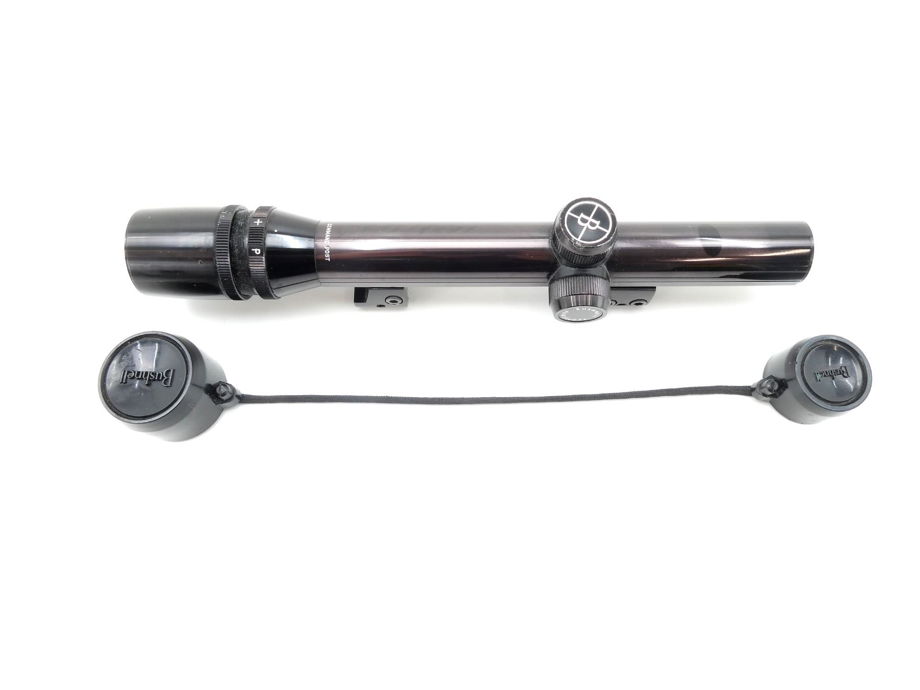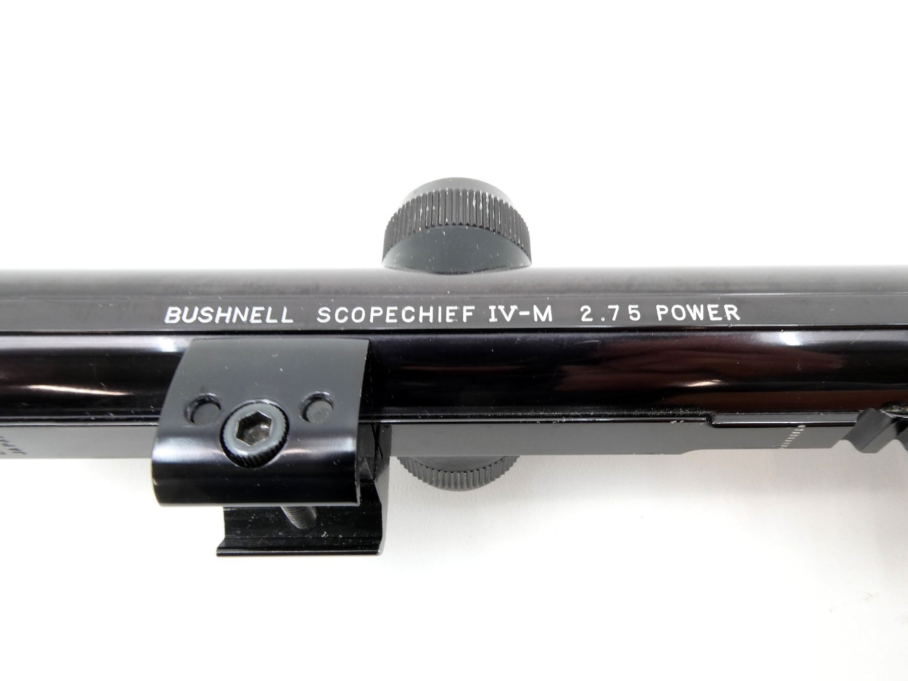 (1) CLEAR OPTICS, DUPLEX RETICLE, 1" TUBE DIAMETER, WITH COMMAND POST, WORKING MAGNIFICATION RING, WINDAGE & ELEVATION KNOBS TURN, MARKED: "BUSHNELL SCOPECHIEF IV-M 2.75 POWER", ETC., SHOWS SOME WEAR & TEAR / USE MARKS, WITH SCOPE BASES ATTACHED & LENS COVERS. MAY REQUIRE FITTING. SEE PHOTOS.