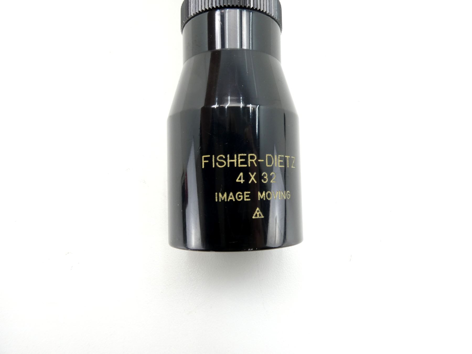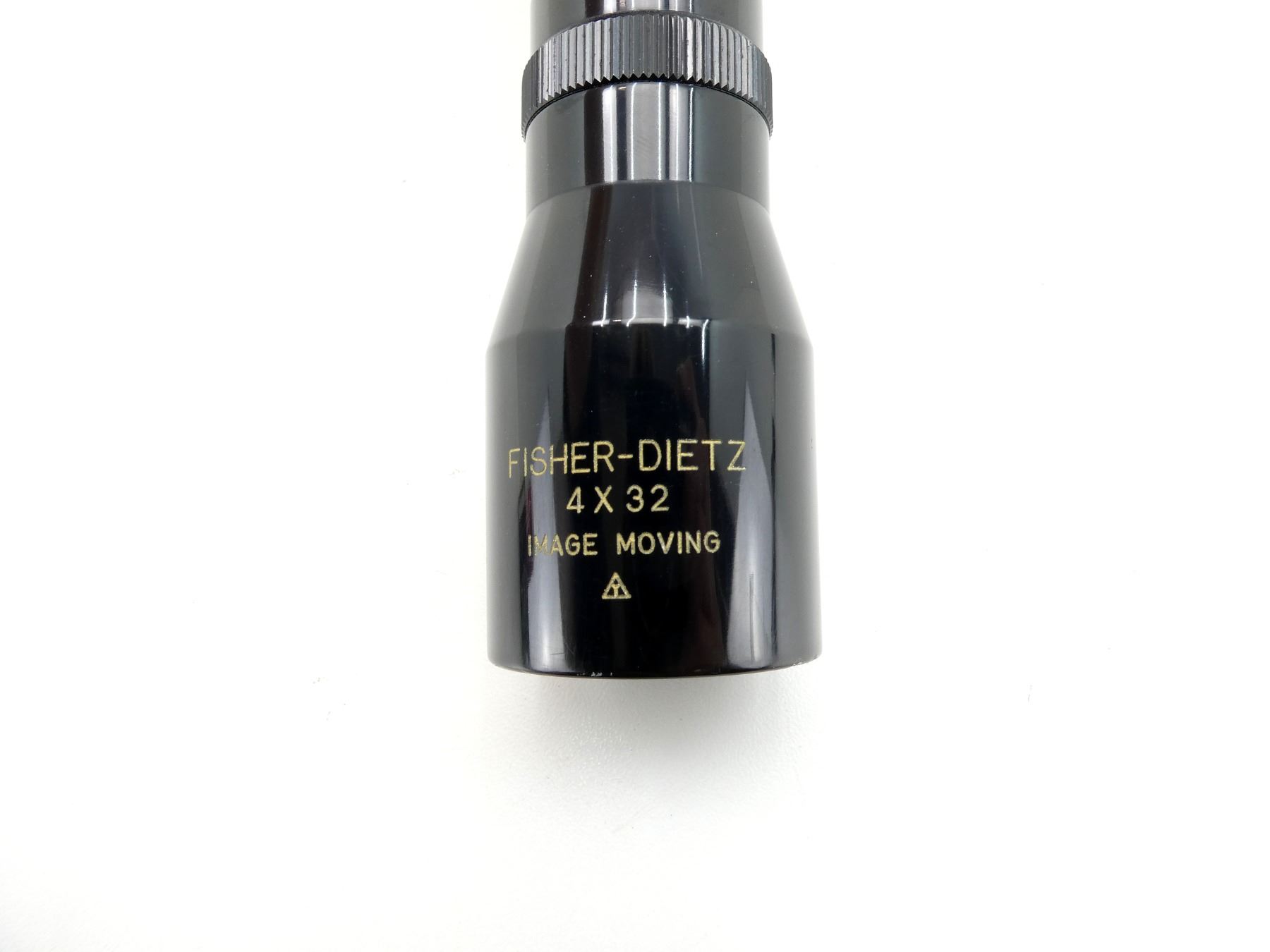 (1) CLEAR OPTICS, DUPLEX RETICLE, 1" TUBE DIAMETER, WORKING MAGNIFICATION RING, WINDAGE & ELEVATION KNOBS TURN, MARKED: "FISHER-DIETZ, 4X32, IMAGE MOVING", ETC., SHOWS SOME WEAR & TEAR / USE MARKS, WITH 1" WEAVER SCOPE RINGS ATTACHED. MAY REQUIRE FITTING. SEE PHOTOS.