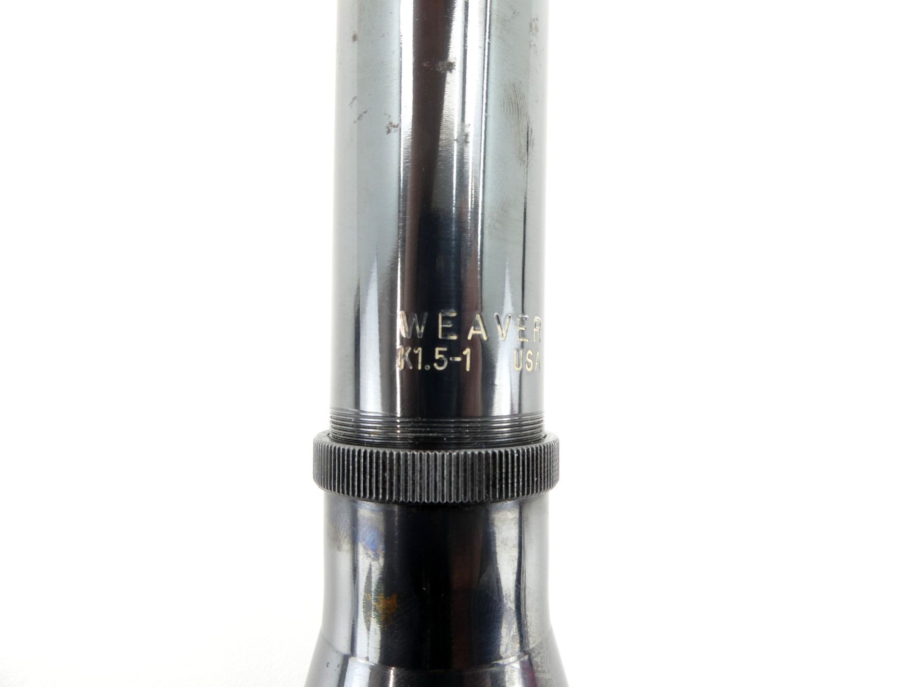 (1) CLEAR OPTICS, EL PASO DUPLEX RETICLE, 1" TUBE DIAMETER, WORKING MAGNIFICATION RING, WINDAGE & ELEVATION KNOBS TURN, MARKED: "WEAVER K1.5-1", ETC., SHOWS SOME WEAR & TEAR / USE MARKS. MAY REQUIRE FITTING. SEE PHOTOS.