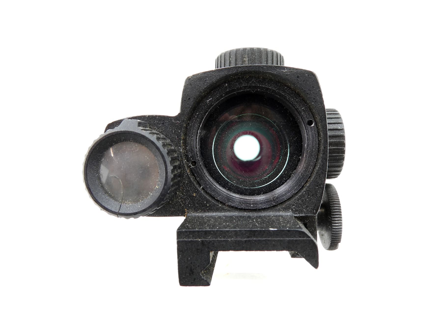 (1) RED DOT SIGHT, CLEAR OPTICS, UNTESTED RED DOT RETICLE, WITH VARIOUS BRIGHTNESS SETTINGS, MOUNTS ON WEAVER STYLE RAIL, WINDAGE & ELEVATION KNOBS TURN, SHOW SWEAR & TEAR / USE MARKS. MAY REQUIRE FITTING. SEE PHOTOS.