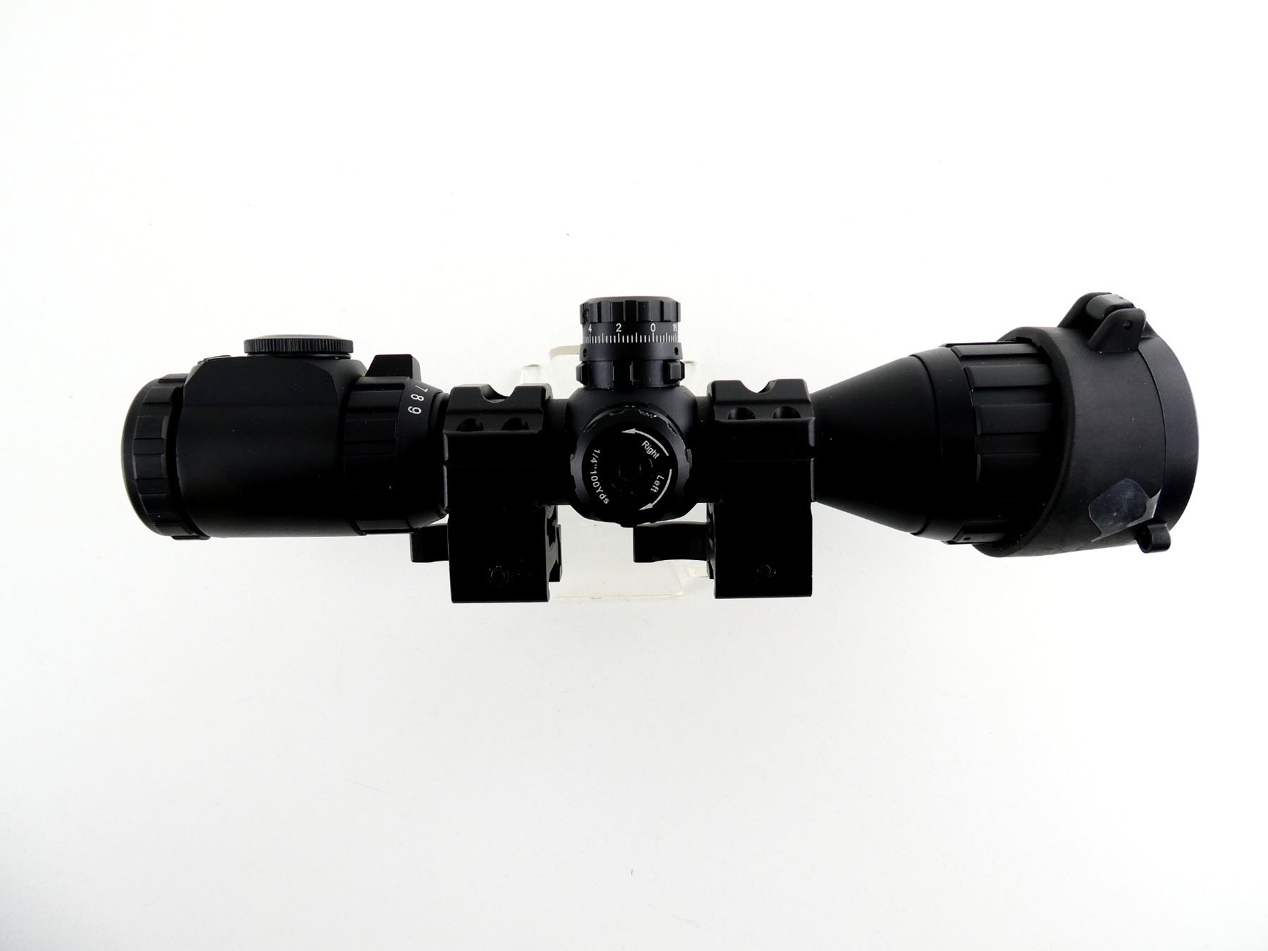 (1) CLEAR OPTICS, MIL-DOT RETICLE, WORKING RED / GREEN ILLUMINATION, 1" TUBE DIAMETER, WORKING MAGNIFICATION RING, WINDAGE & ELEVATION KNOBS TURN, MARKED: "U13-030489", ETC., SHOWS WEAR & TEAR / USE MARKS, WITH SCOPE RINGS ATTACHED & SINGLE LENS COVER. MAY REQUIRE FITTING. SEE PHOTOS.