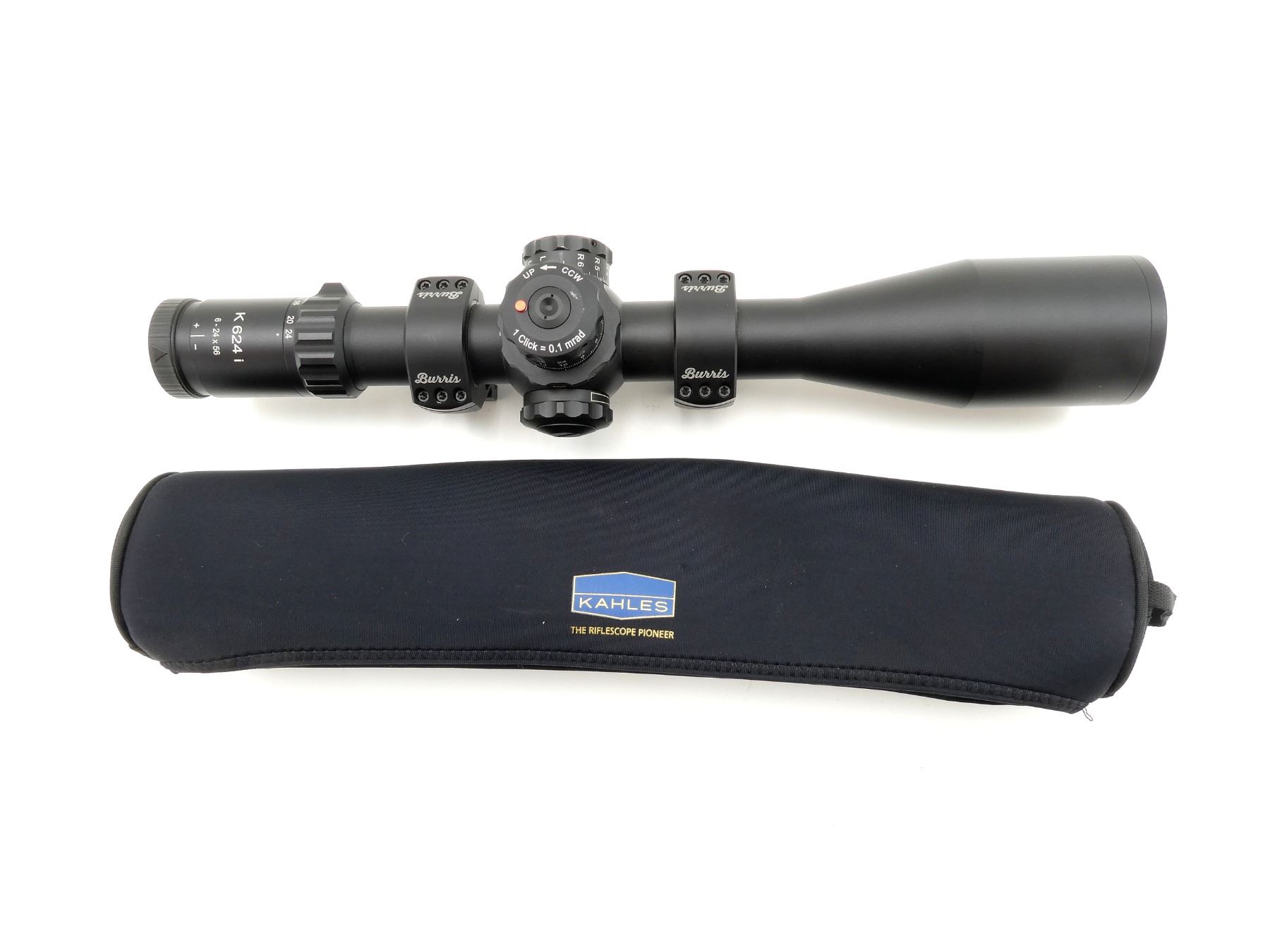 (1) CLEAR OPTICS, AMR ILLUMINATED (WORKS) RETICLE, 34MM TUBE DIAMETER, WORKING MAGNIFICATION RING, WINDAGE & ELEVATION KNOBS TURN, MARKED: "KAHLES", "K624 i, 6-24X56", ETC., WITH SCOPE COVER & 34MM BURRIS SCOPE RINGS ATTACHED, SHOWS LIGHT WEAR & TEAR / USE MARKINGS. MAY REQUIRE FITTING. SEE PHOTOS.