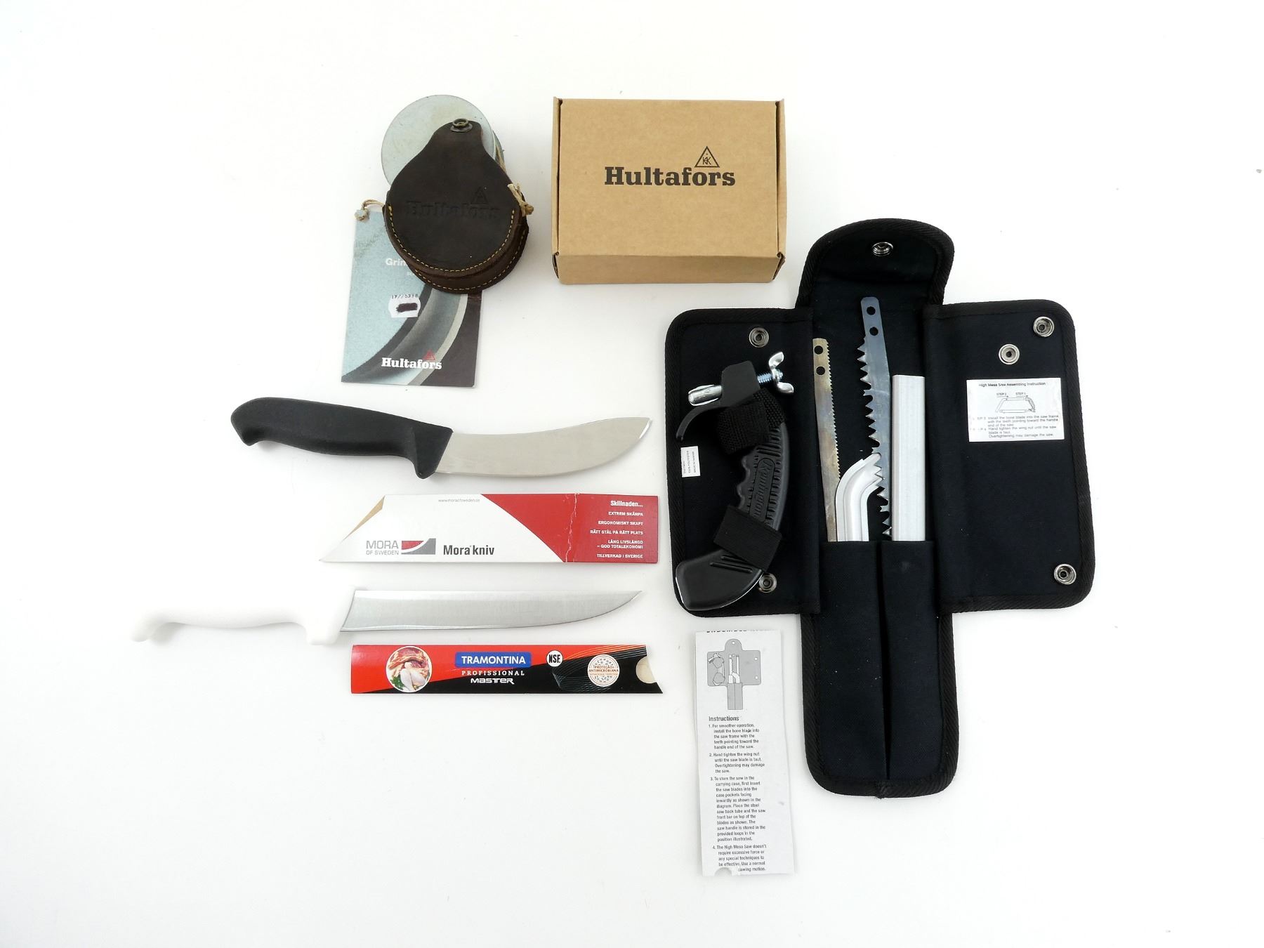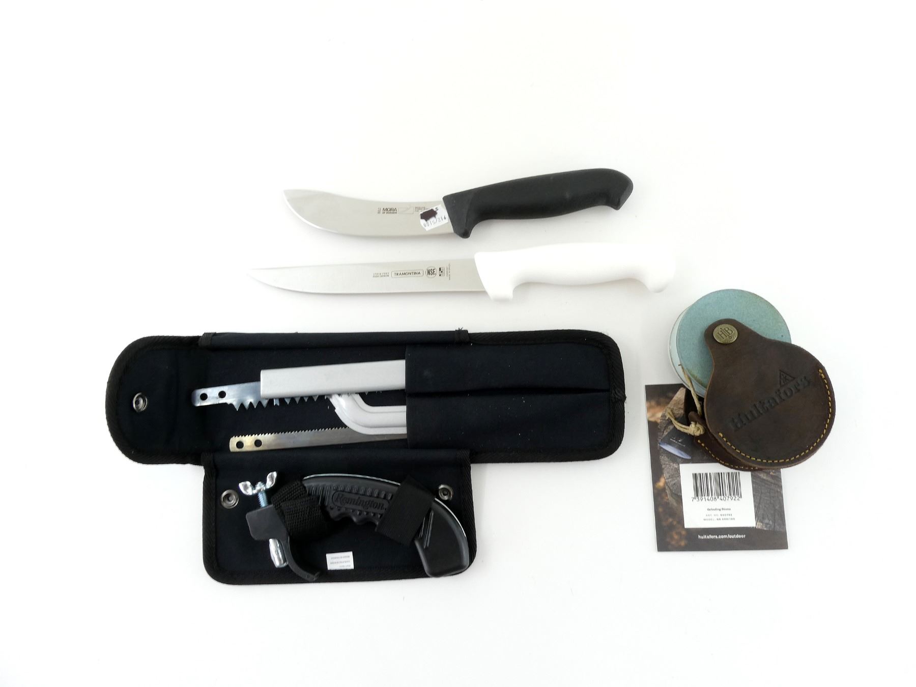 LOT INCLUDES; (1) TRAMONTINA KNIFE, STEEL BLADE, BLADE MARKED "24605/087", ETC., WHITE POLYMER HANDLE, UNMARKED, SHOWS LIGHT WEAR & TEAR / USE MARKS, BLADE OVERALL LENGTH APPROX. 7.25", OVERALL LENGTH APPROX. 12 7/8", WITH CARDBOARD SHEATH, (1) MORA KNIFE, STEEL BLADE, BLADE MARKED "SWEDISH STEEL", ETC., BLACK POLYMER HANDLE, UNMARKED, SHOWS LIGHT WEAR & TEAR / USE MARKS, BLADE OVERALL LENGTH APPROX. 5 1/8", OVERALL LENGTH APPROX. 10.75", WITH CARDBOARD SHEATH, (1) REMINGTON SAW, DECONSTRUCTED, WITH COMPACT CARRY CASE & (1) HULTAFORS GRINDING STONE, MODEL: GS 600/180, ITEM #: 840792, WITH LEATHER SHEATH. SEE PHOTOS.