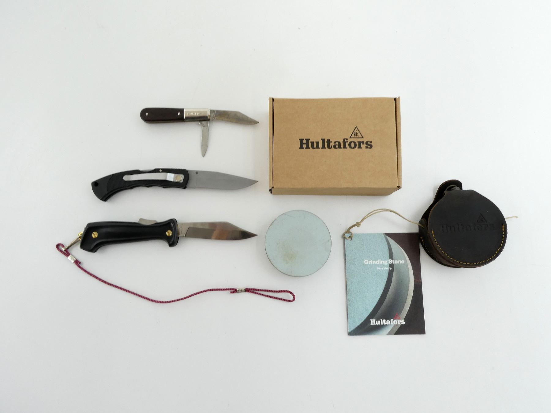 NORMARK, SCRIMSHAW AND BARLOW KNIVES WITH HULTAFORS GRINDING STONE LOT