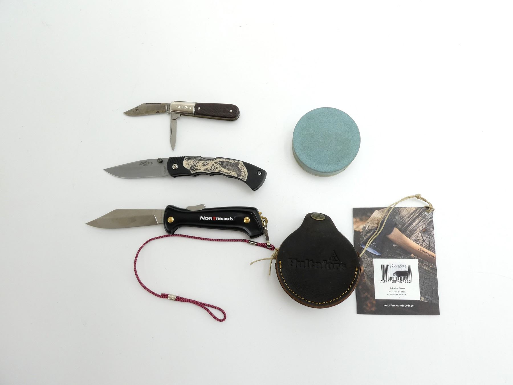 Lot 37018 NORMARK, SCRIMSHAW AND BARLOW KNIVES WITH HULTAFORS GRINDING STONE LOT