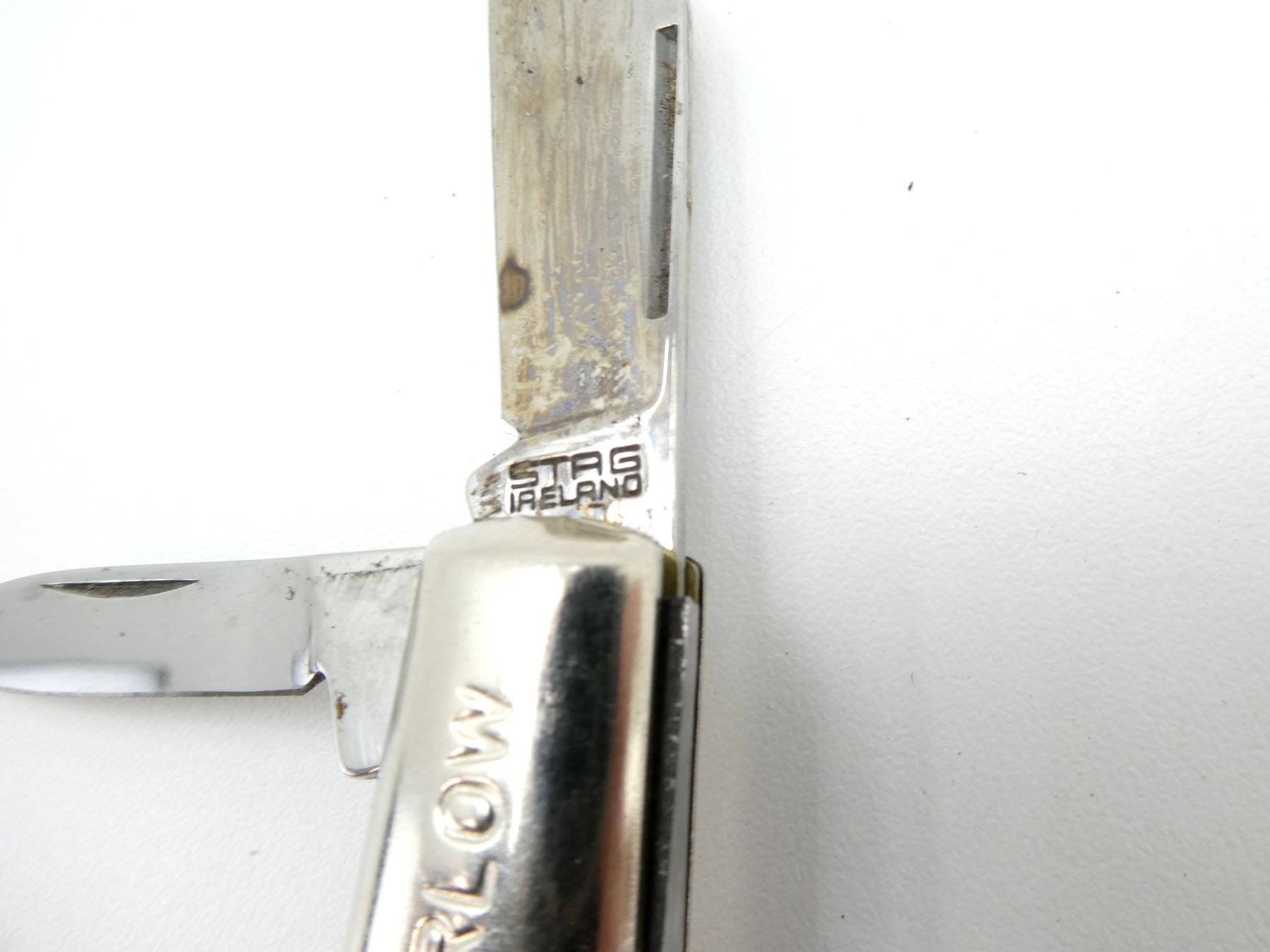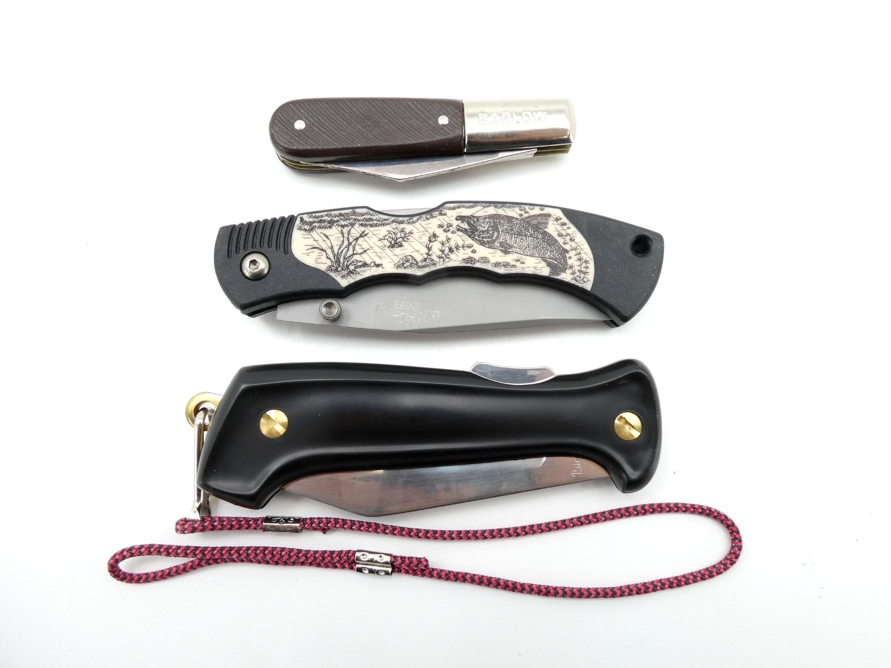 LOT INCLUDES; (1) NORMARK FOLDING KNIFE, STEEL BLADE, BLADE MARKED "EKA SWEDEN", ETC., BLACK POLYMER HANDLE, MARKED "NORMARK", SHOWS WEAR & TEAR / USE MARKS, BLADE OVERALL LENGTH APPROX. 3.75", OVERALL LENGTH APPROX. 8.25", (1) SCRIMSHAW FOLDING KNIFE, STEEL BLADE, BLADE MARKED "STAINLESS TAIWAN", ETC., BLACK POLYMER HANDLE WITH PICTURE OF UNDERWATER SCENE BY JAMES CHEN, SHOWS LIGHT WEAR & TEAR / USE MARKS, BLADE OVERALL LENGTH APPROX. 3.5", OVERALL LENGTH APPROX. 8", (1) BARLOW FOLDING KNIFE, WITH TWO STEEL BLADES, 1 BLADE MARKED "STAG IRELAND" & 1 BLADE UNMARKED, BROWN POLYMER HANDLE, UNMARKED, SHOWS WEAR & TEAR / USE MARKS, BLADE OALS APPROX. 1 7/8" & 2.5", OVERALL LENGTH APPROX. 5.75" & (1) HULTAFORS GRINDING STONE, MODEL: GS 600/180, ITEM #: 840792, WITH LEATHER SHEATH. SEE PHOTOS.