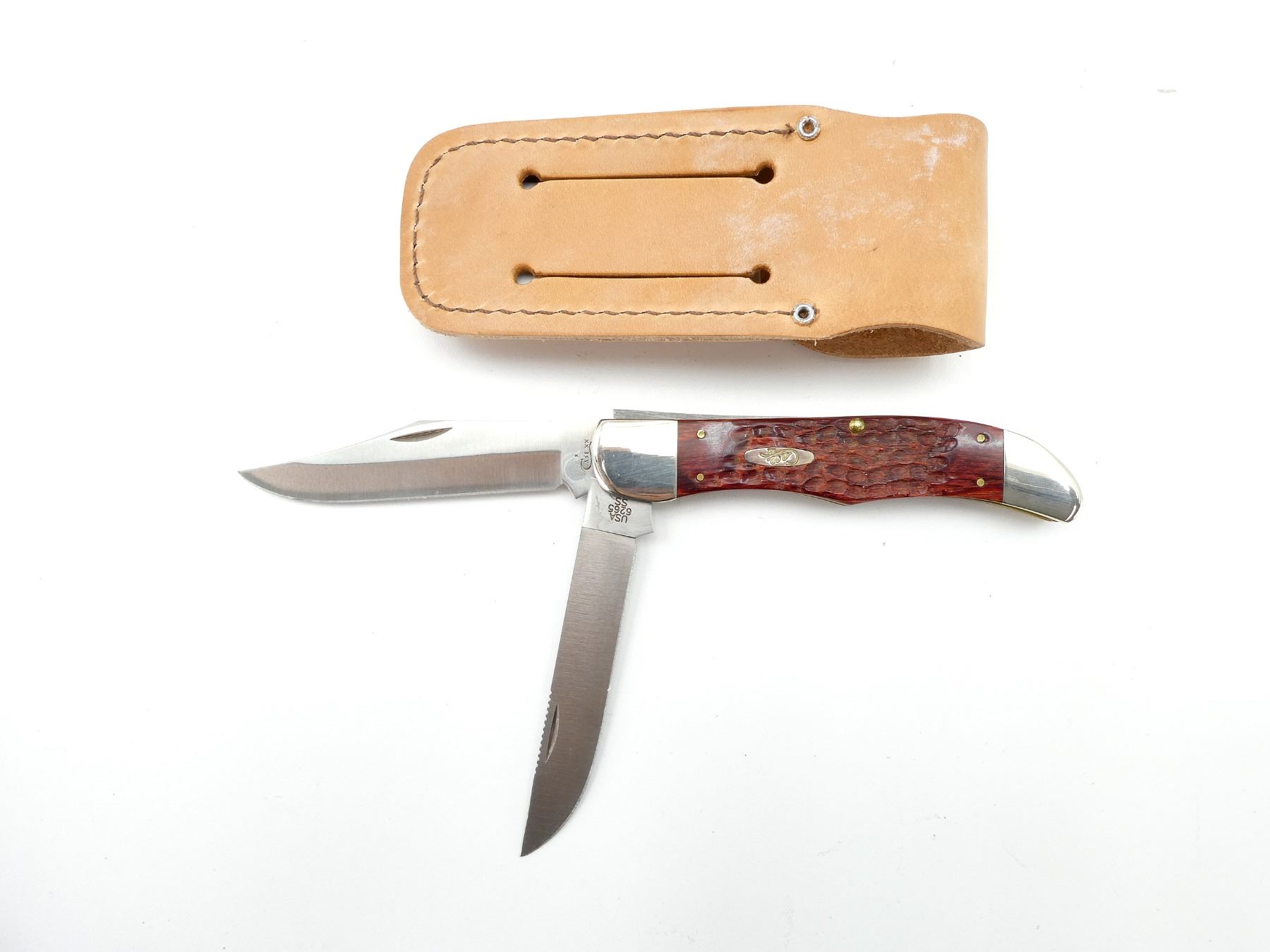 (1) KNIFE INCLUDES 2 BLADES, STEEL BLADES, 1 BLADE MARKED "CASE XX" & 1 BLADE MARKED "USA 6265 SS", WOODEN HANDLE, MARKED "CASE XX", CONSIGNOR STATES "NEW", BLADE OALS APPROX. 4.25", OVERALL LENGTH APPROX. 9.25", WITH BROWN LEATHER CARRY CASE IN ORIGINAL PACKAGING. SEE PHOTOS.