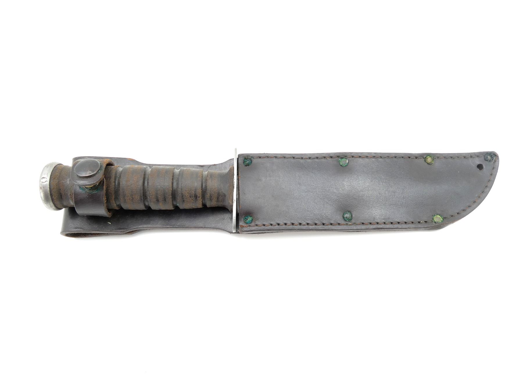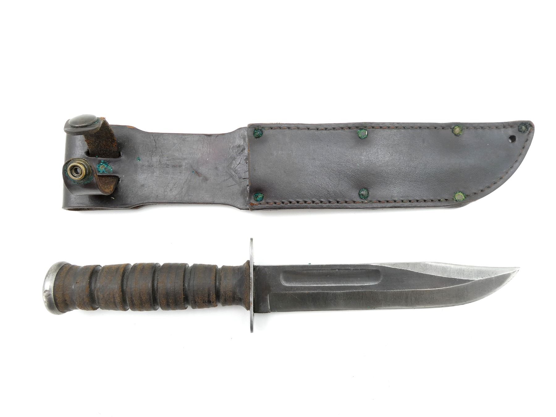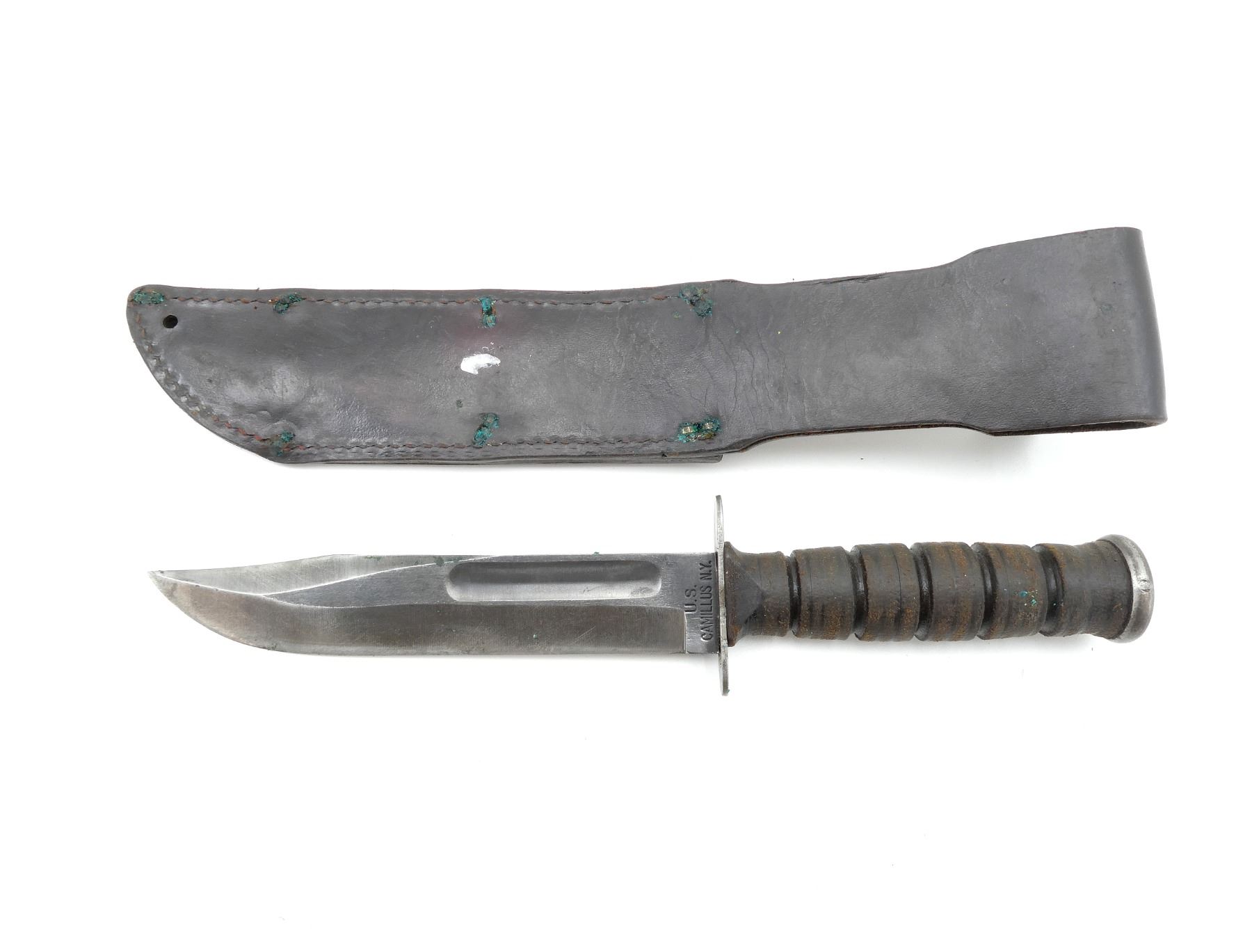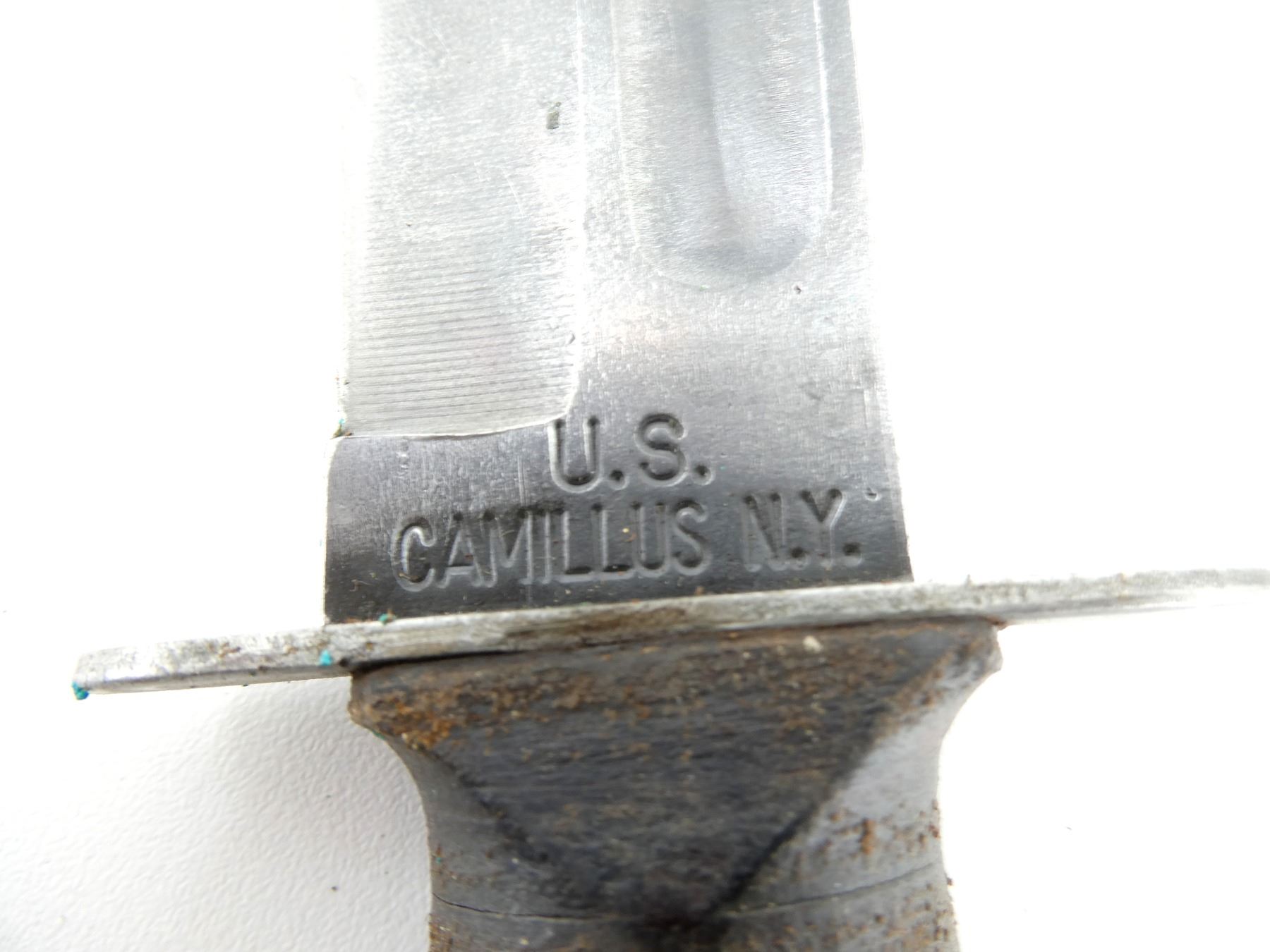 (1) STEEL BLADE, MARKED "U.S. CAMILLUS N.Y.", LEATHER HANDLE, UNMARKED, SHOWS WEAR & TEAR / USE MARKS, BLADE OVERALL LENGTH APPROX. 7", OVERALL LENGTH APPROX. 12 1/8", WITH BROWN LEATHER SHEATH. SEE PHOTOS.