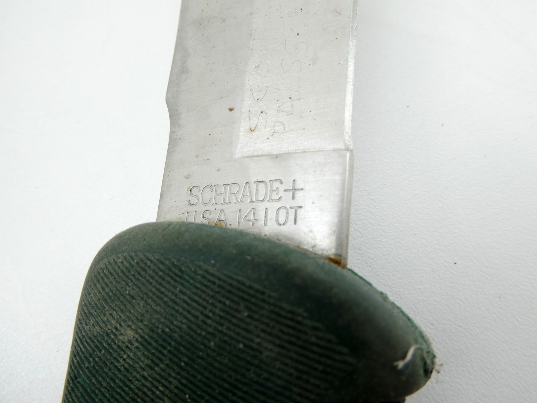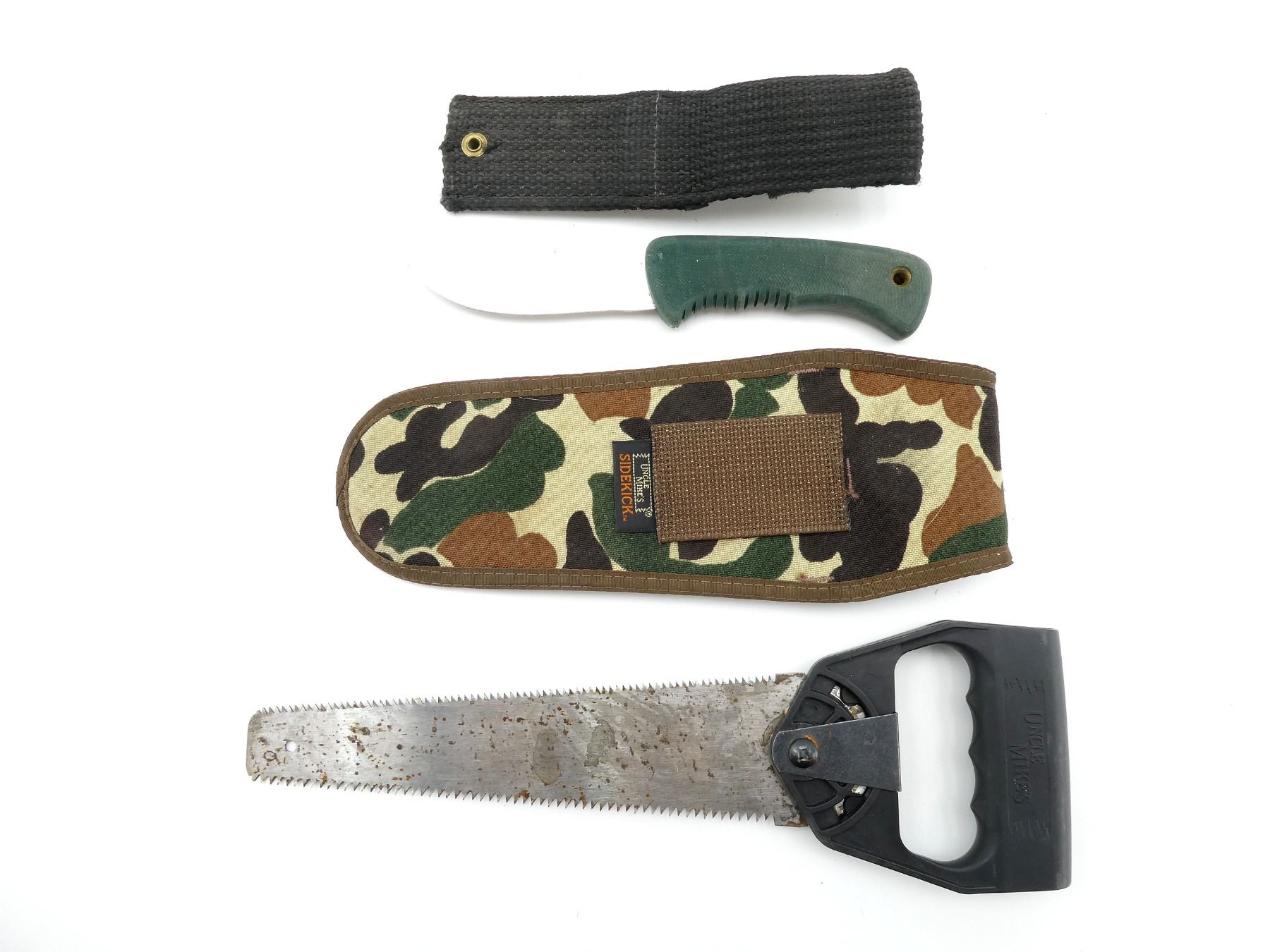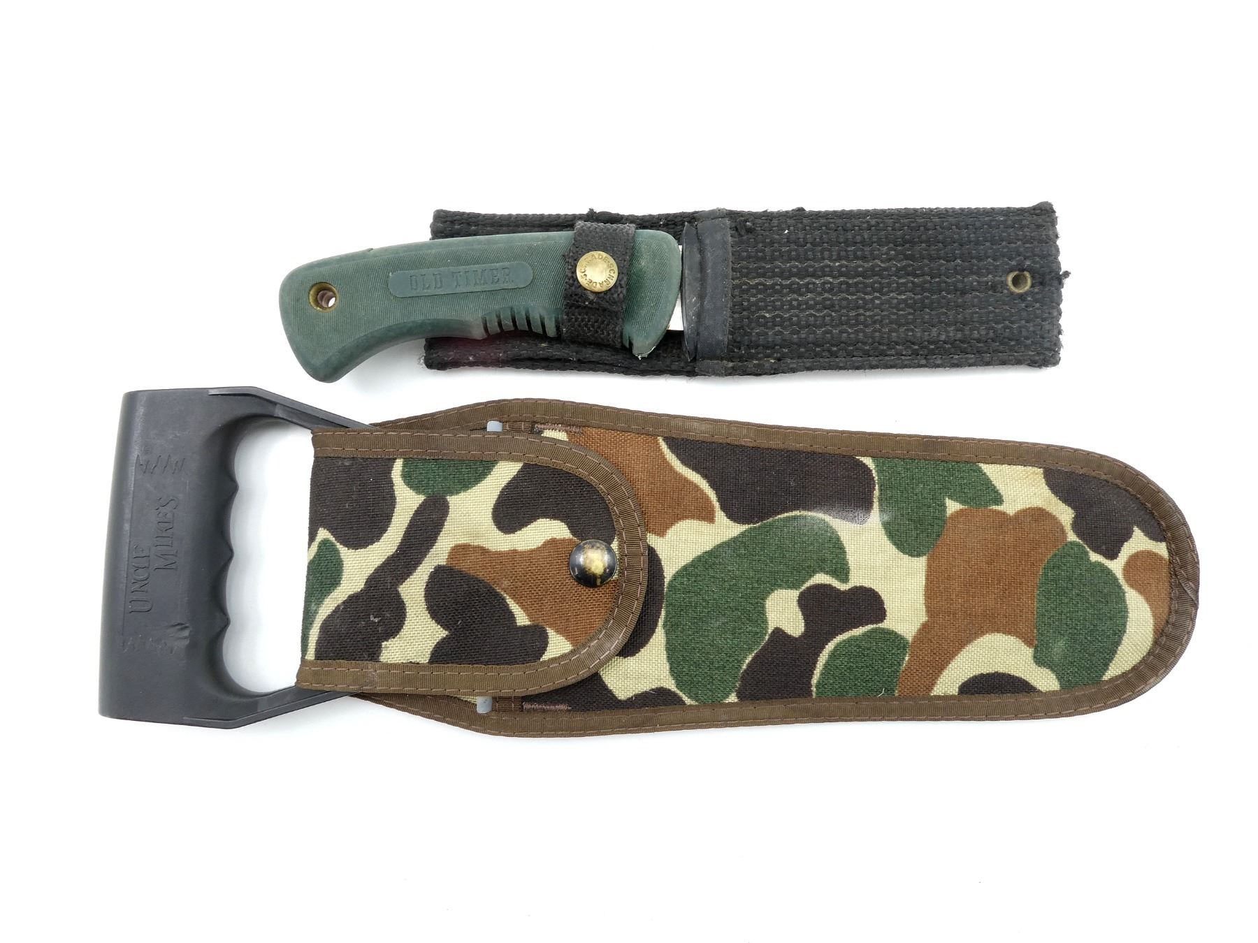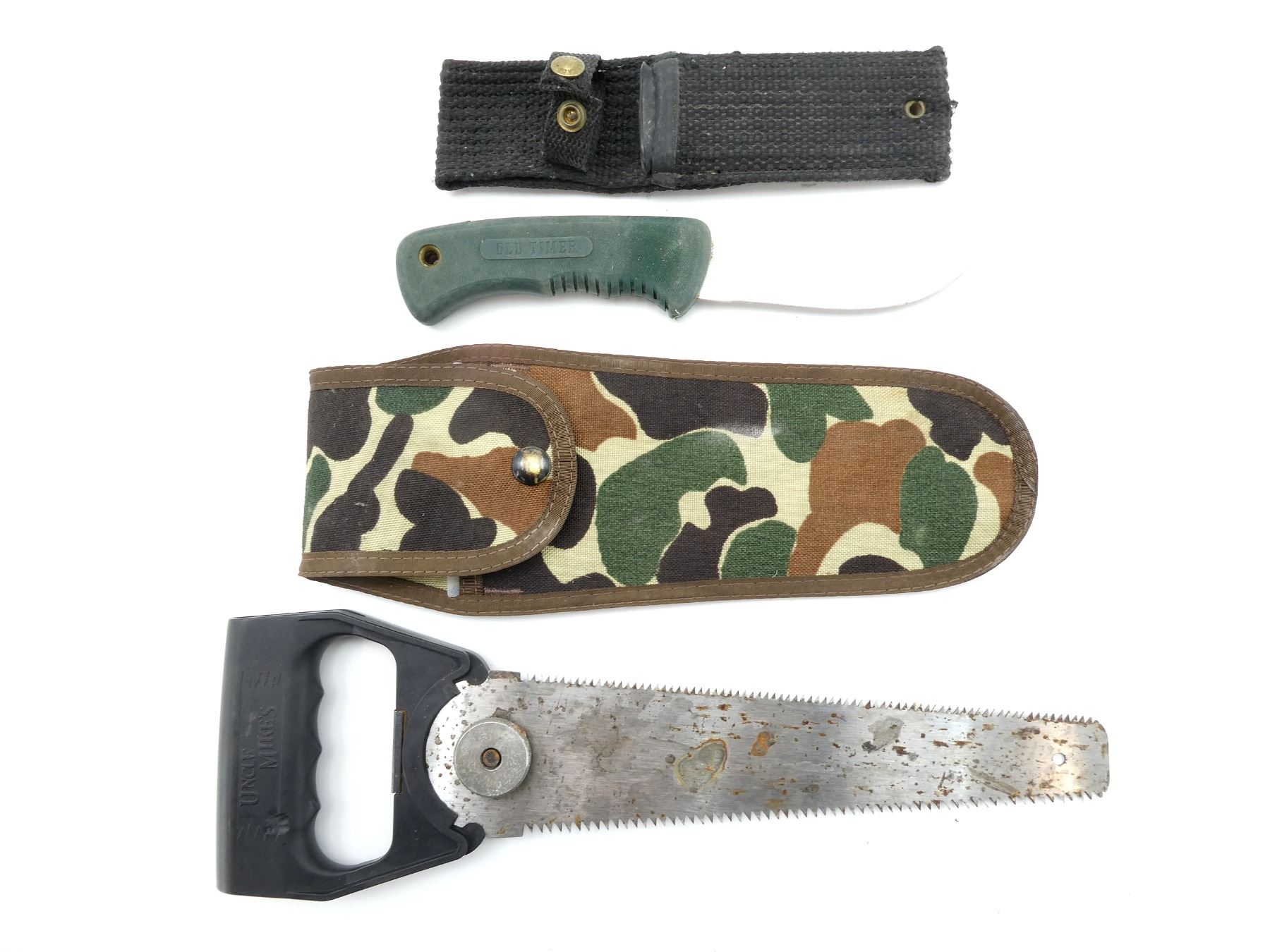 LOT INCLUDES; (1) OLD TIMER FIXED BLADE KNIFE, STAINLESS STEEL BLADE, MARKED: "SCHRADEL+, USA 1410T", GREEN RUBBER GRIP MARKED: "OLT TIMER", NYLON & BLACK POLYMER SHEATH, UNMARKED, BLADE APPROX. 4.25" & OVERALL LENGTH APPROX. 9 3/8" & (1) UNCLE MIKE'S HAND SAW, STEEL BLADE, UNMARKED, BLACK POLYMER HANDLE, MARKED: "UNCLE MIKE'S", CAMOUFLAGE SHEATH, BLADE APPROX. 9.5" & OVERALL LENGTH APPROX. 13.5". SEE PHOTOS.