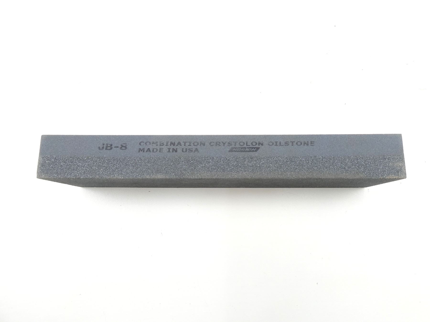 (1) COMBINATION BENCH STONE, PRE-OILED, MARKED: "JB-8 COMBINATION CRYSTOLON OILSTONE", APPROX. 8 1/8" X 2 1/8" X 1 1/8", WITH ORIGINAL PACKAGING. SEE PHOTOS.