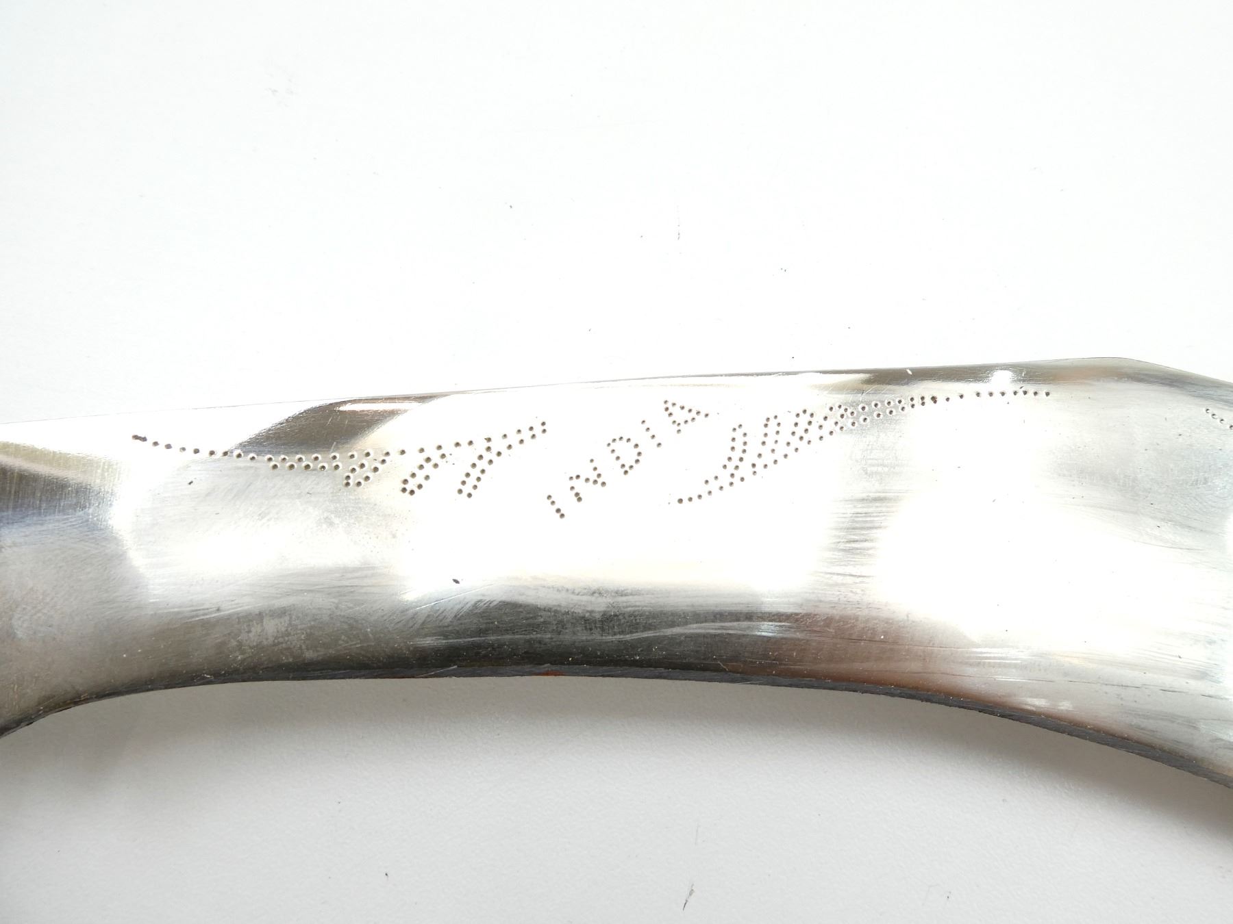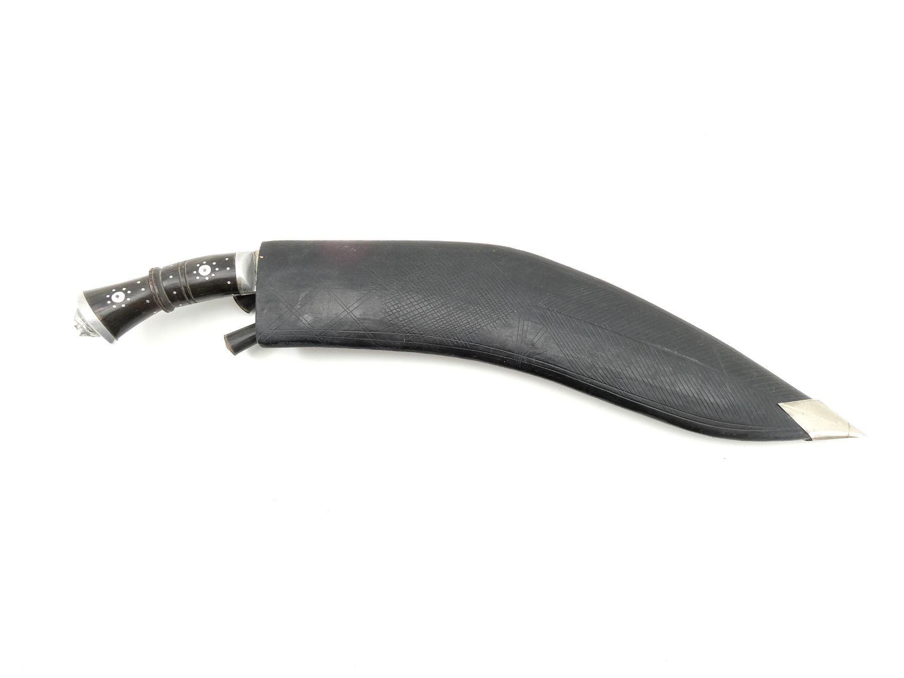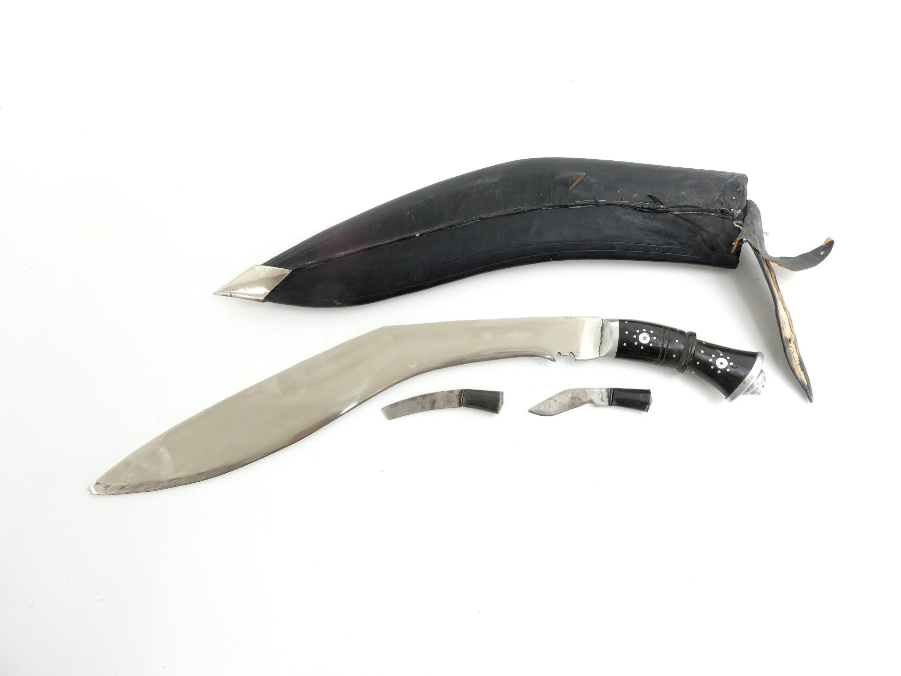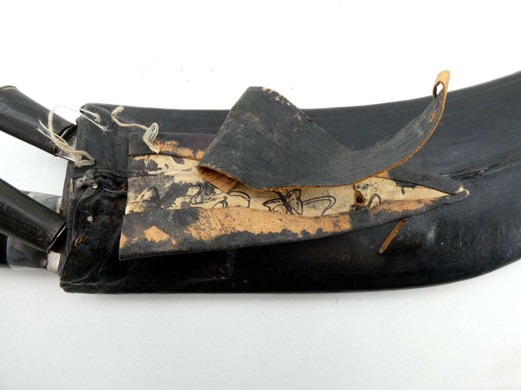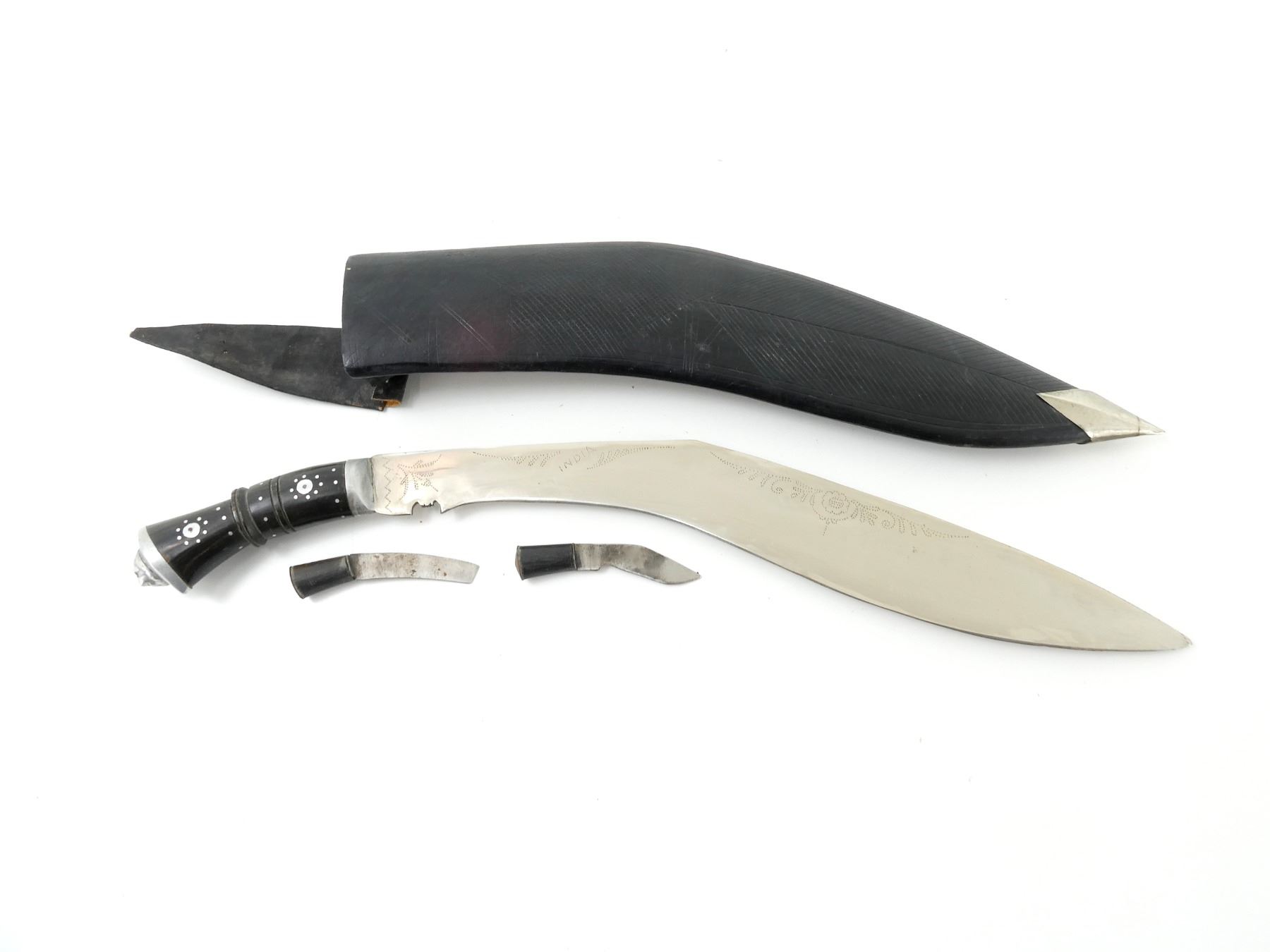 (1) STEEL BLADE, MARKED "INDIA" WITH ENGRAVED DESIGN, WOODEN & METAL HANDLE, UNMARKED, WOODEN LEATHER WRAPPED SHEATH, WITH 2 ADDITIONAL SMALL BLADES, BLADE OVERALL LENGTH APPROX. 14.5", OVERALL LENGTH APPROX. 19", SMALL BLADES OVERALL LENGTH APPROX. 2.5". SEE PHOTOS.