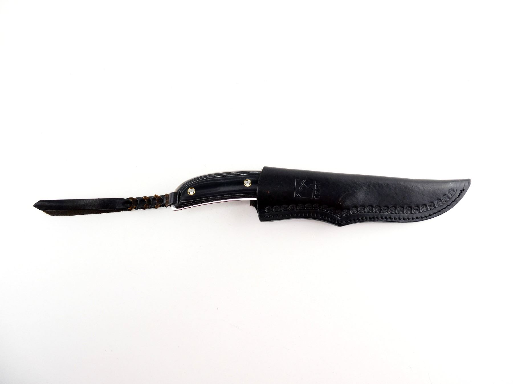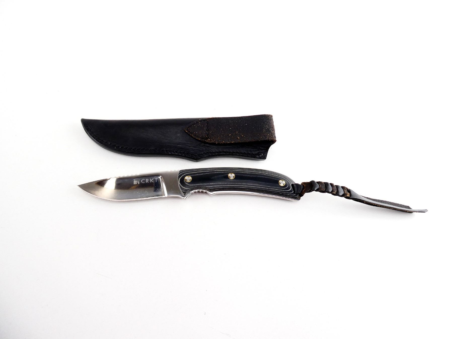 (1) STEEL BLADE, SIGNED BY DESIGNER RUSS KOMMER, MARKED "SIGNATURE LIMITED EDITION NO. 454 OF 500", ETC., MICARTA HANDLE, UNMARKED, SHOWS LIGHT WEAR & TEAR / USE MARKS, BLADE OVERALL LENGTH APPROX. 3.25", OVERALL LENGTH APPROX. 7.75", WITH BLACK LEATHER SHEATH, MARKED "CRKT". SEE PHOTOS.