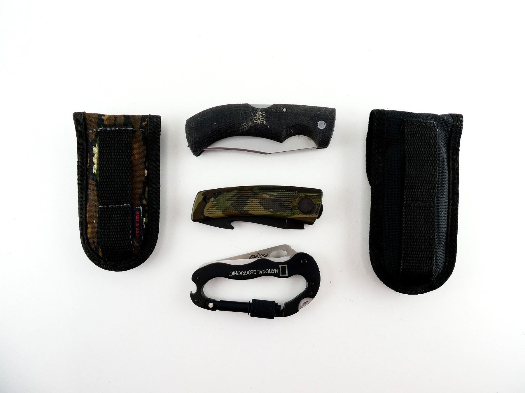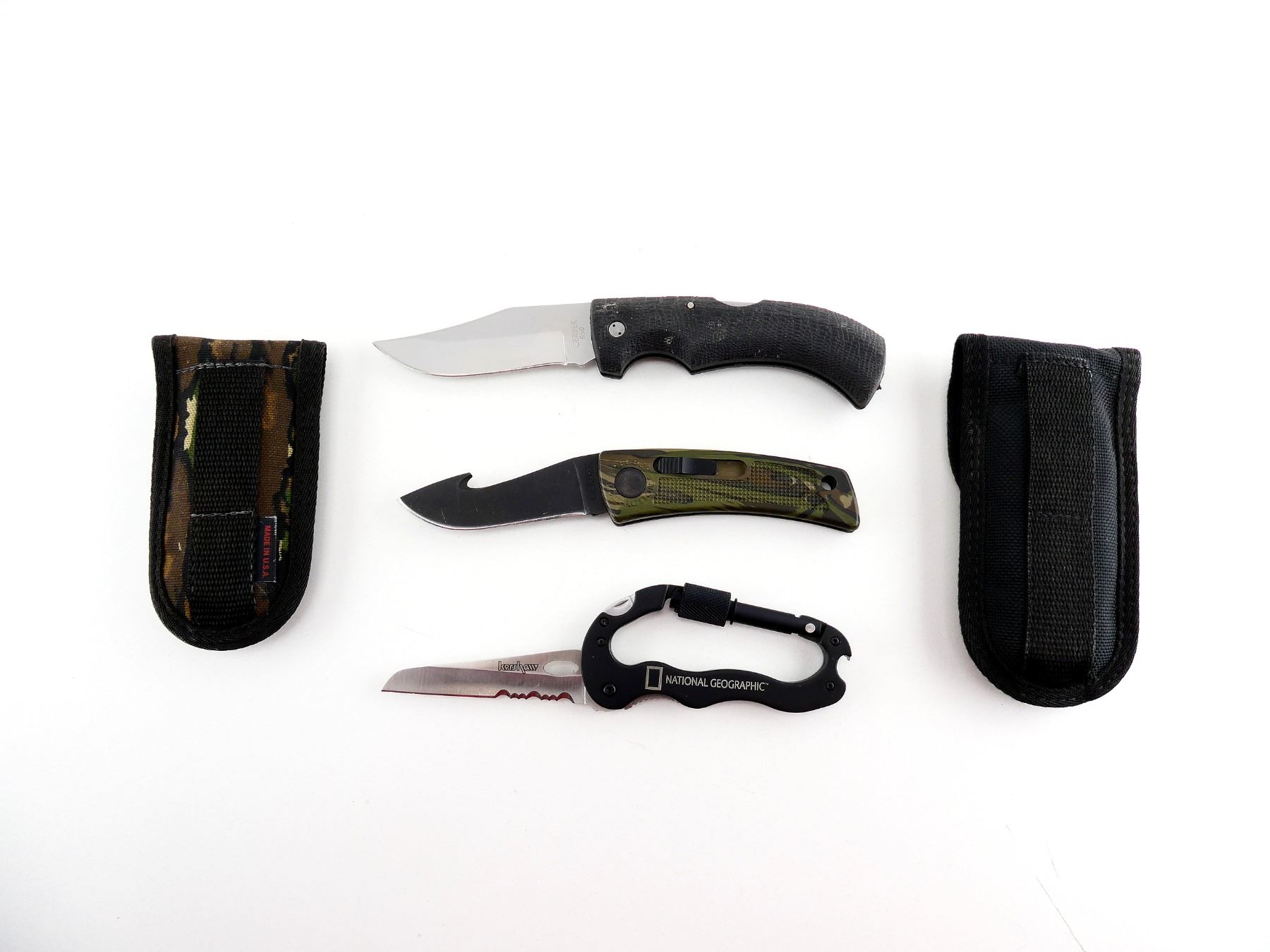 LOT INCLUDES; (1) GERBER GATOR KNIFE, STEEL BLADE, MARKED "GERBER 650", ETC., RUBBER HANDLE, UNMARKED, SHOWS WEAR & TEAR / USE MARKS, BLADE OVERALL LENGTH APPROX. 4", OVERALL LENGTH APPROX. 8.75", WITH BLACK NYLON SHEATH, MARKED "GATOR", ETC., (1) GERBER BOLT ACTION KNIFE, STEEL BLADE WITH GUT HOOK, MARKED "GERBER", CAMO POLYMER HANDLE, MARKED "GERBER BOLT ACTION", ETC., SHOWS LIGHT WEAR & TEAR / USE MARKS, BLADE OVERALL LENGTH APPROX. 3.25", OVERALL LENGTH APPROX. 7.5", WITH CAMO NYLON SHEATH, UNMARKED & (1) NATIONAL GEOGRAPHIC MULTI-FUNCTION CARABINER, STEEL BLADE, MARKED "KERSHAW", ETC., METAL HANDLE, MARKED "NATIONAL GEOGRAPHIC", WITH SCREW HEADS & CAN OPENER, ETC., SHOWS LIGHT WEAR & TEAR / USE MARKS, BLADE OVERALL LENGTH APPROX. 3.25", OVERALL LENGTH APPROX. 4.25". SEE PHOTOS.