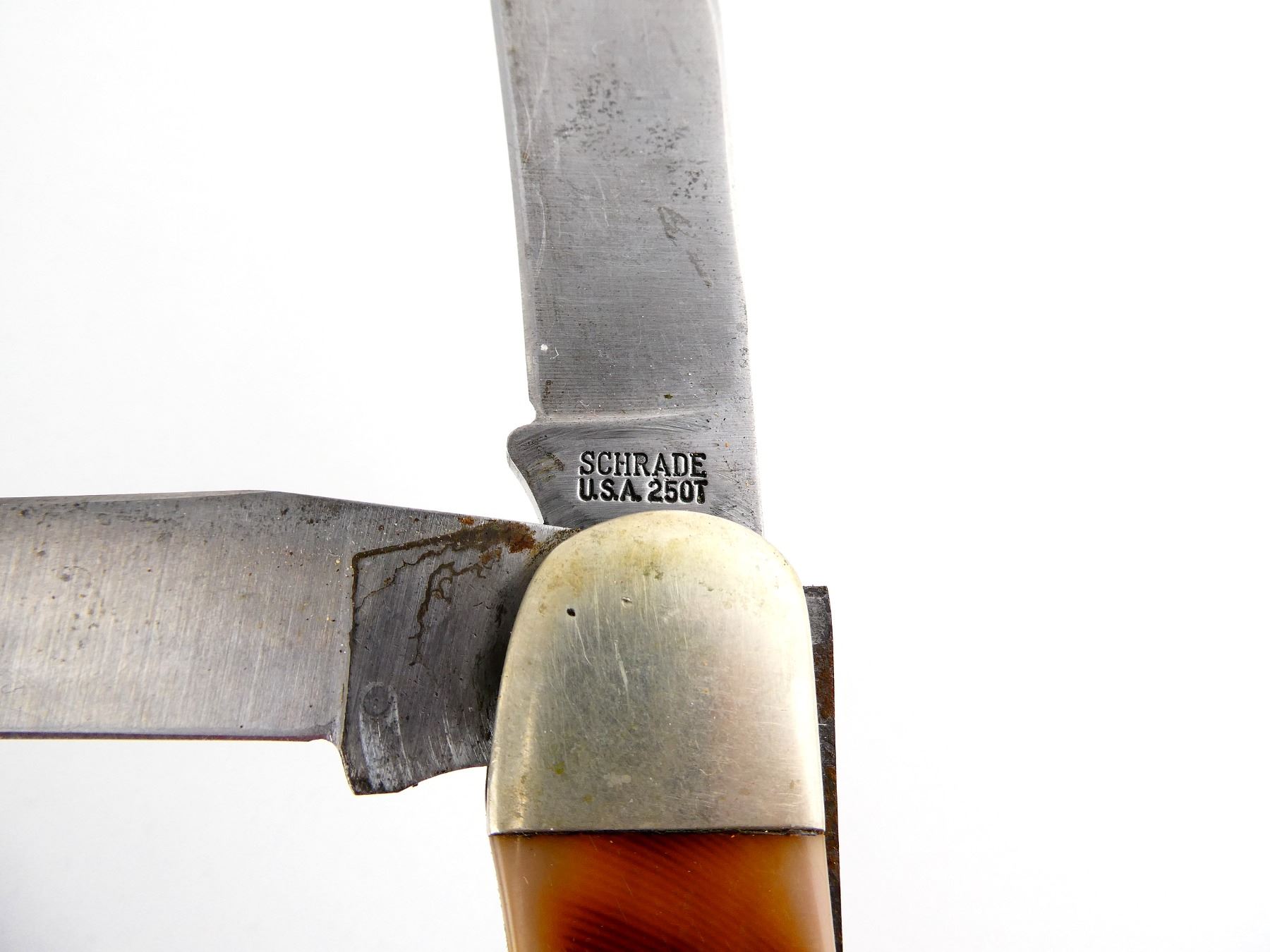 LOT INCLUDES; (1) SPYDERCO FOLDING KNIFE, STAINLESS STEEL BLADE, MARKED "SPYDERCO", CARBON FIBER HANDLE, UNMARKED, SHOWS LIGHT WEAR & TEAR / USE MARKS, BLADE OVERALL LENGTH APPROX. 3", OVERALL LENGTH APPROX. 7" & (1) OLD TIMER FOLDING KNIFE, WITH 2 BLADES, STEEL BLADES, 1 BLADE MARKED "SCHRADE U.S.A. 250T", 1 BLADE UNMARKED, POLYMER HANDLE, MARKED "OLD TIMER", SHOWS WEAR & TEAR / USE MARKS, BLADE OVERALL LENGTH APPROX. 4" & 4.25", OVERALL LENGTH APPROX. 5.25", WITH BROWN LEATHER SHEATH, MARKED "OLD TIMER". SEE PHOTOS.