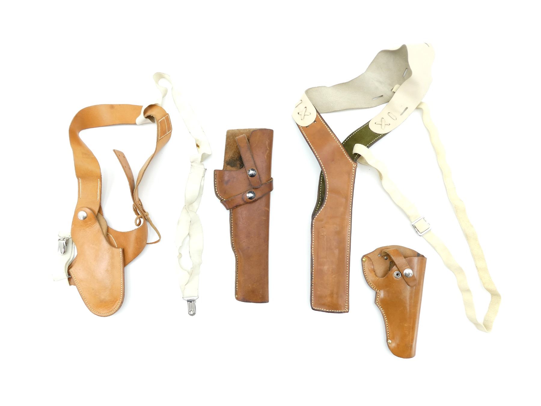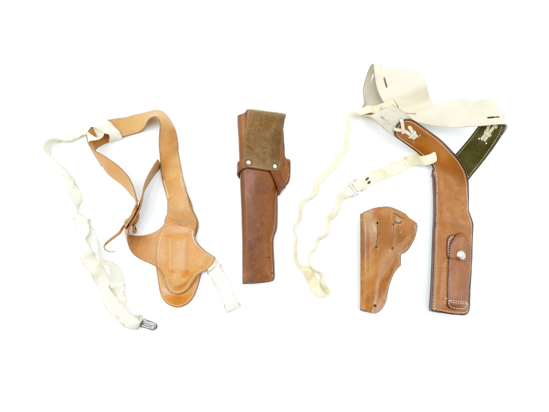 LOT INCLUDES; (1) SAFARILAND BROWN LEATHER HOLSTER, FITS RH, MARKED "LGE. AUTO.", ETC., OVERALL LENGTH APPROX. 23", ADJUSTABLE WITH ELASTIC STRAPS, (1) UNKNOWN BROWN LEATHER SHOULDER HOLSTER, FITS RH, MARKINGS UNCLEAR, OVERALL LENGTH APPROX. 29", ADJUSTABLE WITH ELASTIC STRAPS, (1) UNKNOWN BROWN LEATHER HOLSTER, FITS RH, UNMARKED, OVERALL LENGTH APPROX. 7.5" & (1) UNKNOWN BROWN LEATHER HOLSTER, FITS RH, UNMARKED, OVERALL LENGTH APPROX. 12". SEE PHOTOS.