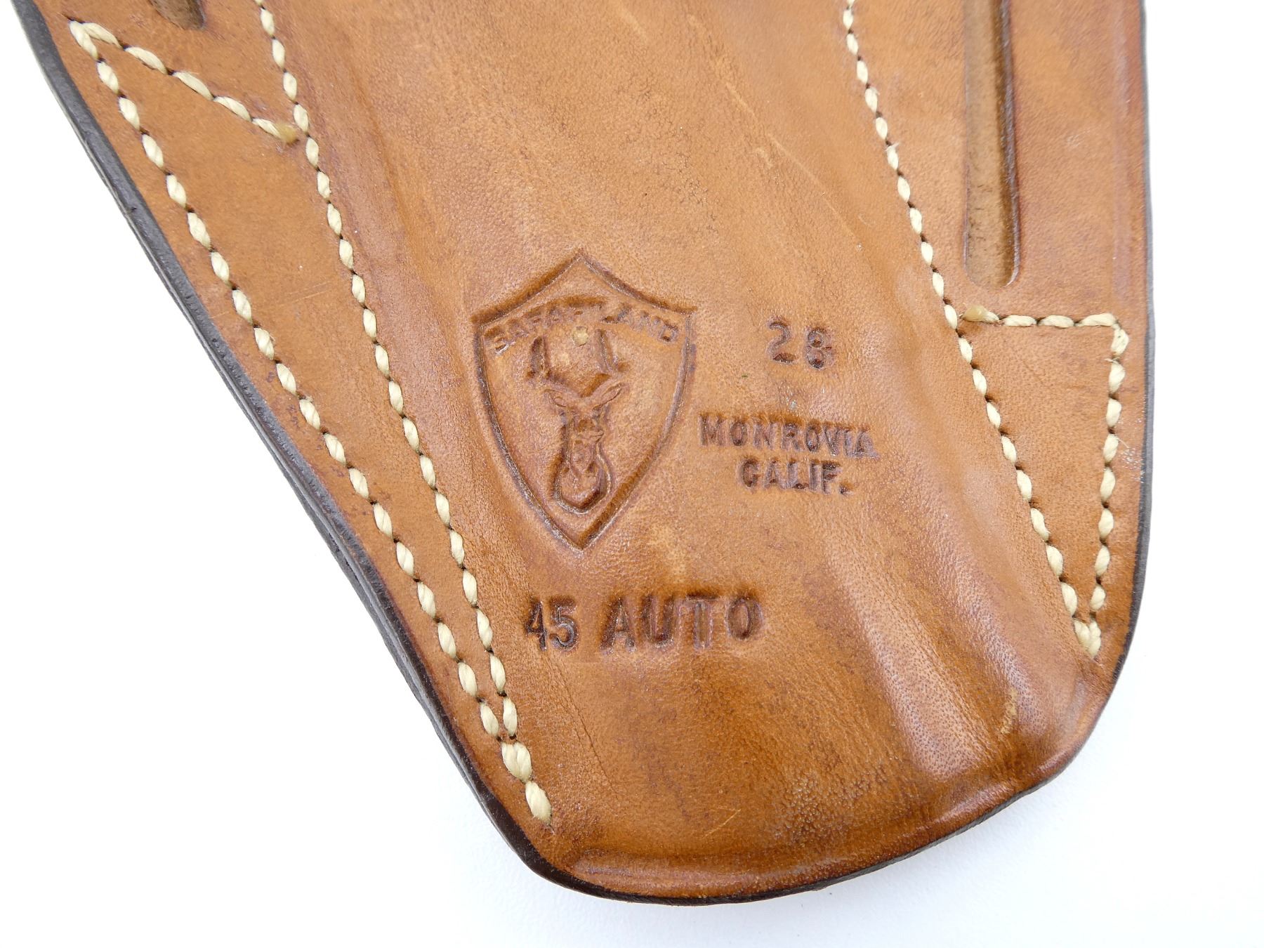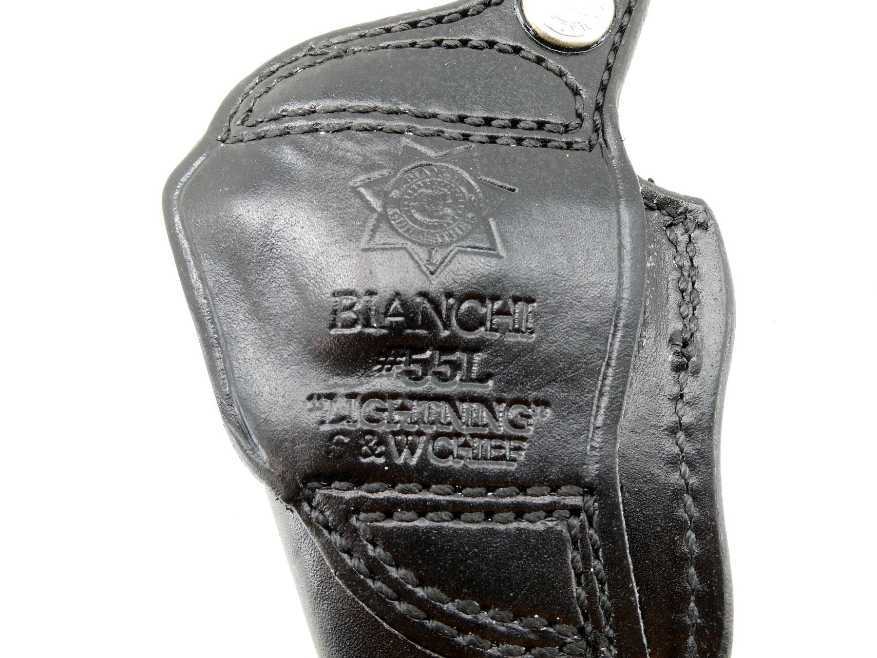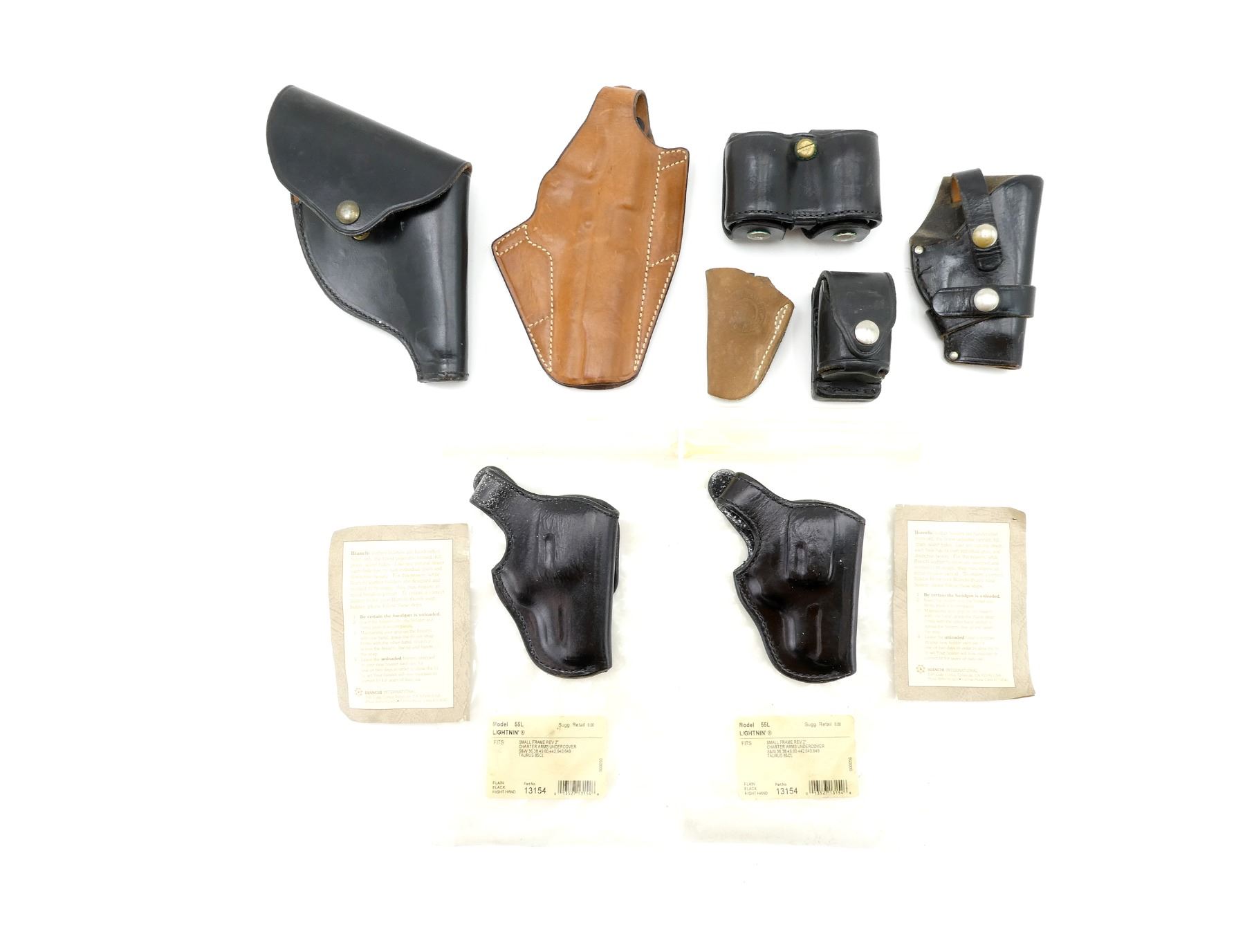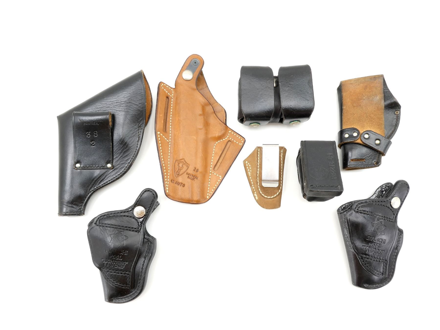 LOT INCLUDES; (2) BIANCHI LIGHTNING BLACK LEATHER HOLSTERS, FITS RH SMALL REV 2", MARKED "S&W CHIEF", "#55L", ETC., PART NO. 13154, OVERALL LENGTH APPROX. 4.75", (1) SAFARILAND BROWN LEATHER HOLSTER, FITS RH, MARKED "45 AUTO", ETC., OVERALL LENGTH APPROX. 8.5", (1) UNKNOWN BLACK LEATHER HOLSTER, FITS RH, UNMARKED, OVERALL LENGTH APPROX. 5.25", (1) WM. SCULLY LTD. BLACK LEATHER HOLSTER, FITS RH, MARKED "38 2", ETC., OVERALL LENGTH APPROX. 8", (1) NORTH AMERICAN ARMS BROWN SUEDE HOLSTER, FITS LH, MARKED WITH MANUFACTURER'S LOGO, OVERALL LENGTH APPROX. 3.5" & (1) BIANCHI SPEED LOADER POUCH, BLACK LEATHER, UNMARKED, OVERALL LENGTH APPROX. 4", ETC. SEE PHOTOS.