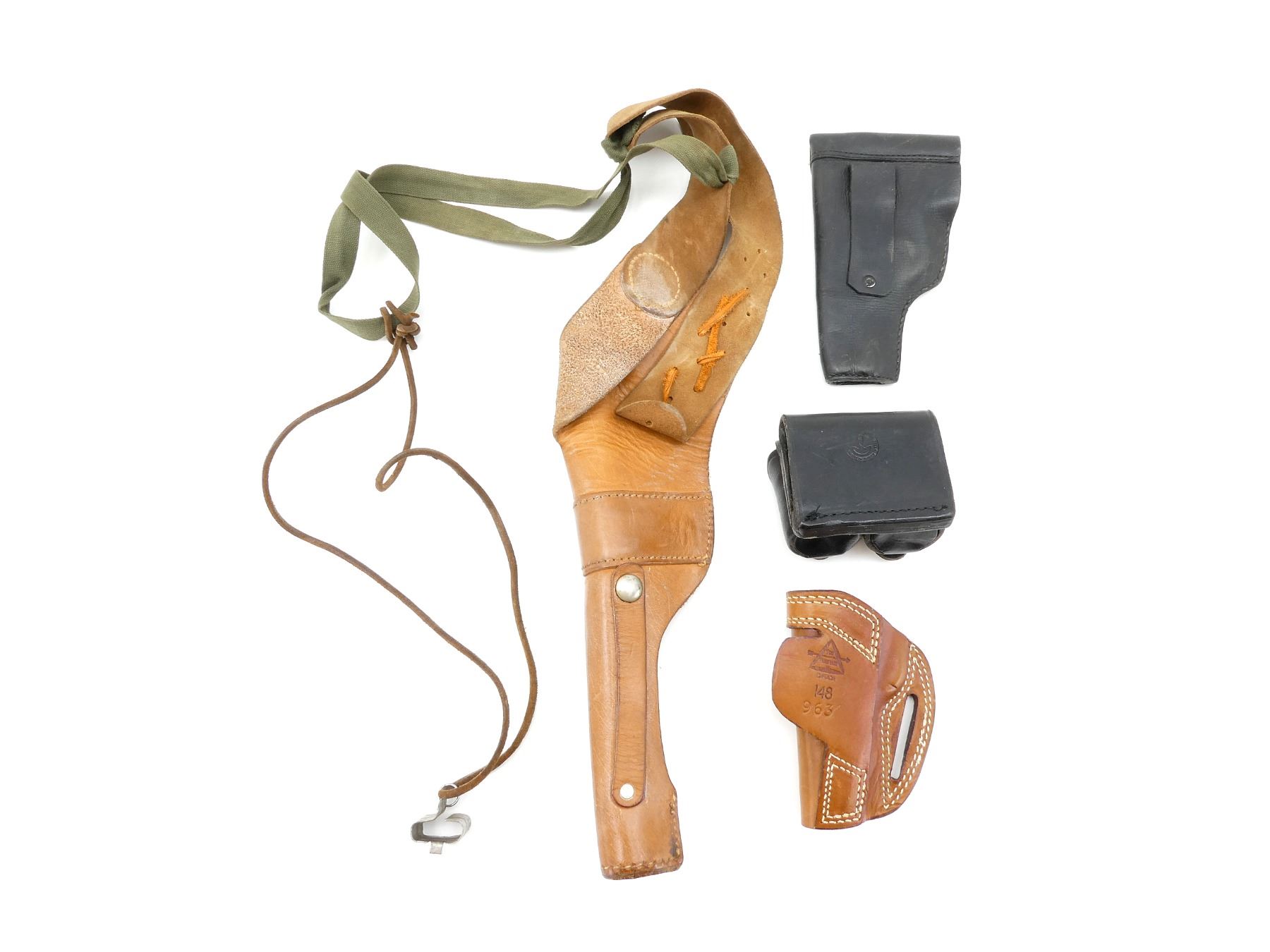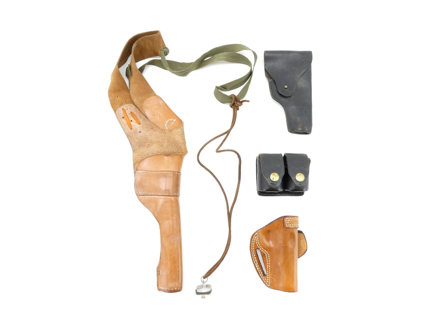 LOT INCLUDES; (1) BRAVER BROS BROWN LEATHER SHOULDER HOLSTER, MARKED "NS/6", ETC., FITS RH, OVERALL LENGTH APPROX. 42", (1) TED BOURDON BROWN LEATHER HOLSTER, MARKED "148", "963", ETC., FITS RH, OVERALL LENGTH APPROX. 5 1/8", (1) UNKNOWN BLACK LEATHER HOLSTER, UNMARKED, FITS RH, OVERALL LENGTH APPROX. 6 7/8" & (1) G. WILLIAM ENNIS BLACK LEATHER SPEED LOADER HOLSTER, MARKED WITH MANUFACTURER'S LOGO, OVERALL LENGTH APPROX. 3 3/8". SEE PHOTOS.