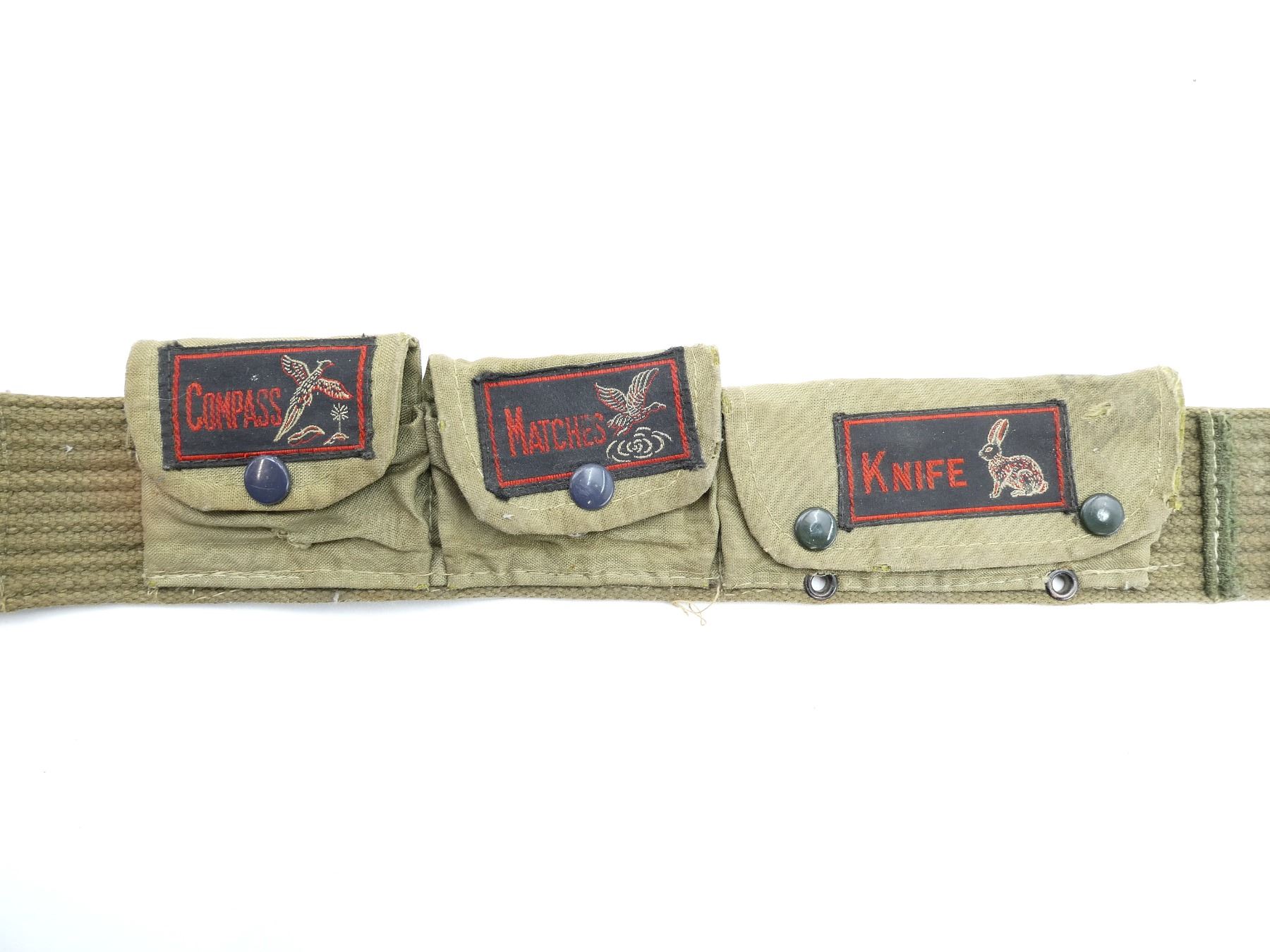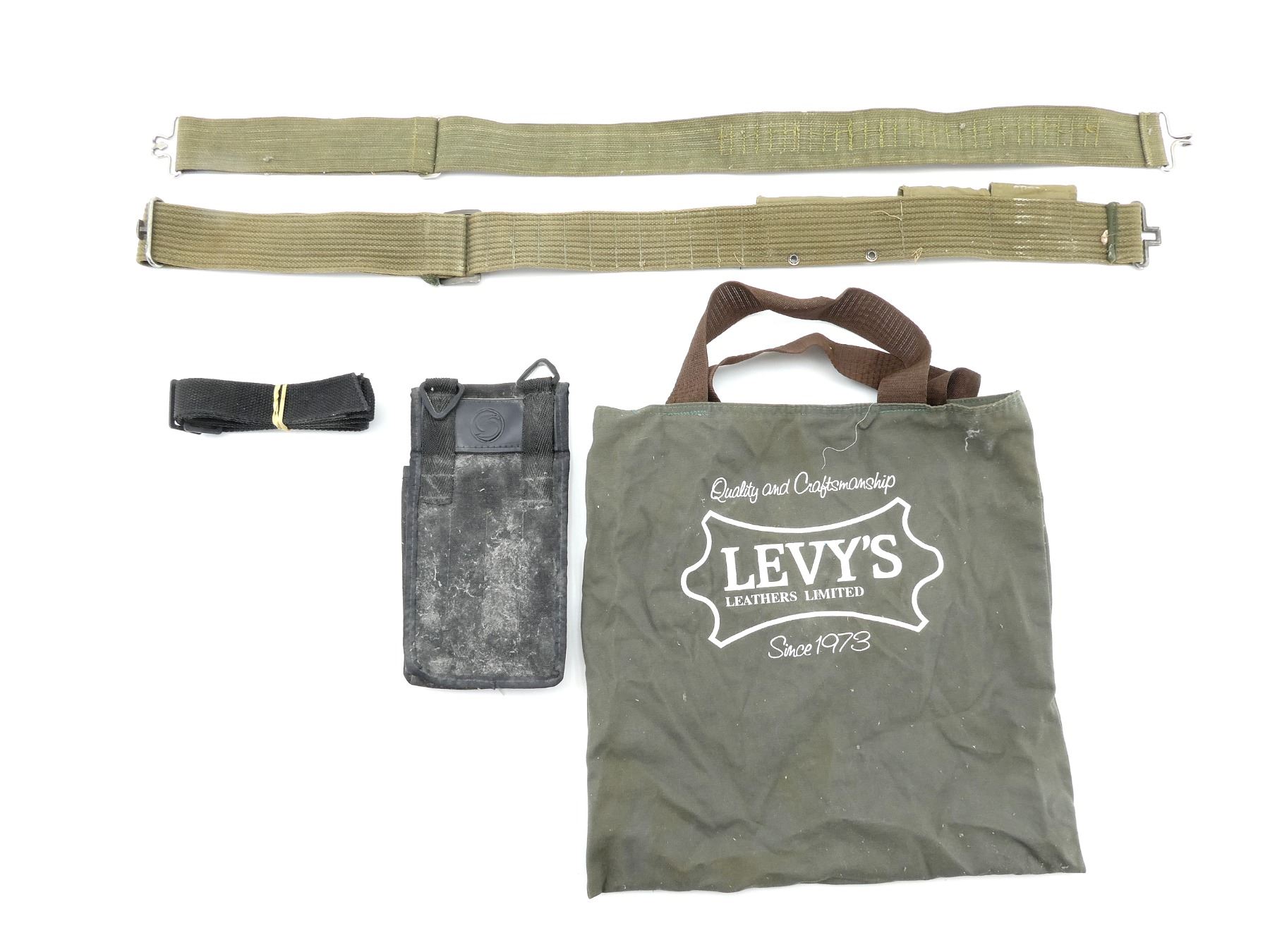 LOT INCLUDES; (1) UNKNOWN GREEN NYLON UTILITY BELT, UNMARKED, OVERALL LENGTH APPROX. 33.25", ADJUSTABLE, (1) UNKNOWN GREEN NYLON AMMO BELT, UNMARKED, FITS RIFLE CARTRIDGES, OVERALL LENGTH APPROX. 33.5", ADJUSTABLE, (1) UNKNOWN BLACK NYLON MAG POUCH, MARKED WITH MANUFACTURER'S LOGO, OVERALL LENGTH APPROX. 9.5", ETC. SEE PHOTOS.