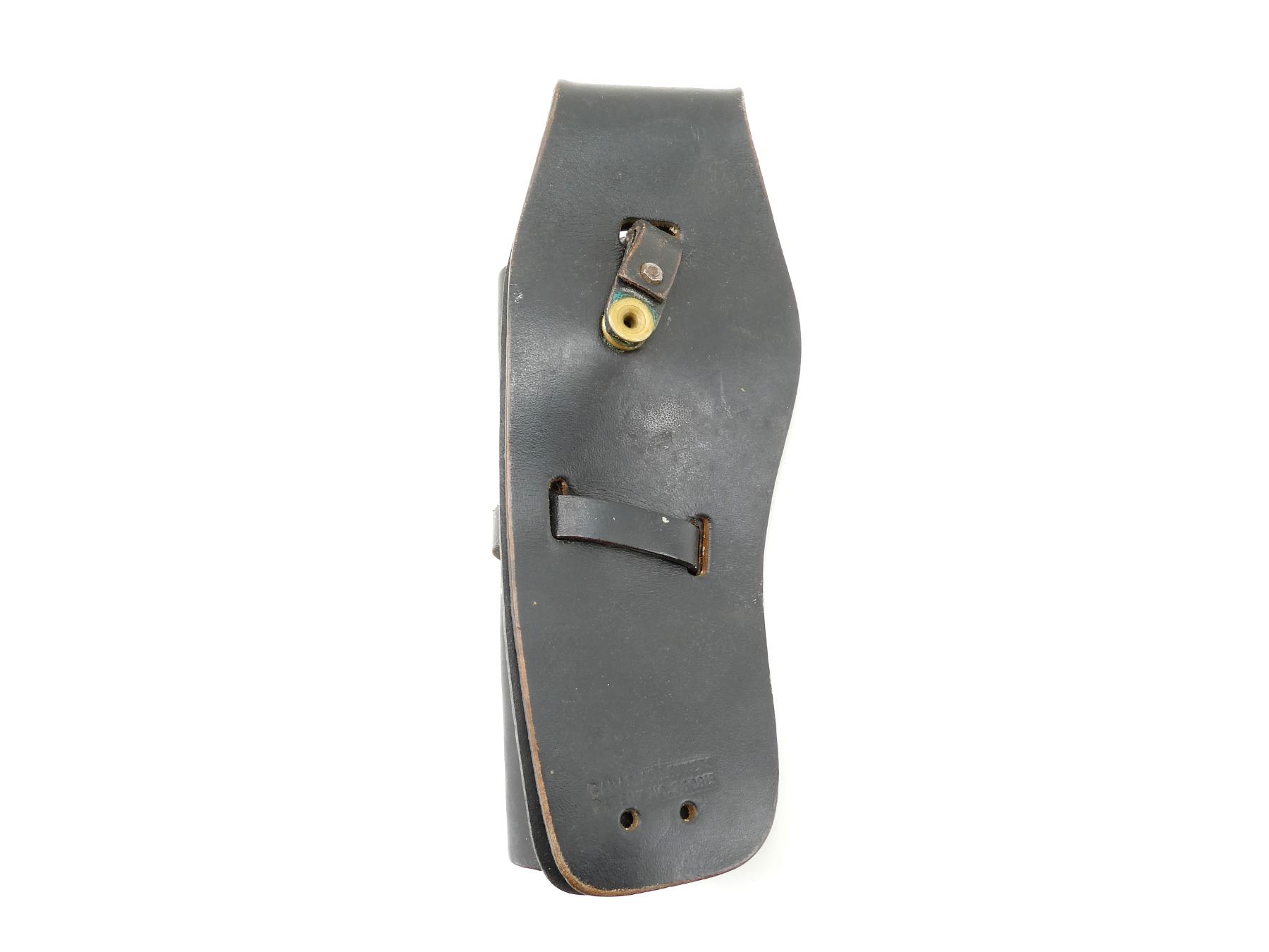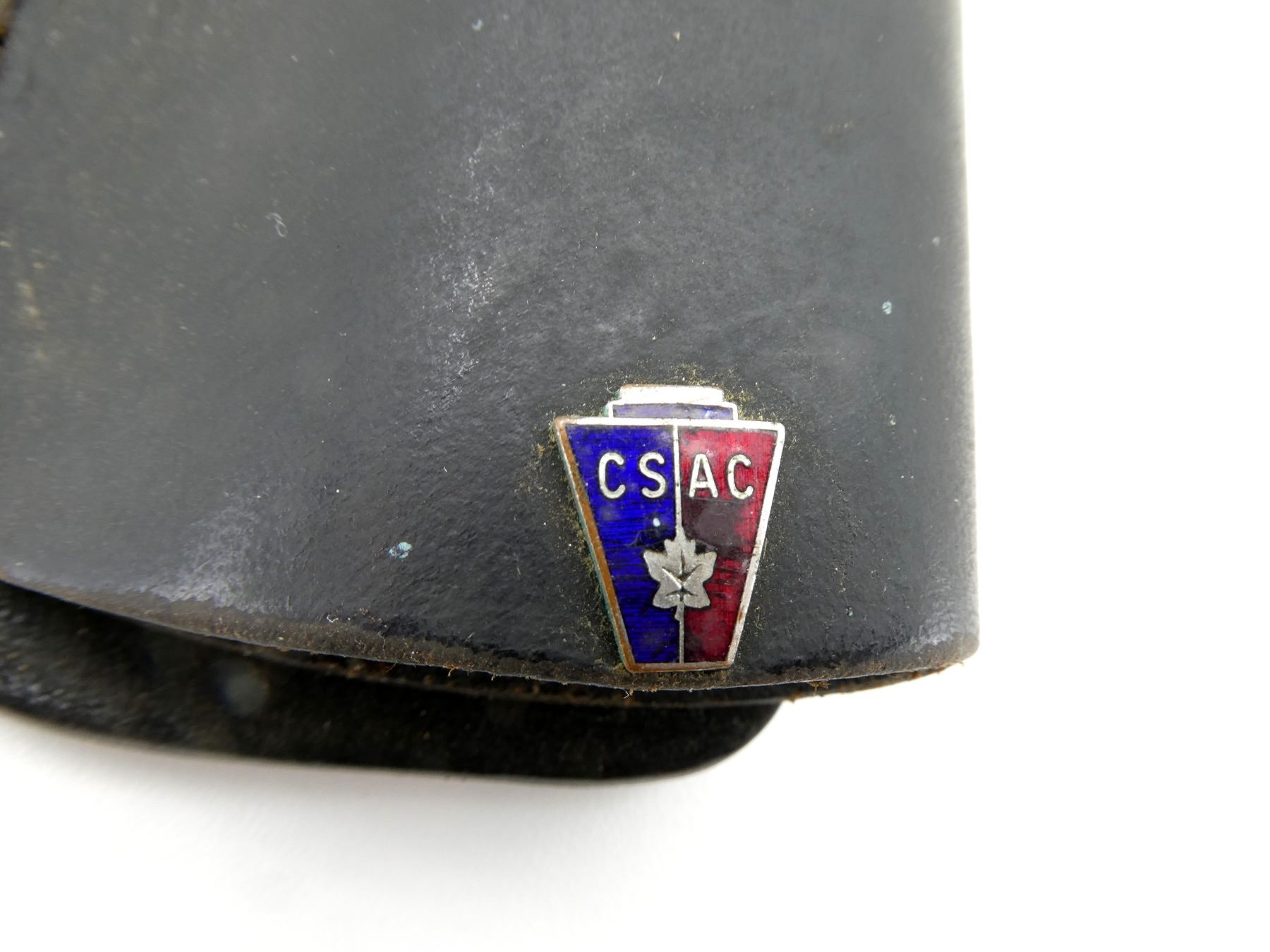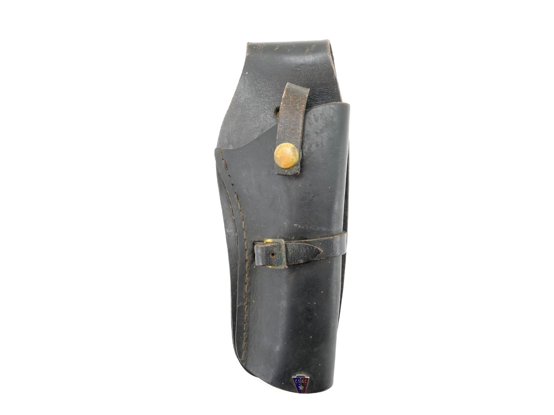 (1) BLACK LEATHER HOLSTER, FITS RH, MARKED "CANADIAN LETTERS", ETC., WITH "CSAC" DECAL, OVERALL LENGTH APPROX. 9.75". SEE PHOTOS.