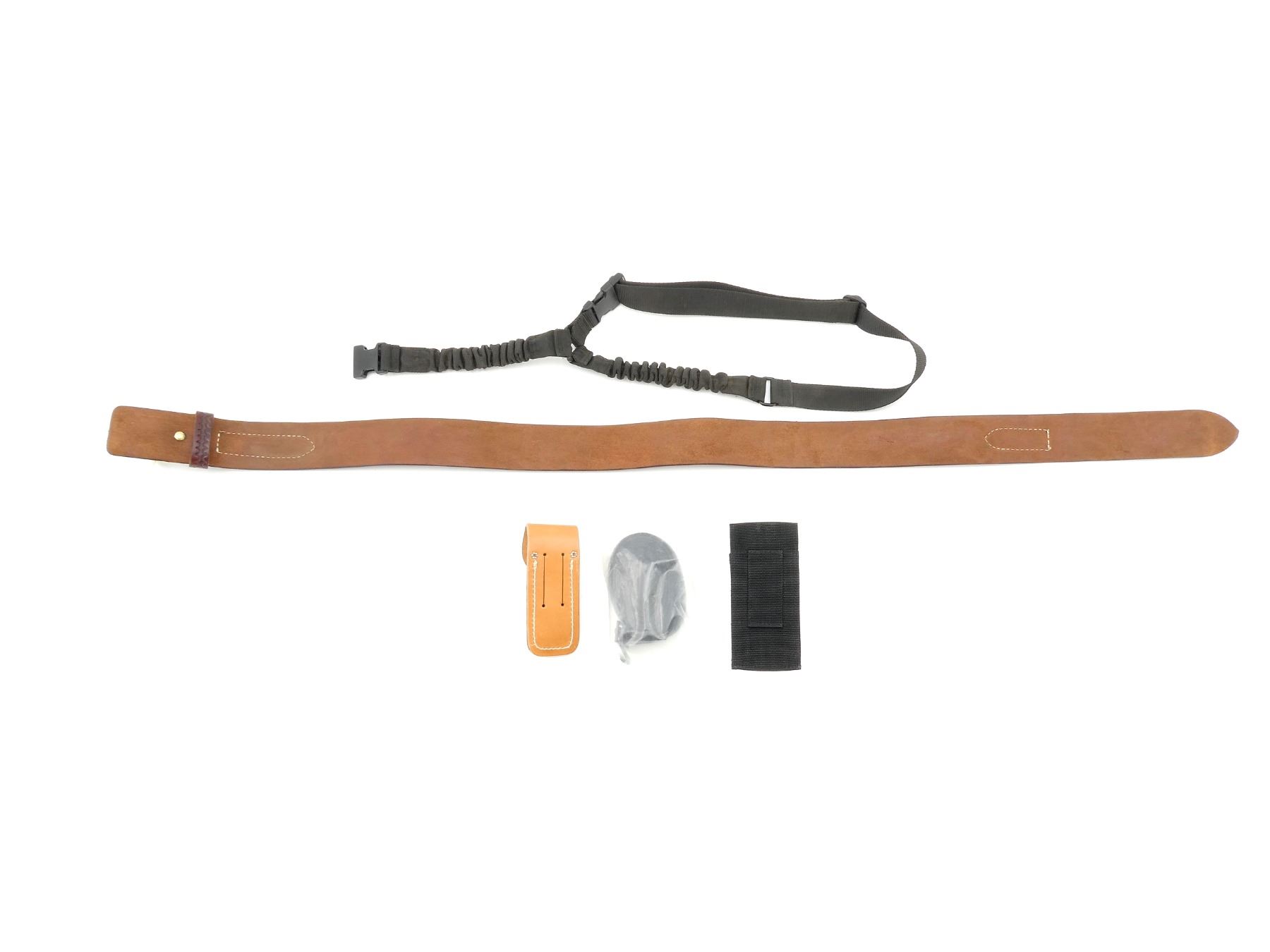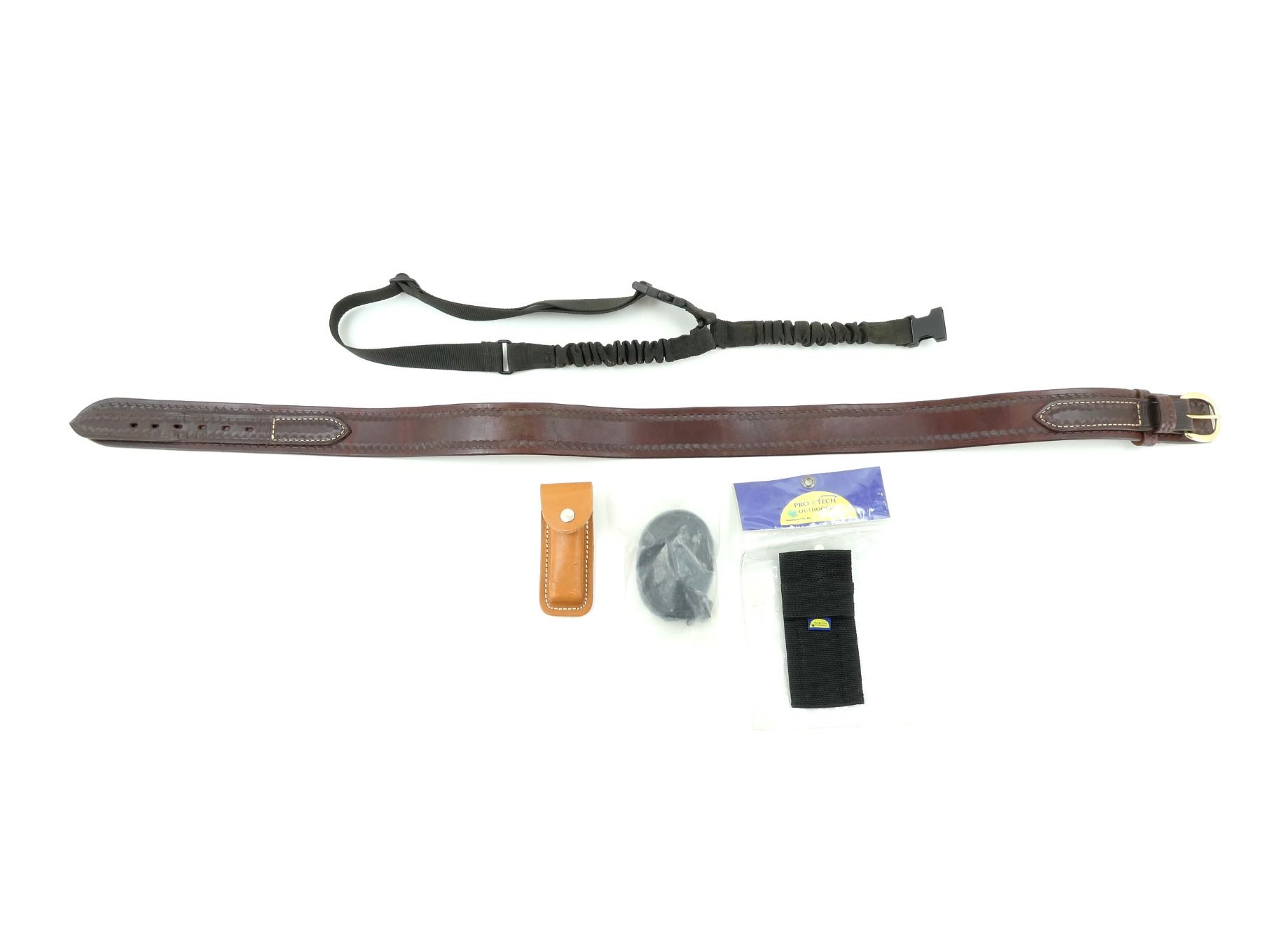 LOT INCLUDES; (1) UNKNOWN BLACK NYLON SLING, WITH RECOIL STRAPS, UNMARKED, OVERALL LENGTH APPROX. 43", ADJUSTABLE, (1) UNKNOWN BLACK NYLON SLING, NEW OLD STOCK, SEALED IN ORIGINAL PACKAGING, (1) PRO TECH OUTDOORS POUCH, APPEARS NEW OLD STOCK, IN ORIGINAL PACKAGING, OVERALL LENGTH APPROX. 6 5/8", (1) UNKNOWN BROWN LEATHER MAG POUCH, UNMARKED, OVERALL LENGTH APPROX. 5 5/8" & (1) UNKNOWN BROWN LEATHER BELT, UNMARKED, OVERALL LENGTH APPROX. 51.5", ADJUSTABLE. SEE PHOTOS.
