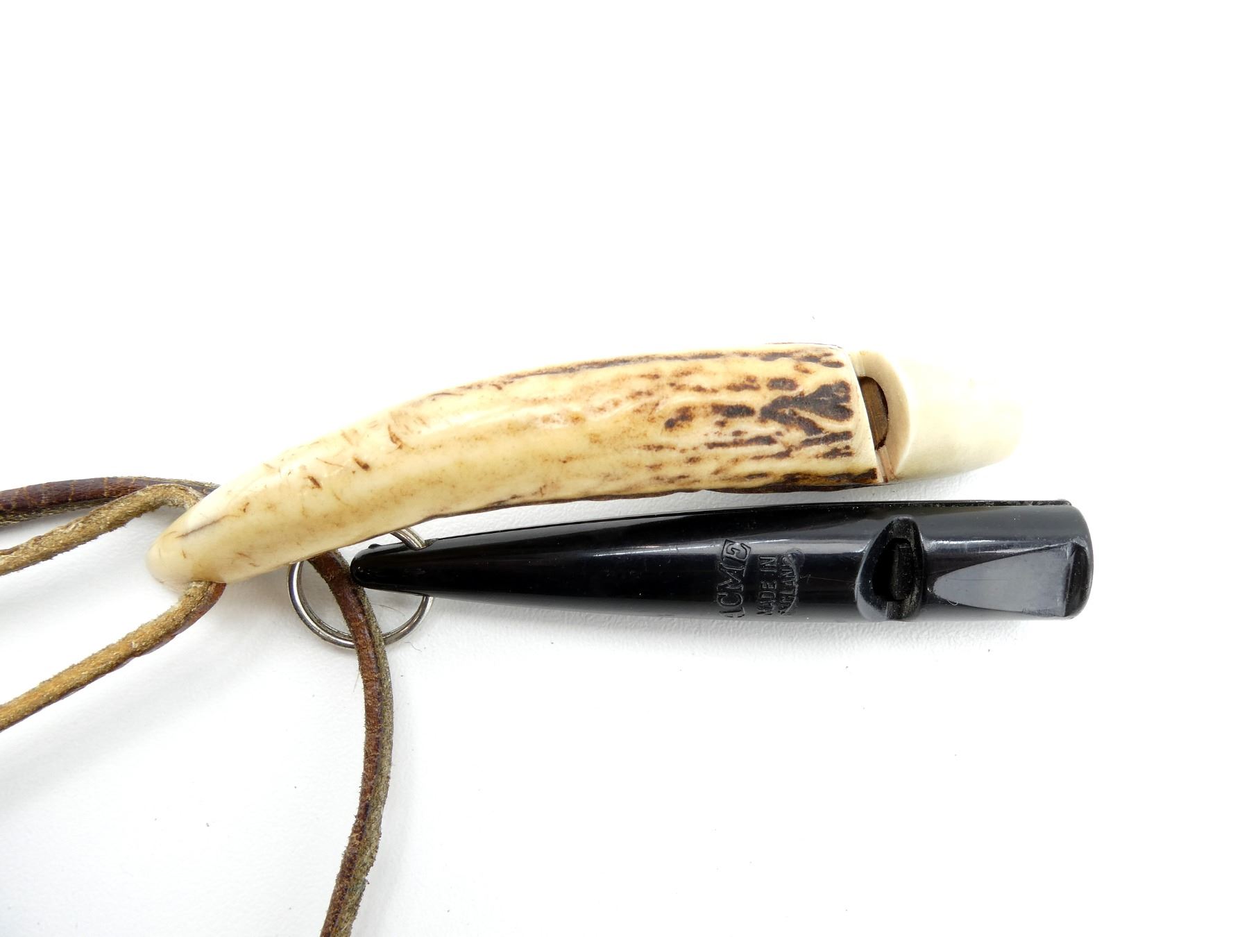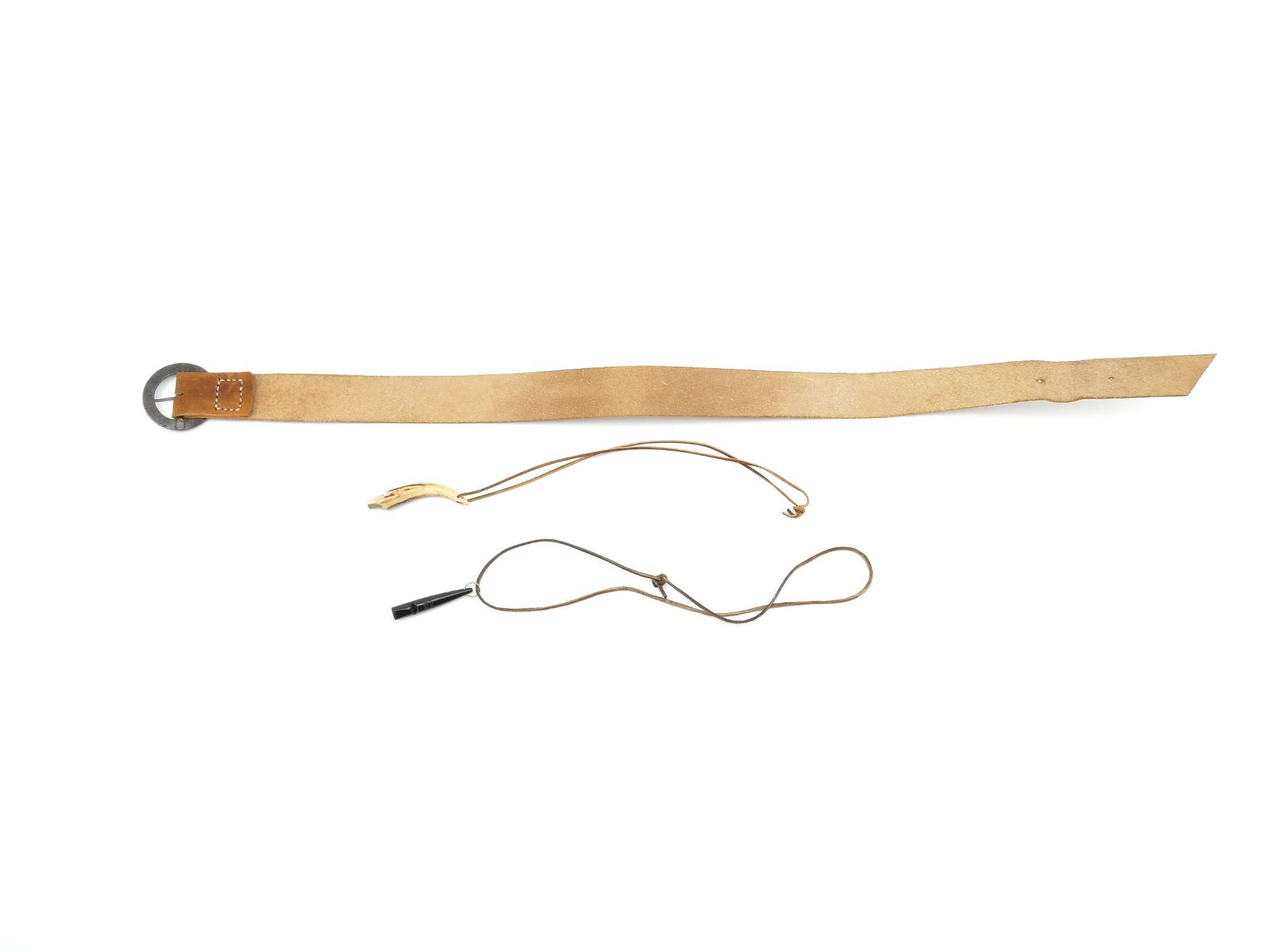 LOT INCLUDES; (1) UNKNOWN BROWN LEATHER BELT, BUCKLE MARKED "1 2 199 0 ISR", OVERALL LENGTH APPROX. 41.5", ADJUSTABLE & (2) FIELD DOG WHISTLES, ONE STAG HORN & ONE POLYMER CONSTRUCTION, WITH NECK LANYARDS. SEE PHOTOS.