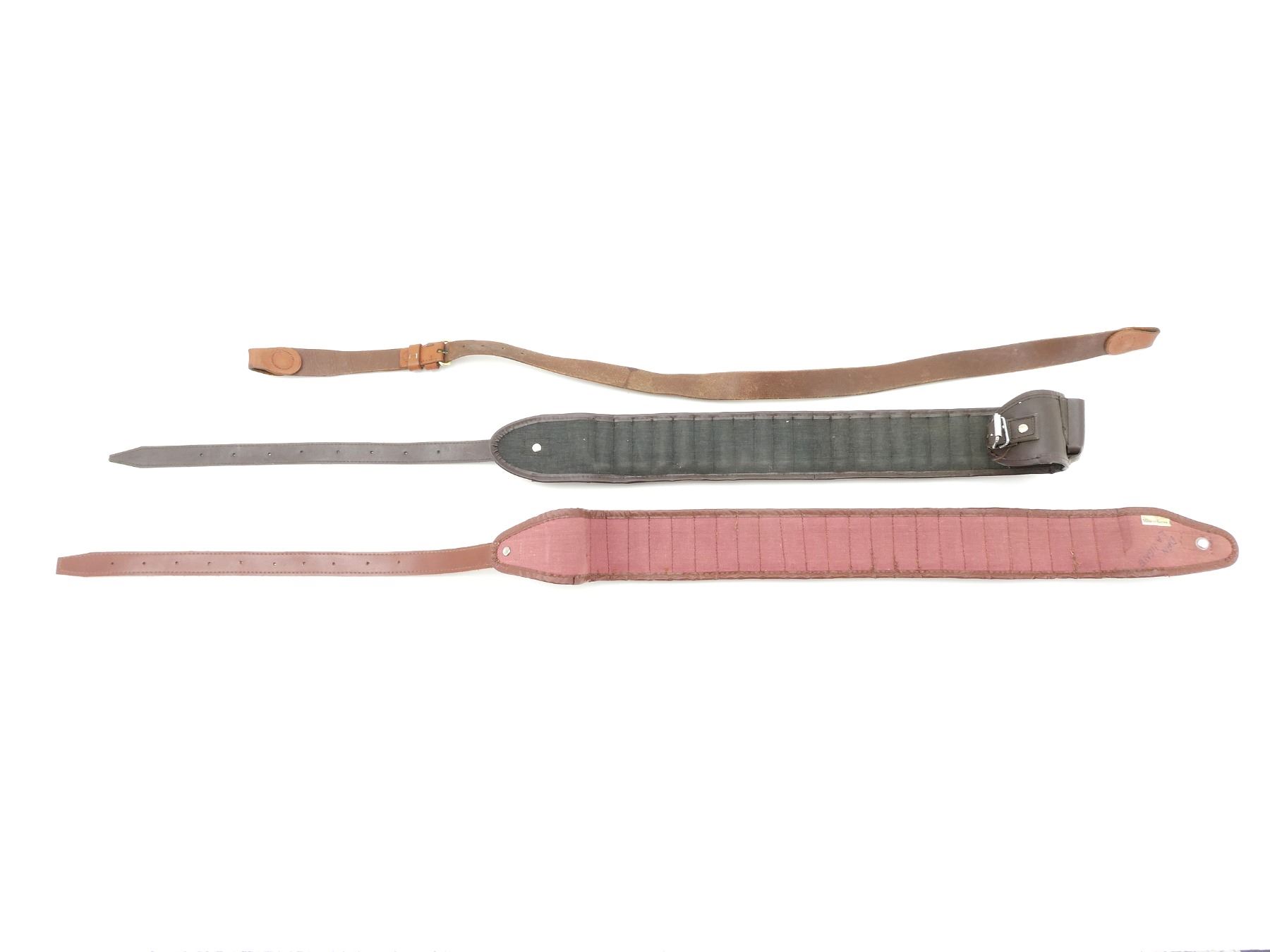 LOT INCLUDES; (2) ASSORTED BROWN LEATHER 12 GAUGE SHOT SHELL BELTS, VARIOUS MARKINGS, OVERALL LENGTH'S APPROX. 41" & 46" & (1) BROWN LEATHER RIFLE SLING, WITH BRASS FITTINGS, UNMARKED, OVERALL LENGTH APPROX. 39". SEE PHOTOS.