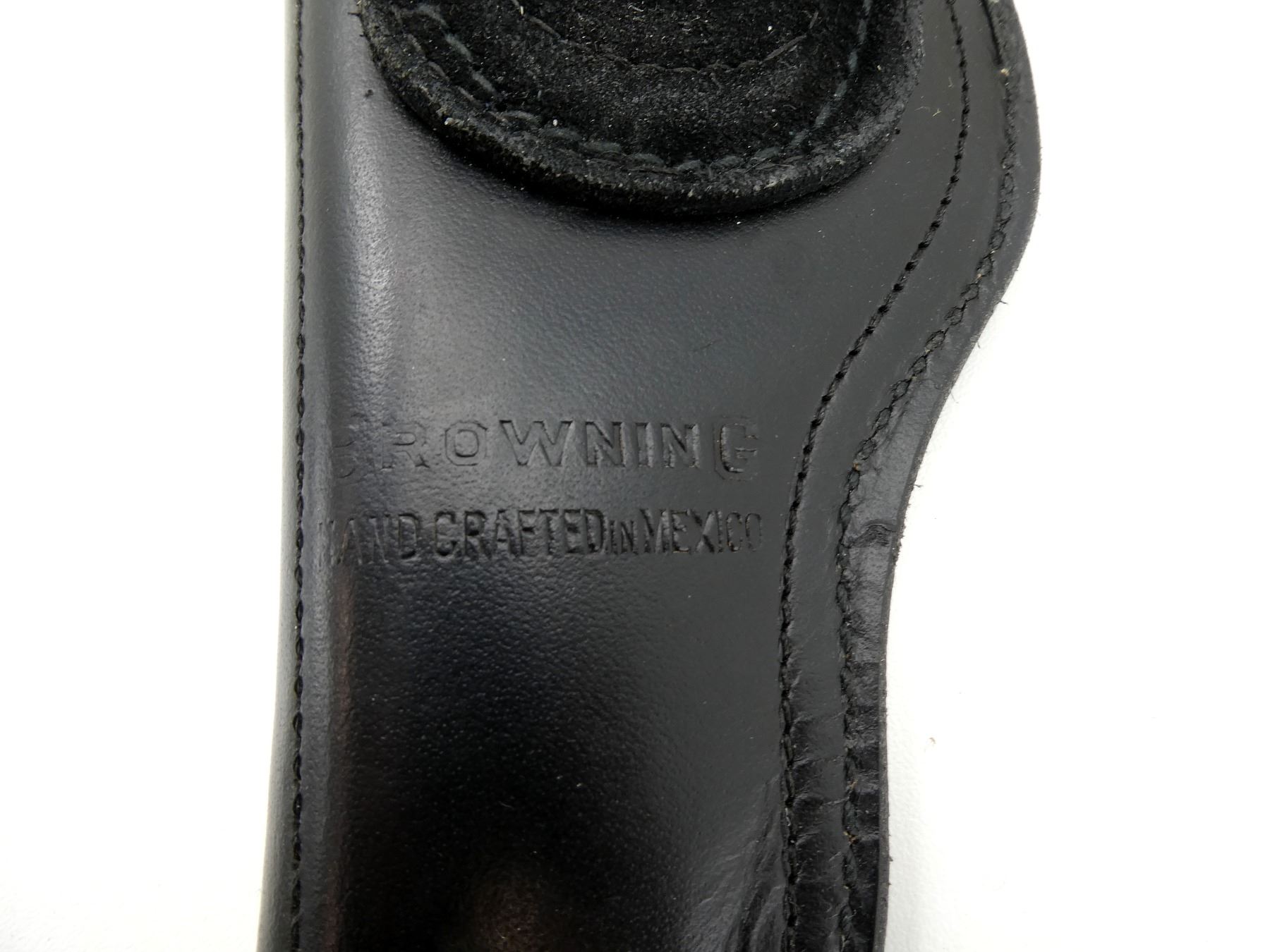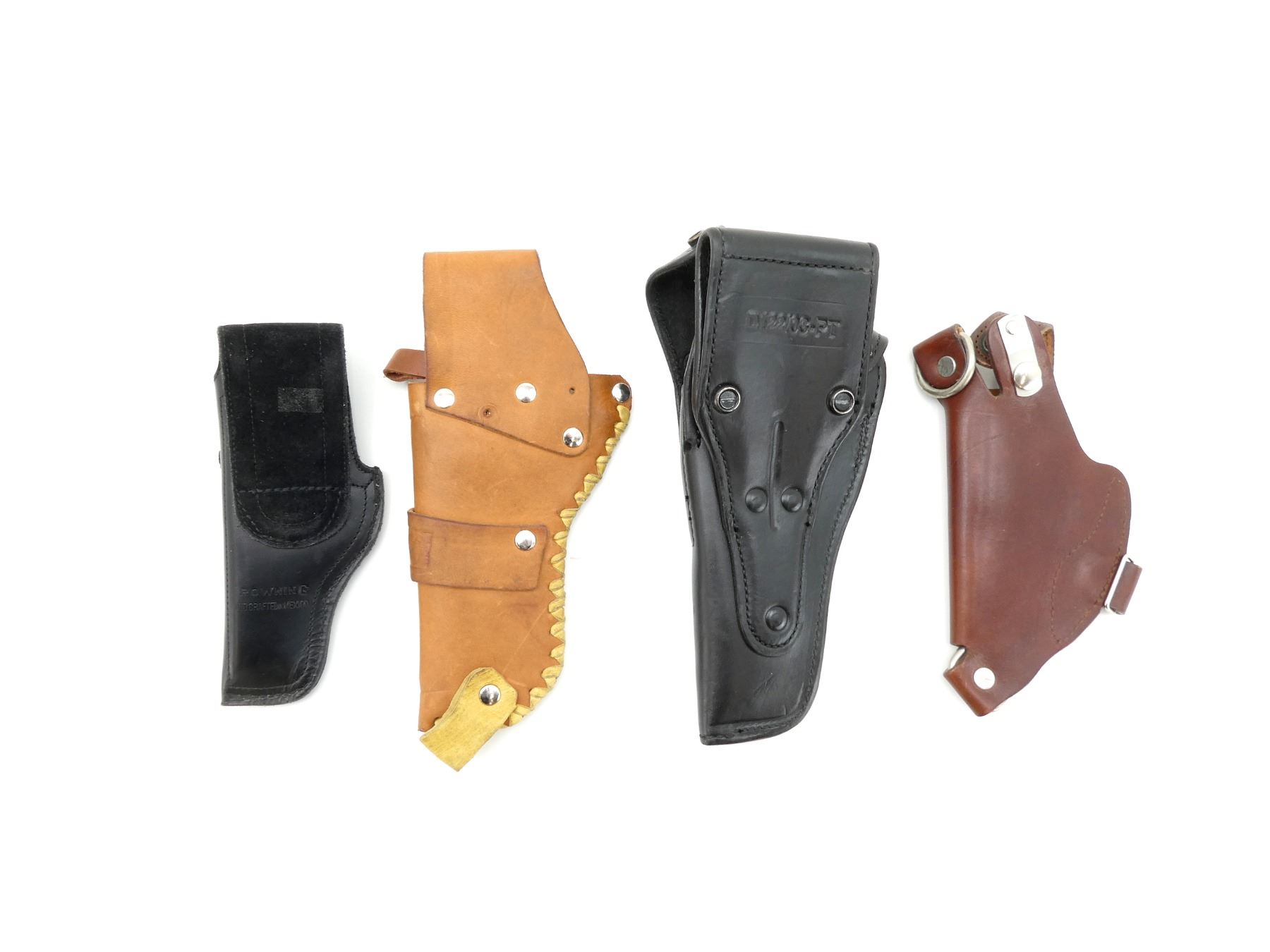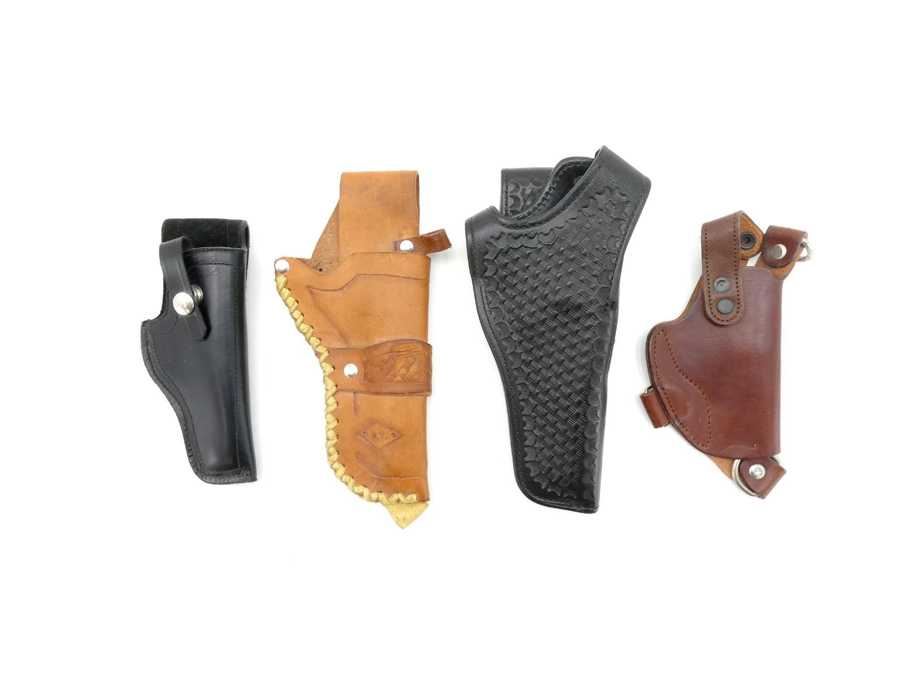 LOT INCLUDES; (4) ASSORTED RIGHT-HAND HOLSTER, BLACK / BROWN LEATHER, VARIOUS MARKINGS. SEE PHOTOS.