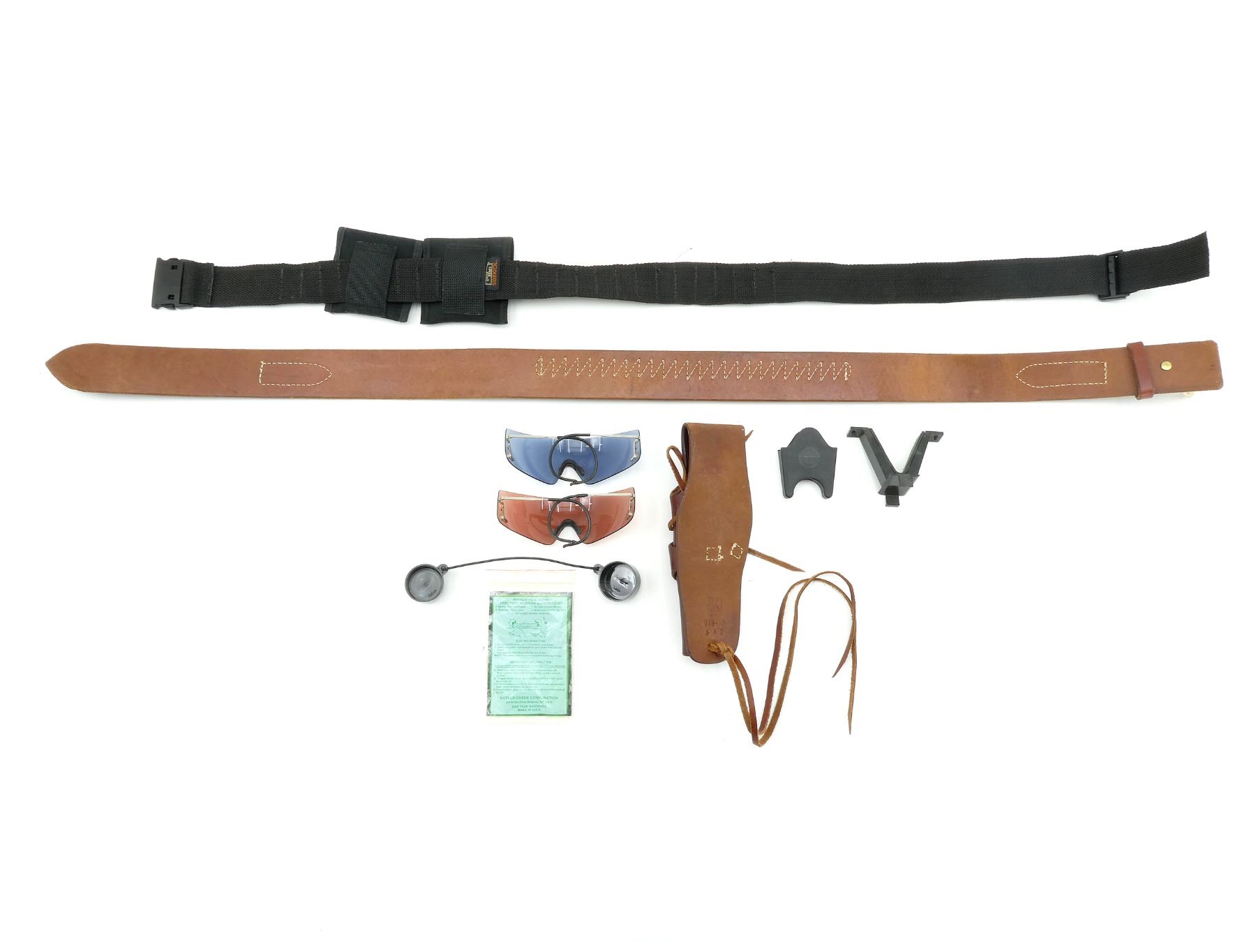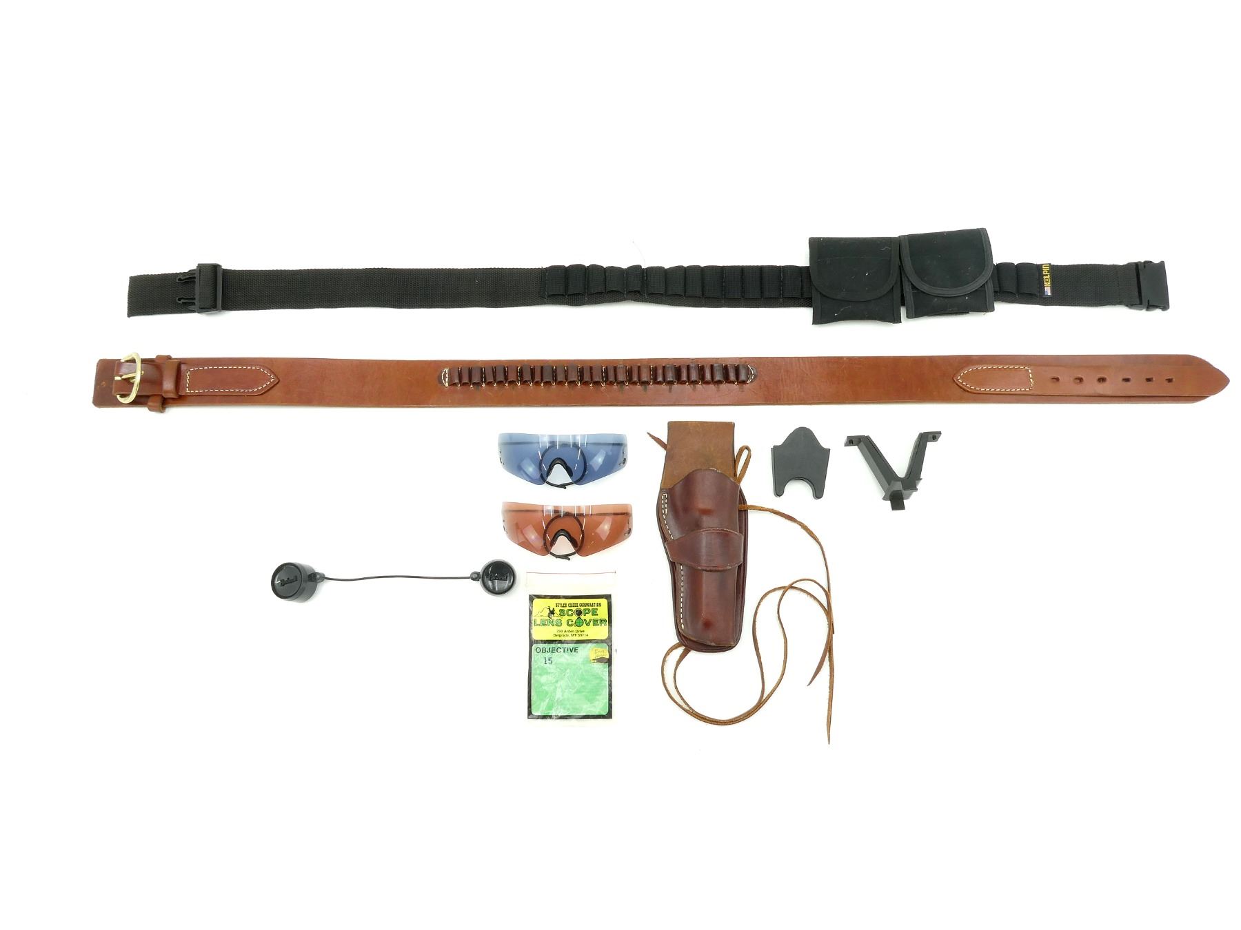 LOT INCLUDES; (1) TRIPLE K BRAND BROWN LEATHER AMMO BELT, FITS RIFLE CARTRIDGES, MARKED "740-XL", ETC., OVERALL LENGTH APPROX. 51.75", ADJUSTABLE, (1) UNCLE MIKE'S BLACK NYLON AMMO BELT, FITS SHOTGUN CARTRIDGES, OVERALL LENGTH APPROX. 48.25", ADJUSTABLE, (1) TRIPLE K BRAND BROWN LEATHER HOLSTER, FITS RH, MARKED "116-15", ETC., OVERALL LENGTH APPROX. 10.25", (2) SAFETY GLASSES & (1) PACK OF BUTLER CREEK SCOPE LENS COVERS, ETC. SEE PHOTOS.