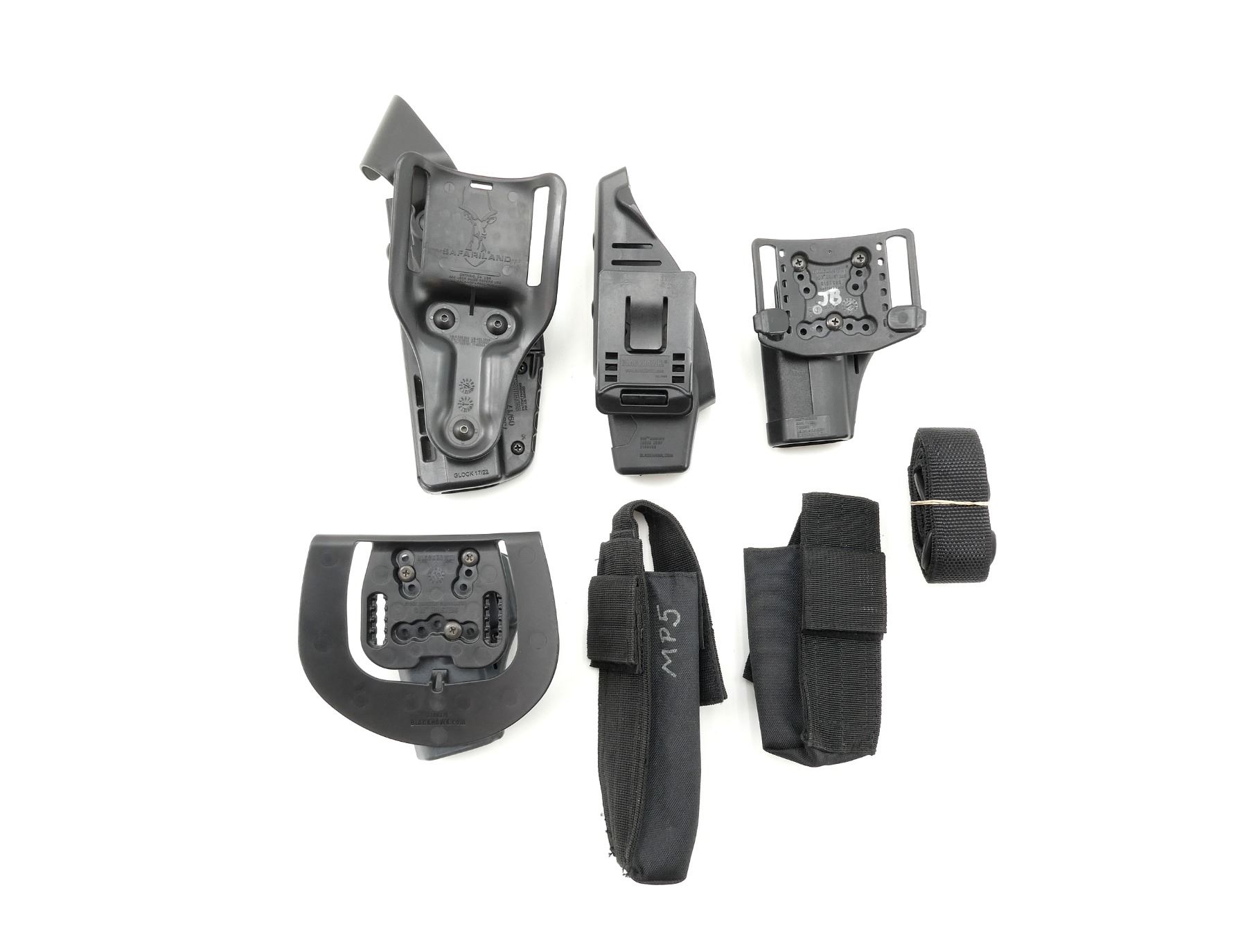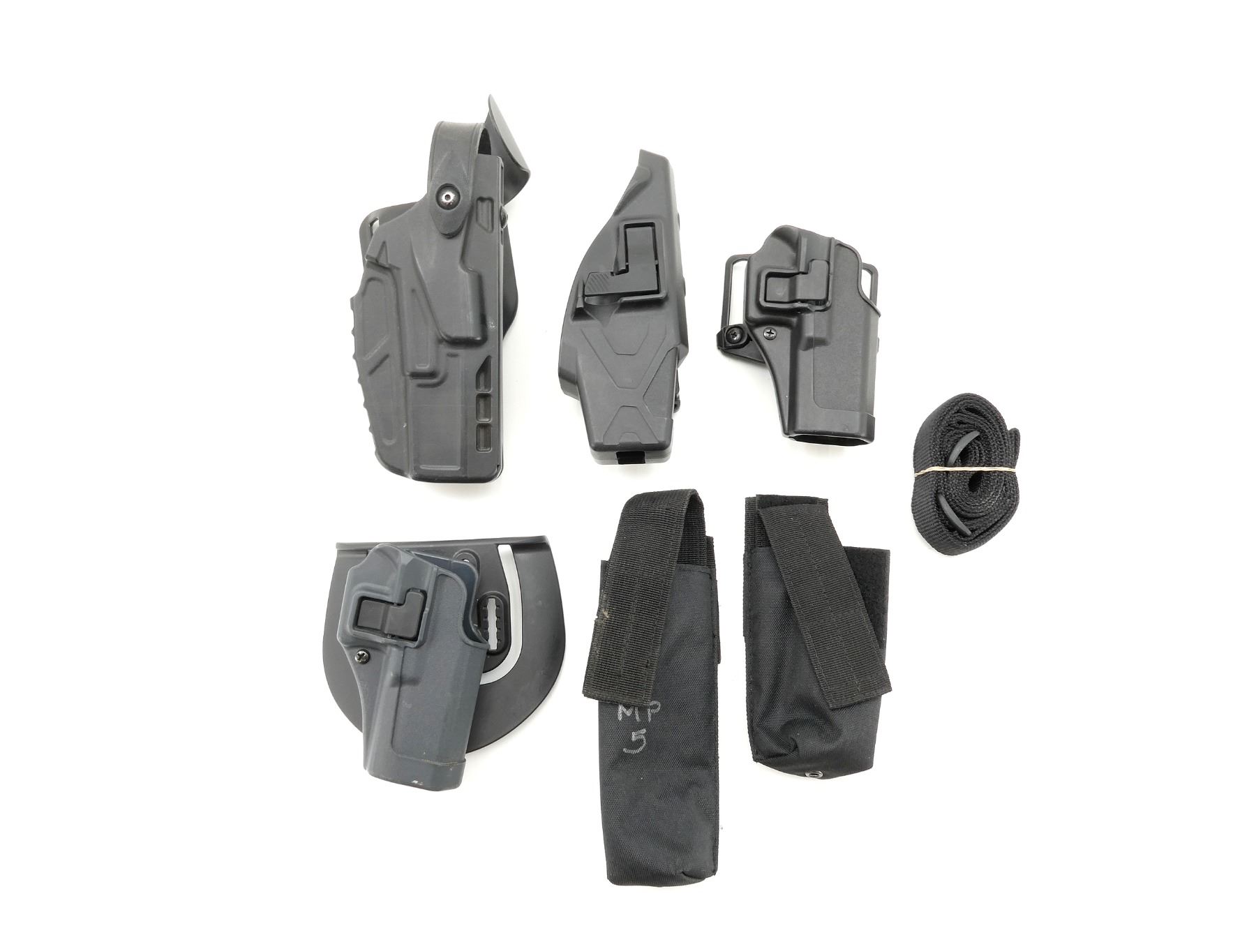 LOT INCLUDES; (1) SAFARILAND GLOCK 17/22 LEFT HAND HOLSTER, BLACK POLYMER CONSTRUCTION, (2) BLACKHAWK GLOCK 17/22 RIGHT HAND HOLSTERS, BLACK POLYMER CONSTRUCTION, (1) BLACKHAWK TASER HOLDER, BLACK POLYMER CONSTRUCTION, (2) ASSORTED BLACK NYLON MAG POUCHES, (1) BLACK NYLON RIFLE SLING, ETC. SEE PHOTOS.