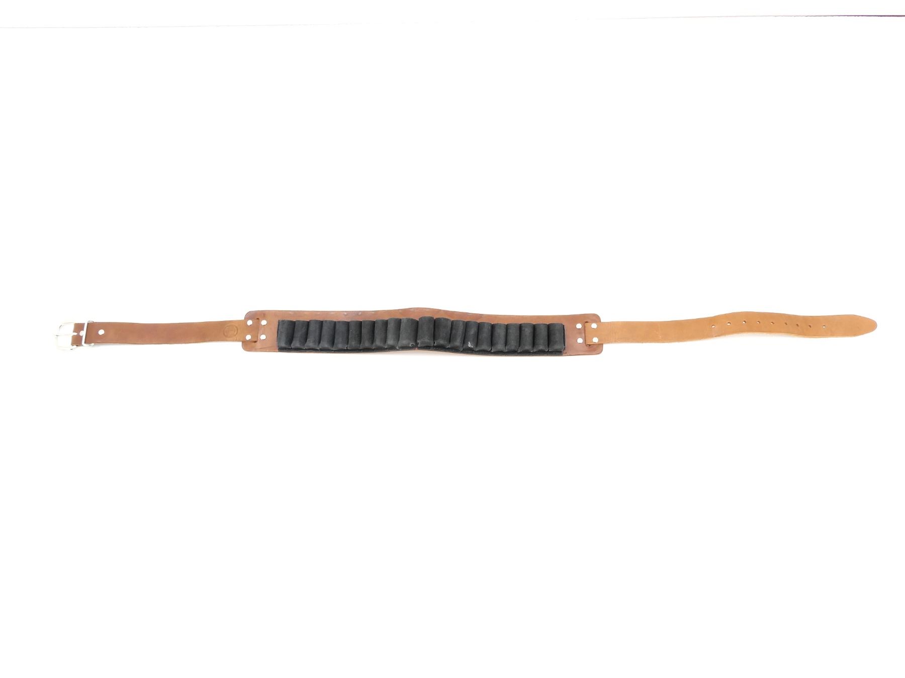 (1) BROWN LEATHER CONSTRUCTION, UNKNOWN MFG, UNMARKED, FITS SHOTGUN SHELLS, HOLDS 20 RNDS, OVERALL LENGTH APPROX. 54.5", ADJUSTABLE. SEE PHOTOS.