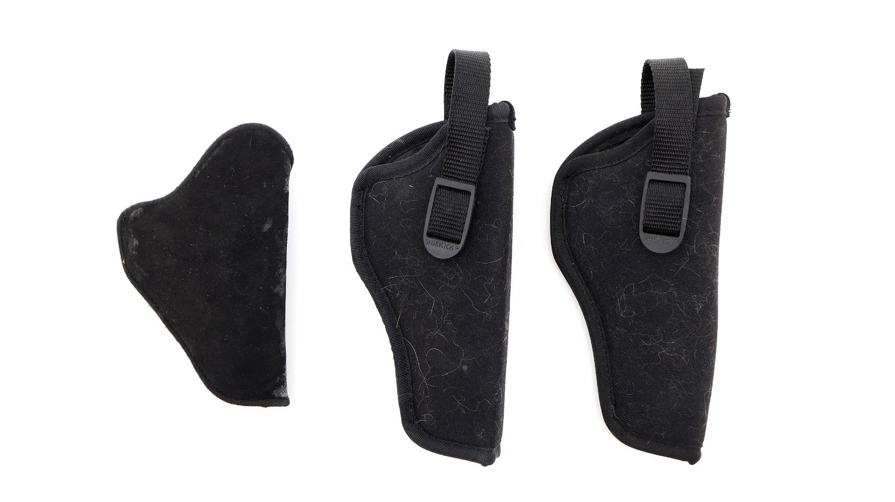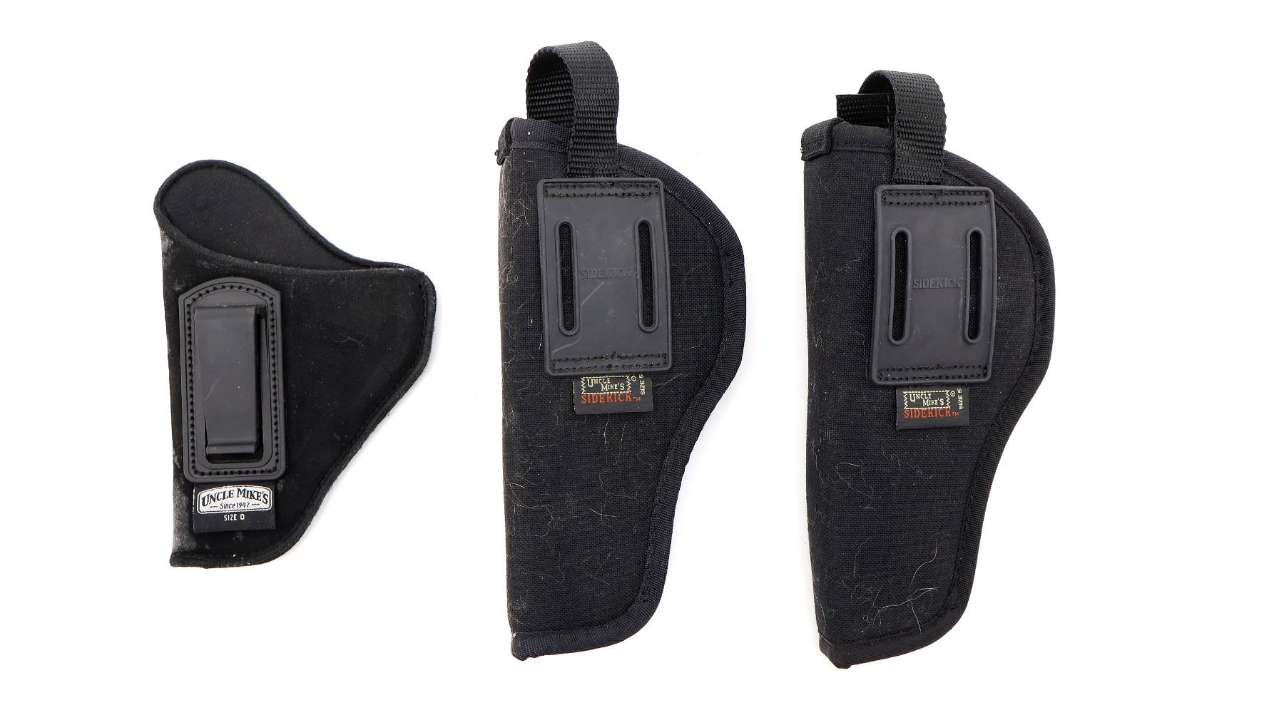 LOT INCLUDES; (2) UNCLE MIKE'S SIDEKICK HOLSTER, BLACK NYLON, FITS RH, SIZE 5, SHOWS WEAR & TEAR / USE MARKS, OVERALL LENGTH APPROX. 8.25" & (1) UNCLE MIKE'S HOLSTER, BLACK FOAM / SUEDE, FITS RH, SIZE 0, SHOWS WEAR & TEAR / USE MARKS, OVERALL LENGTH APPROX. 6.5". SEE PHOTOS.