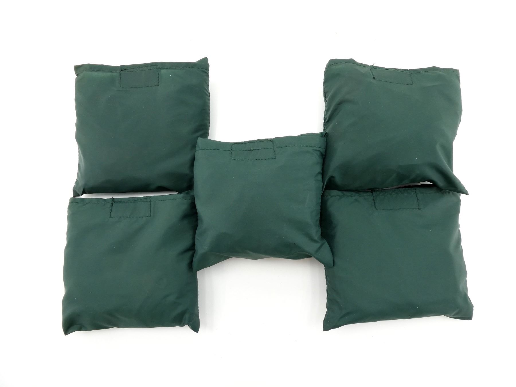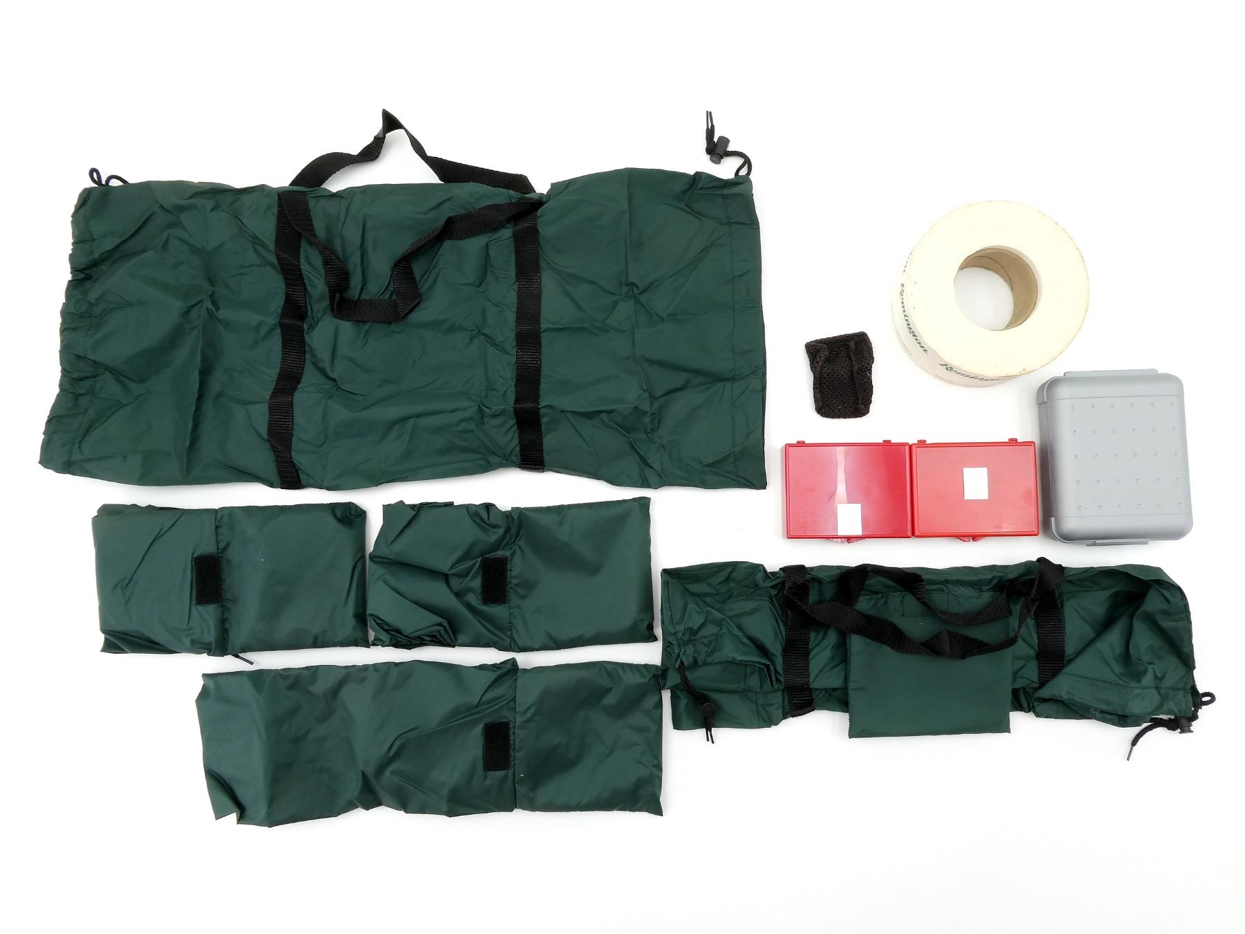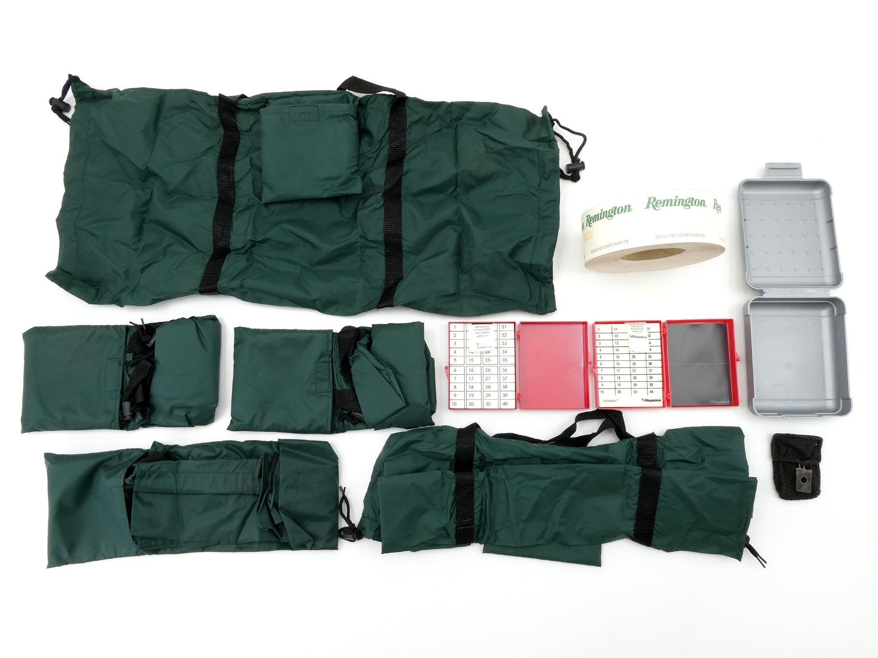 LOT INCLUDES; (5) ROLL-UP DUFFEL BAGS, WITH DRAW-STRING CLOSURE ON ENDS & CARRY HANDLE, OVERALL LENGTH APPROX. 29", (1) BRASS CATCHER & (1) ROLL OF REMINGTON STICKERS, ETC. SEE PHOTOS.