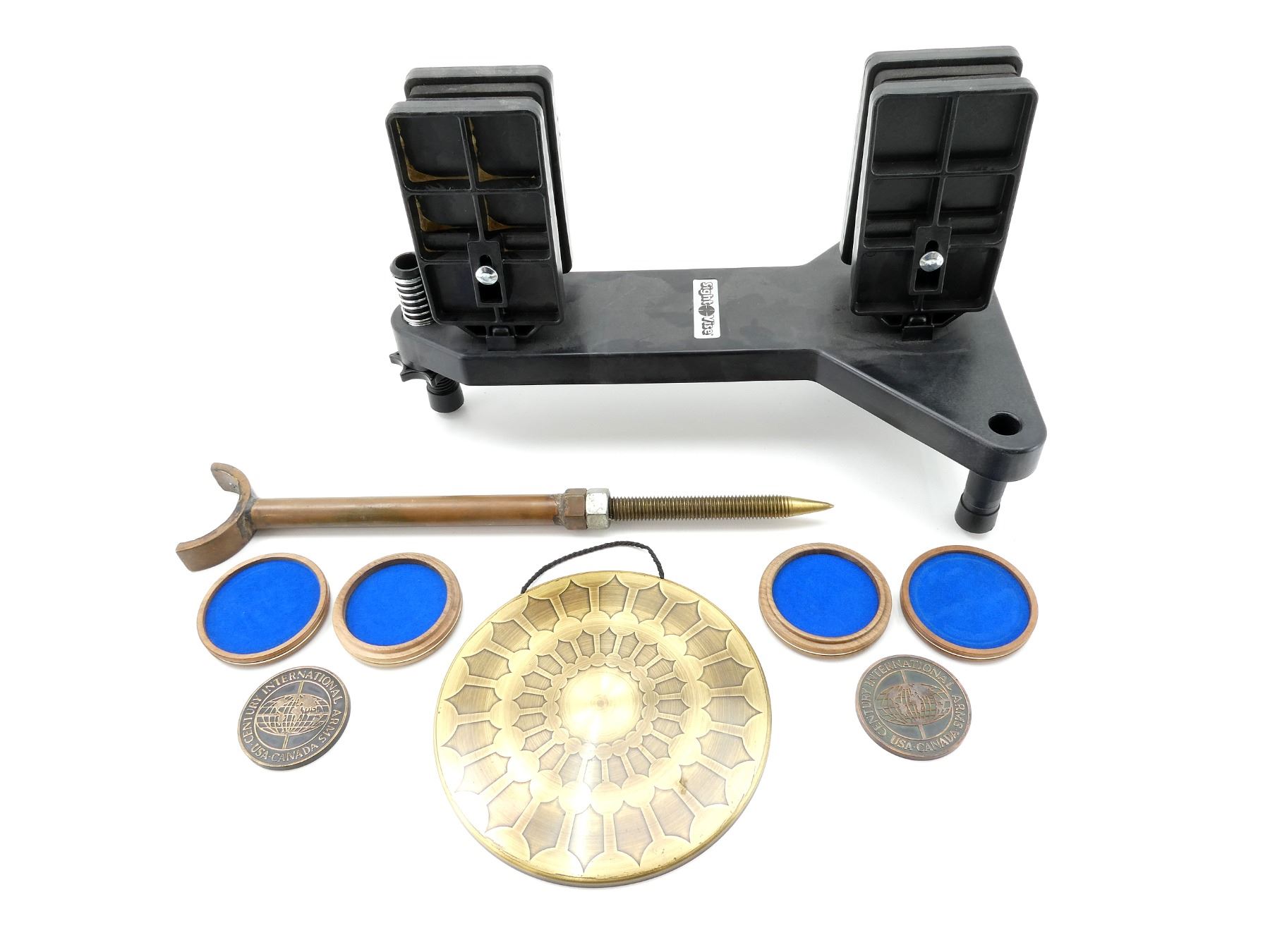 LOT INCLUDES; (1) SIGHT VISE RIFLE REST, POLYMER CONSTRUCTION, WITH FOAM RESTS & RUBBER FEET, WITH ADJUSTABLE HEIGHT, MAY REQUIRE ADJUSTMENTS / MAY NOT BE COMPLETE, OVERALL LENGTH APPROX. 15" X 9.75" X 9.25" & (2) CENTURY INTERNATIONAL ARMS USA-CANADA MEDALLIONS, ETC. SEE PHOTOS.