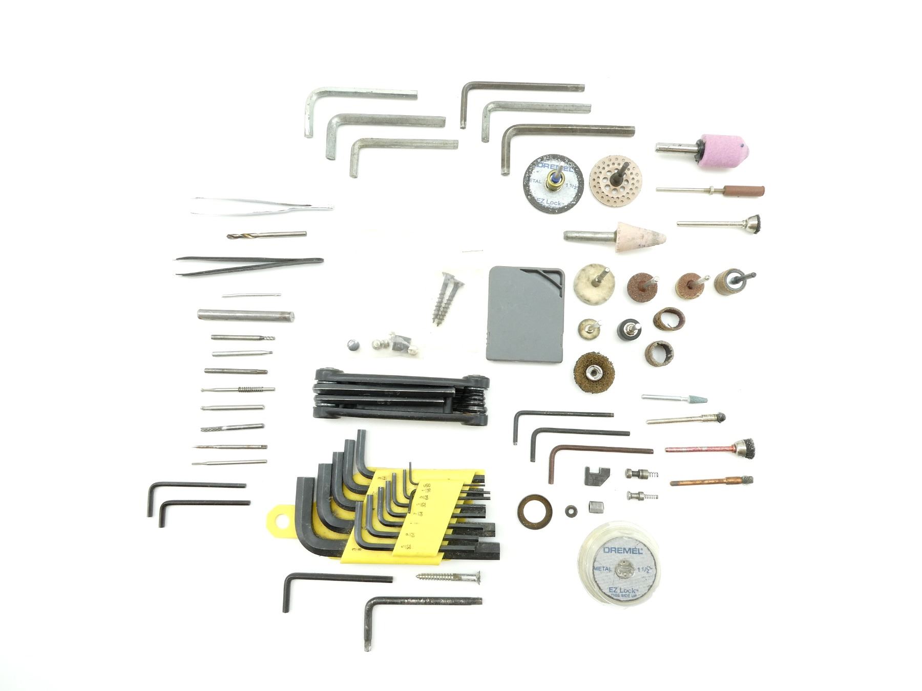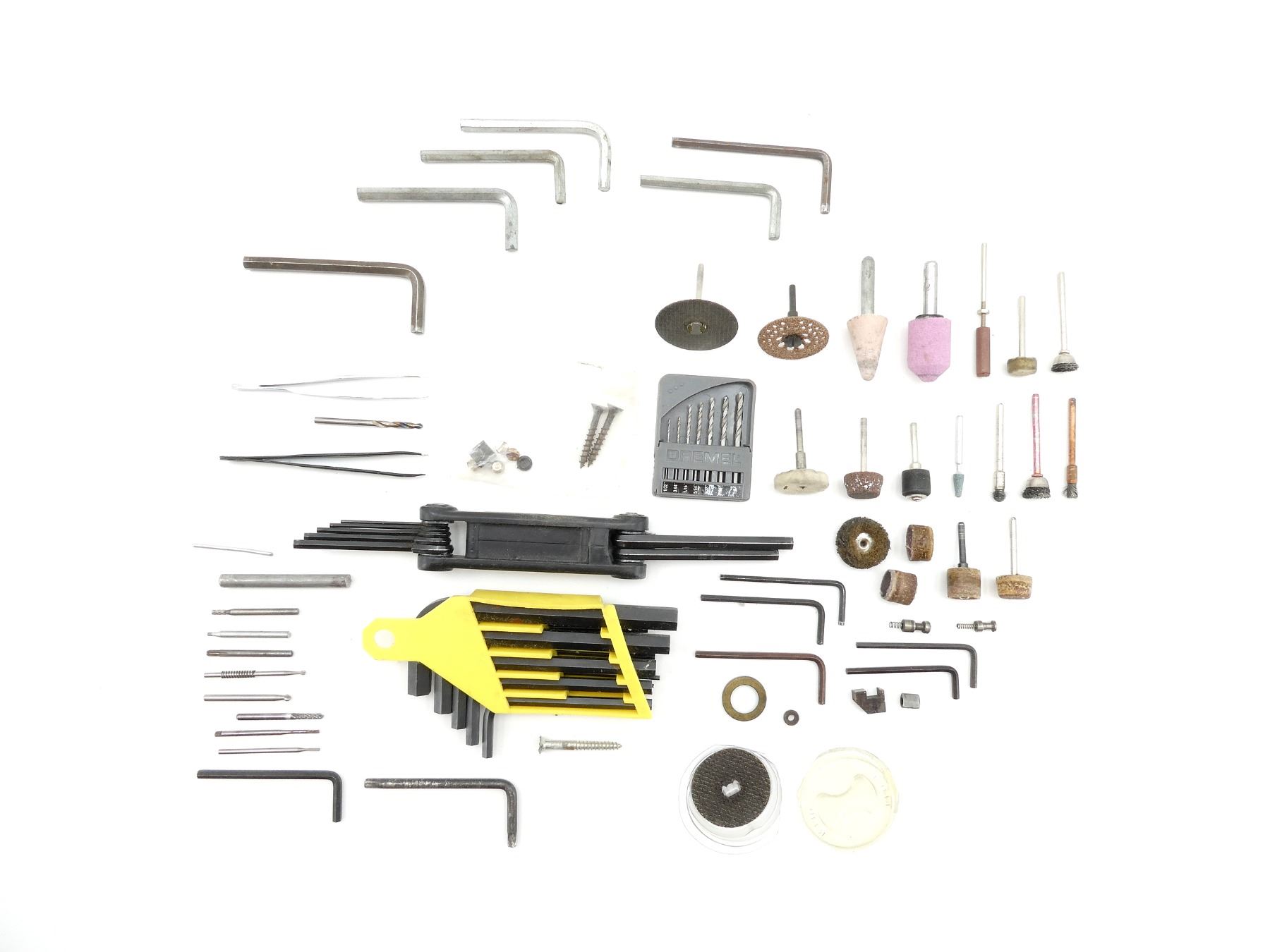 LOT INCLUDES; DREMEL ACCESSORIES, ALLEN KEYS, MULTI-TOOL HEX KEY SET, TWEEZERS, ETC. SEE PHOTOS.