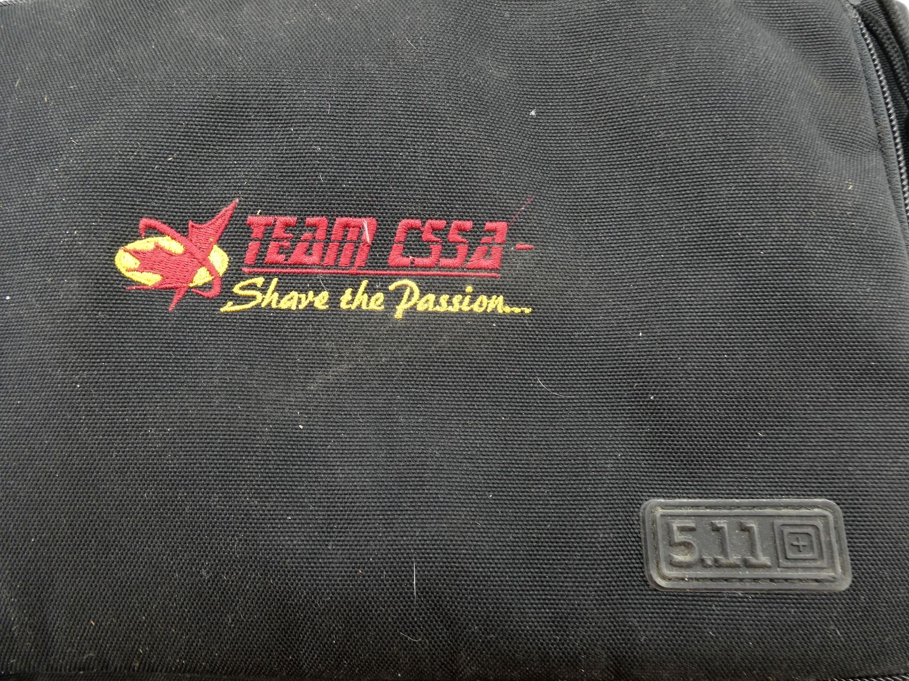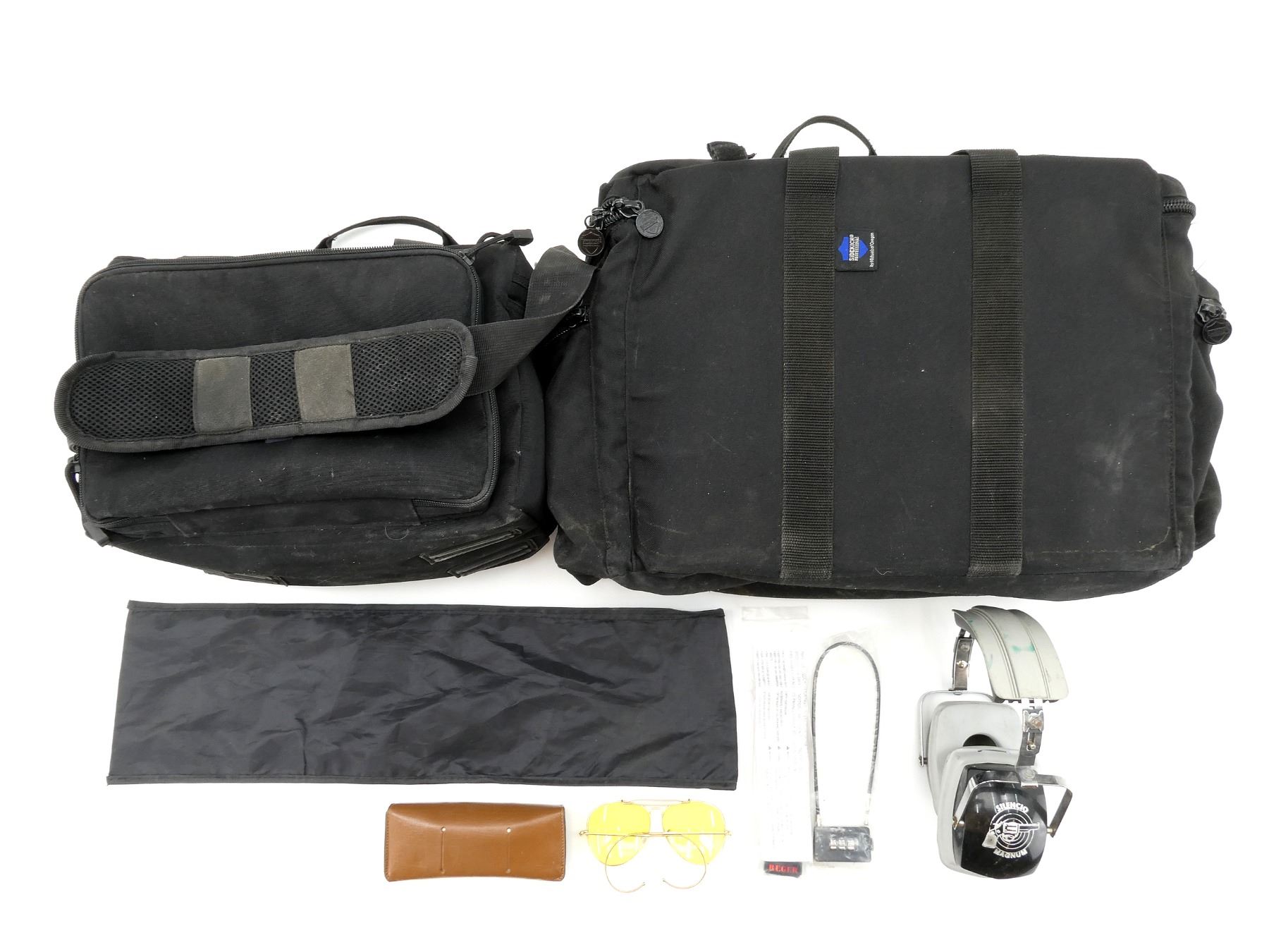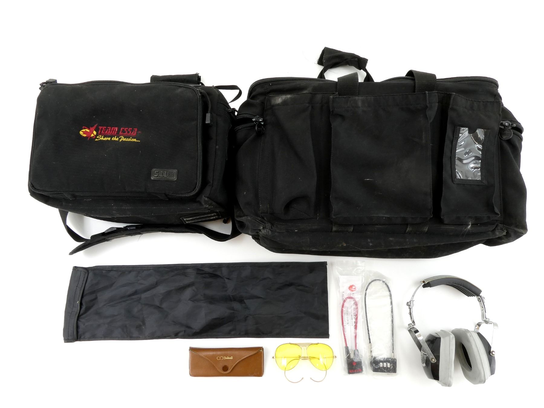 LOT INCLUDES; (1) SIDEKICK PROFESSIONAL DUFFEL BAG, BLACK NYLON, EXTERNAL POCKETS, WITH ZIPPER CLOSURE & CARRY HANDLES, OVERALL LENGTH APPROX. 19" X 8.5" X 12", (1) 5.11 TACTICAL CARRY BAG, BLACK NYLON, MARKED "TEAM CSSA - SHARE THE PASSION", EXTERNAL POCKETS, WITH ZIPPER CLOSURE & CARRY HANDLES, OVERALL LENGTH APPROX. 14" X 12" X 8.5", (1) PAIR OF SILENCIO MAGNUM HEARING PROTECTION, (1) PAIR OF BUSHNELL EYE PROTECTION LENSES & (2) CABLE LOCKS, 1 KEYED & 1 COMBINATION, APPEARS NEW OLD STOCK, ETC. SEE PHOTOS.