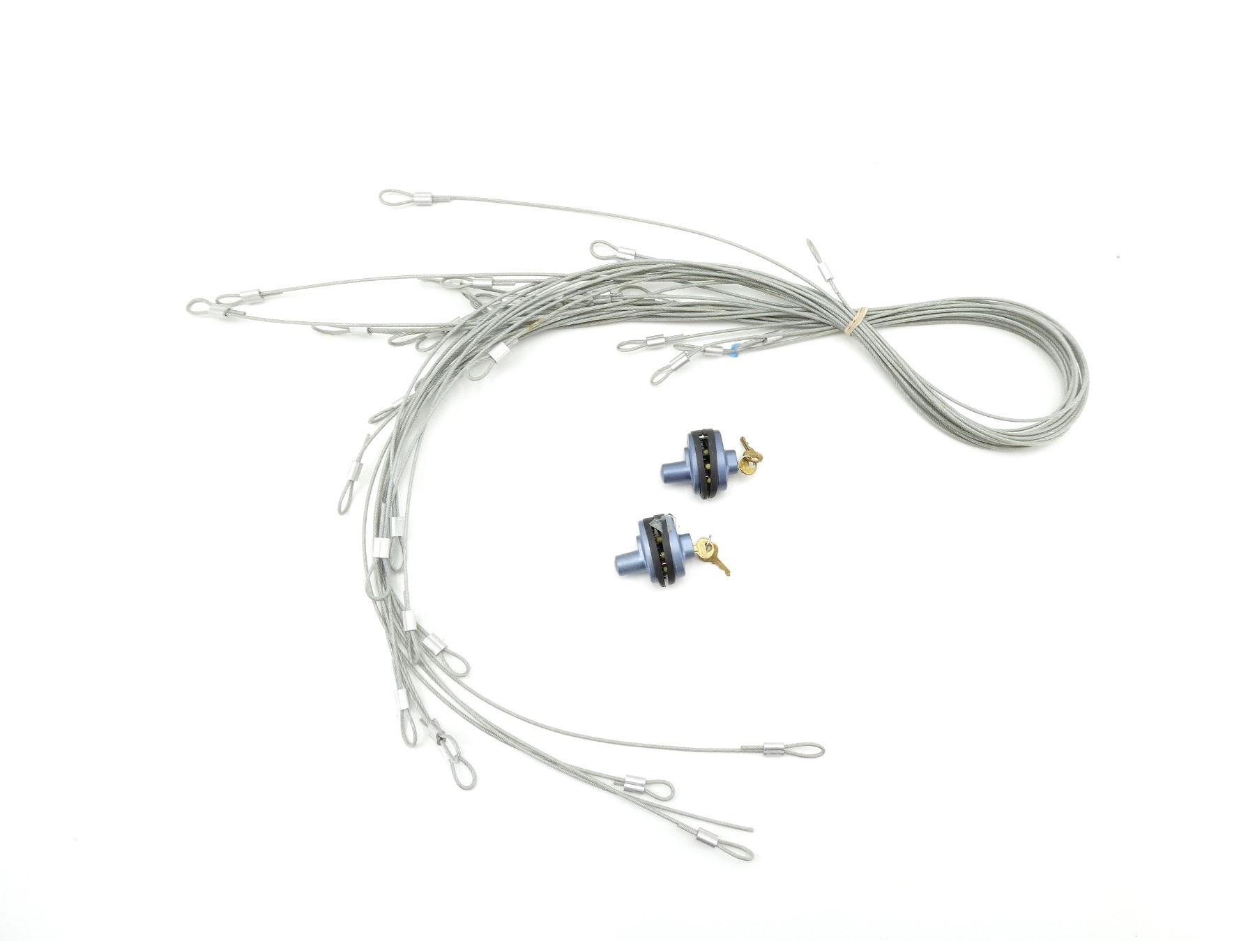 LOT INCLUDES; (2) BLUE MASTER KEYED TRIGGER LOCKS, WITH KEYS, FITS KEYS 250 & 670 & (17) CRIMPED GUN LOCKING CABLES, VARIOUS LENGTHS. SEE PHOTOS.