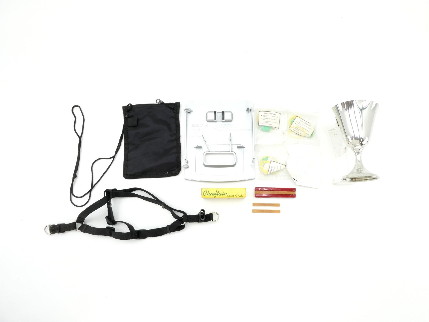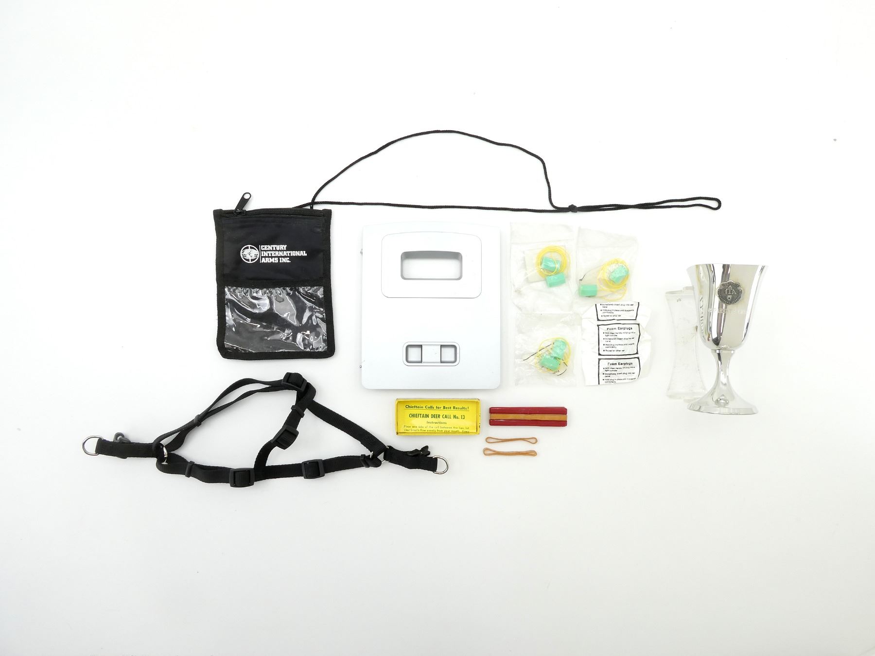 LOT INCLUDES; (1) CHIEFTAIN DEER CALL, NO. 13, APPEARS NEW OLD STOCK, IN ORIGINAL PACKAGING, (1) TRAP SHOOTERS ASSOCIATION GOBLET, MARKED "OS PARENT & CHILD", SHOWS WEAR & TEAR, (4) PACKS OF FOAM EARPLUGS, NEW OLD STOCK, SEALED IN ORIGINAL PACKAGING, (1) CENTURY INTERNATIONAL ARMS INC. RANGE CARD SACHET, ETC. SEE PHOTOS.