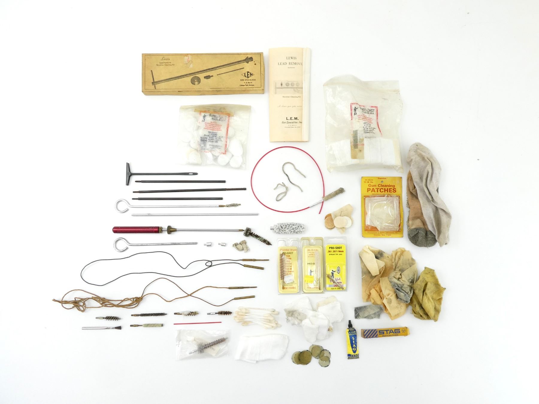 LOT INCLUDES; (7) ROD PIECES, (1) PRO-SHOT SPEAR TIP JAG, NEW OLD STOCK, IN ORIGINAL PACKAGING, (5) JAGS, (8) BRUSHES, (5) MOPS, (1) LEWIS LEAD REMOVER REVOLVER CLEANING KIT BOX WITH INSTRUCTIONS, MISSING CLEANING ITEMS, BOX MARKED "38-357" & ASSORTED CLEANING PATCHES, ETC. SEE PHOTOS.