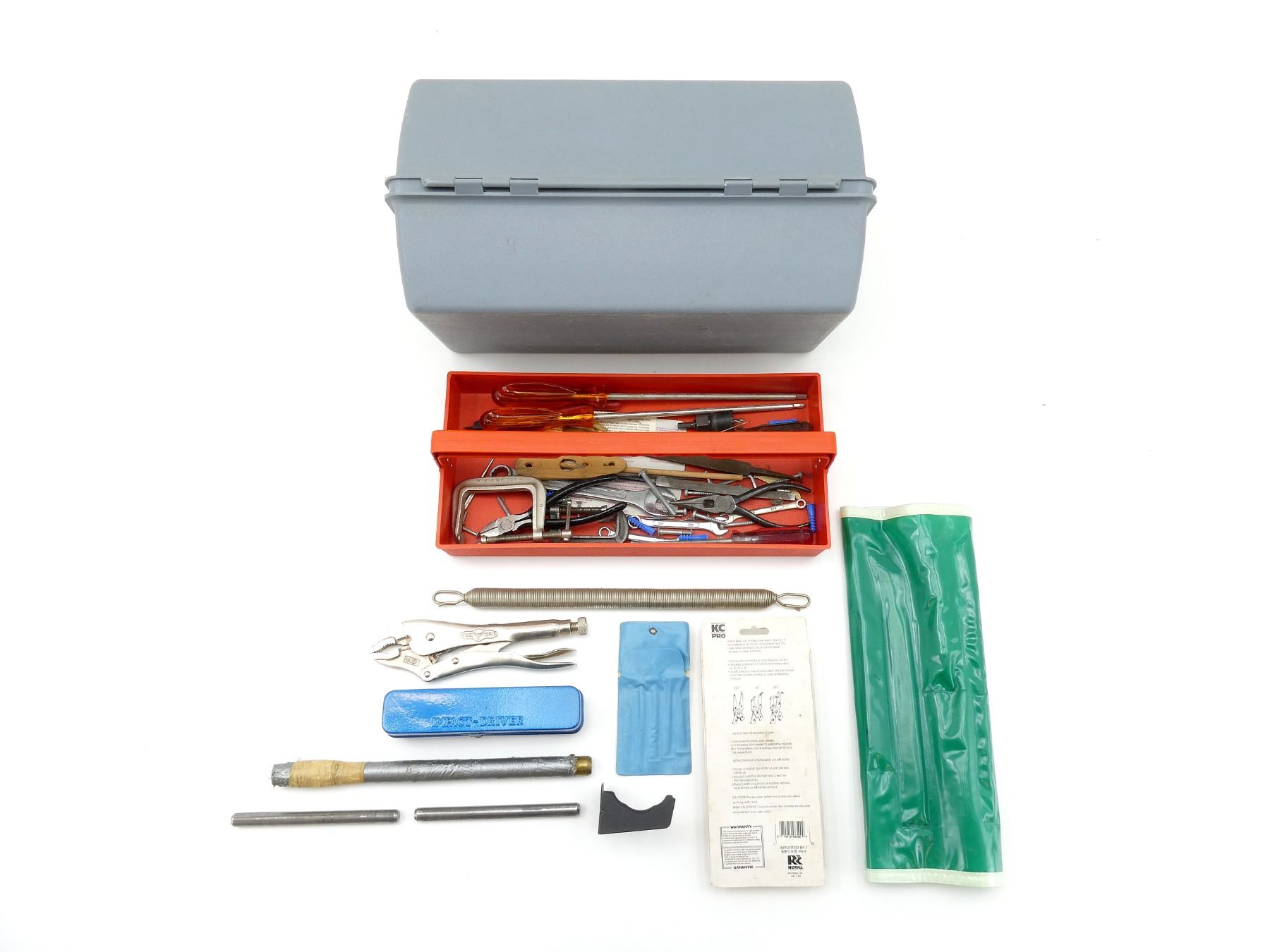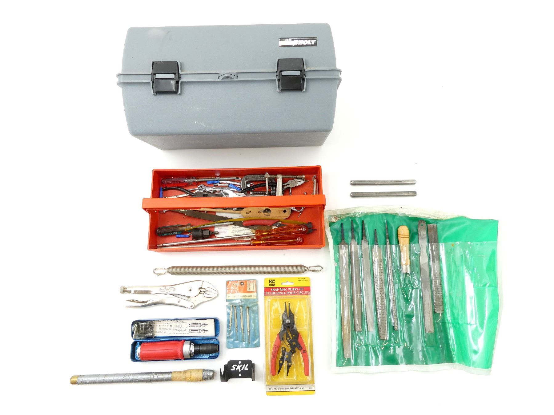 LOT INCLUDES; (1) HOLT GREY POLYMER TOOL BOX, WITH LIFT-OUT TRAY, LATCH CLOSURES & CARRY HANDLE, OVERALL LENGTH APPROX. 16 3/8" X 8" X 8.75", (1) ALLTRADE 12 PIECE FILE ASSORTMENT SET, MAY NOT BE COMPLETE / PIECES MAY BE MISSING, (1) KC PRO SNAP RING PLIERS SET, APPEARS NEW OLD STOCK, IN ORIGINAL PACKAGING, (1) PETERSEN VISE GRIP, (1) 5 PIECE JEWELER'S SCREWDRIVER SET, MAY NOT BE COMPLETE / PIECES MAY BE MISSING, (4) SCREWDRIVERS & (1) IMPACT DRIVER, ETC. SEE PHOTOS.