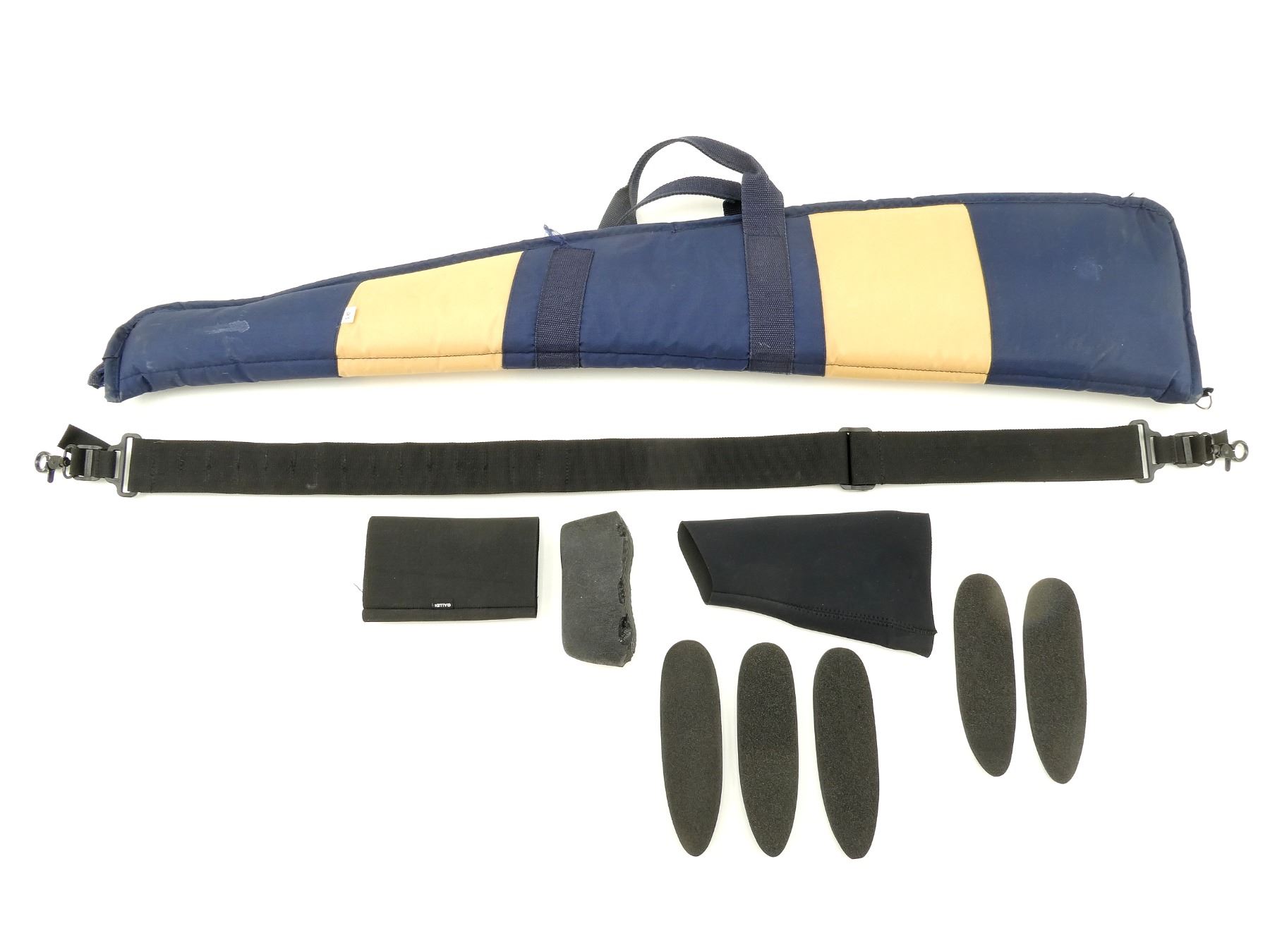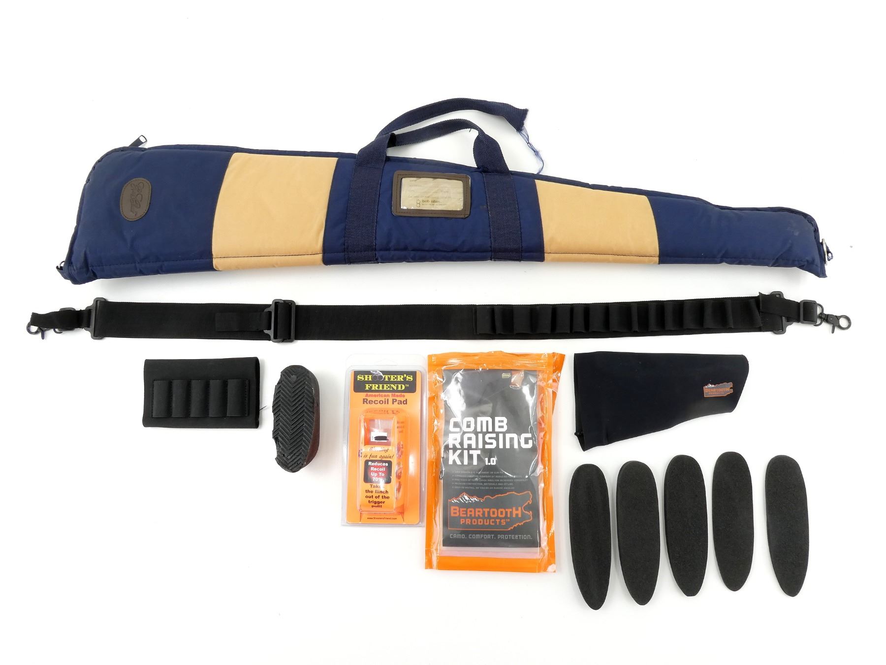 LOT INCLUDES; (1) BOB ALLEN GUN CLUB RIFLE CASE, SOFT PADDED, ZIPPER CLOSURE WITH CARRY HANDLES, SHOWS WEAR & TEAR / USE MARKS, OVERALL LENGTH APPROX. 39", (1) SHOOTER'S FRIEND AMERICAN MADE RECOIL PAD, SHOWS WEAR & TEAR / USE MARKS, IN ORIGINAL PACKAGING, (1) BEARTOOTH PRODUCTS COMB RAISING KIT 1.0, MAY NOT BE COMPLETE / PIECES MAY BE MISSING, IN ORIGINAL PACKAGING & (1) BLACK NYLON SLING, HOLDS SHOTGUN CARTRIDGES, OVERALL LENGTH APPROX. 45", ETC. SEE PHOTOS.