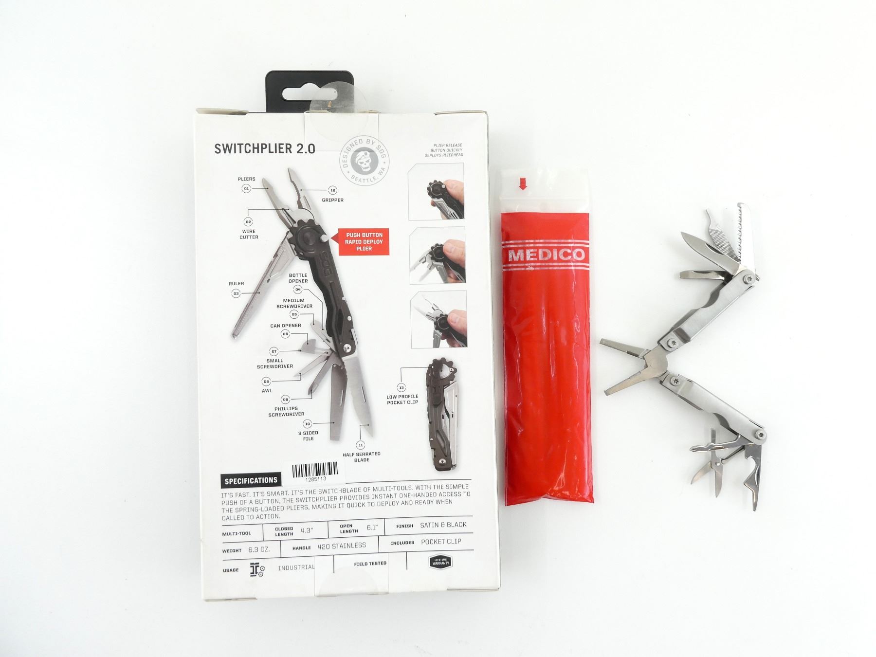 LOT INCLUDES; (1) SOG MULTI-TOOL SWITCHPLIER 2.0, 12 TOOLS COMBINED, ONE-HANDED PLIER ACCESS, INCLUDES; PLIERS, WIRE CUTTER, RULER, BOTTLE OPENER, SCREWDRIVERS, FILE, SERRATED BLADE, ETC., NEW OLD STOCK, IN ORIGINAL PACKAGING & (1) HURRICANE MINI POCKET MULTI-TOOL SWITCHPLIER, INCLUDES; PLIERS, SCREWDRIVER, SCISSORS, RULER, FILE, BLADES, ETC. SEE PHOTOS.